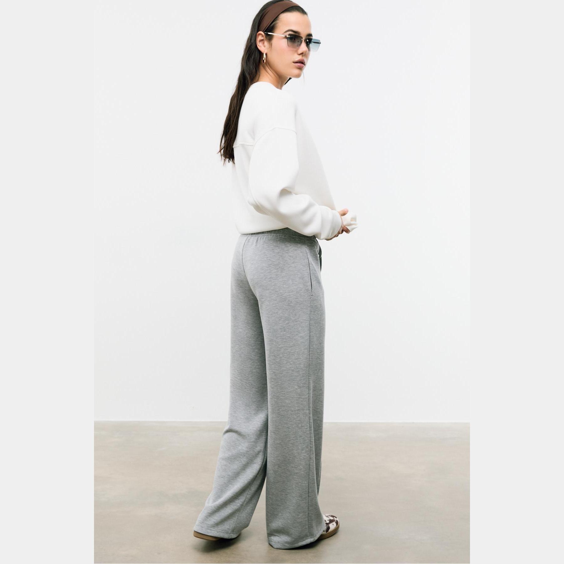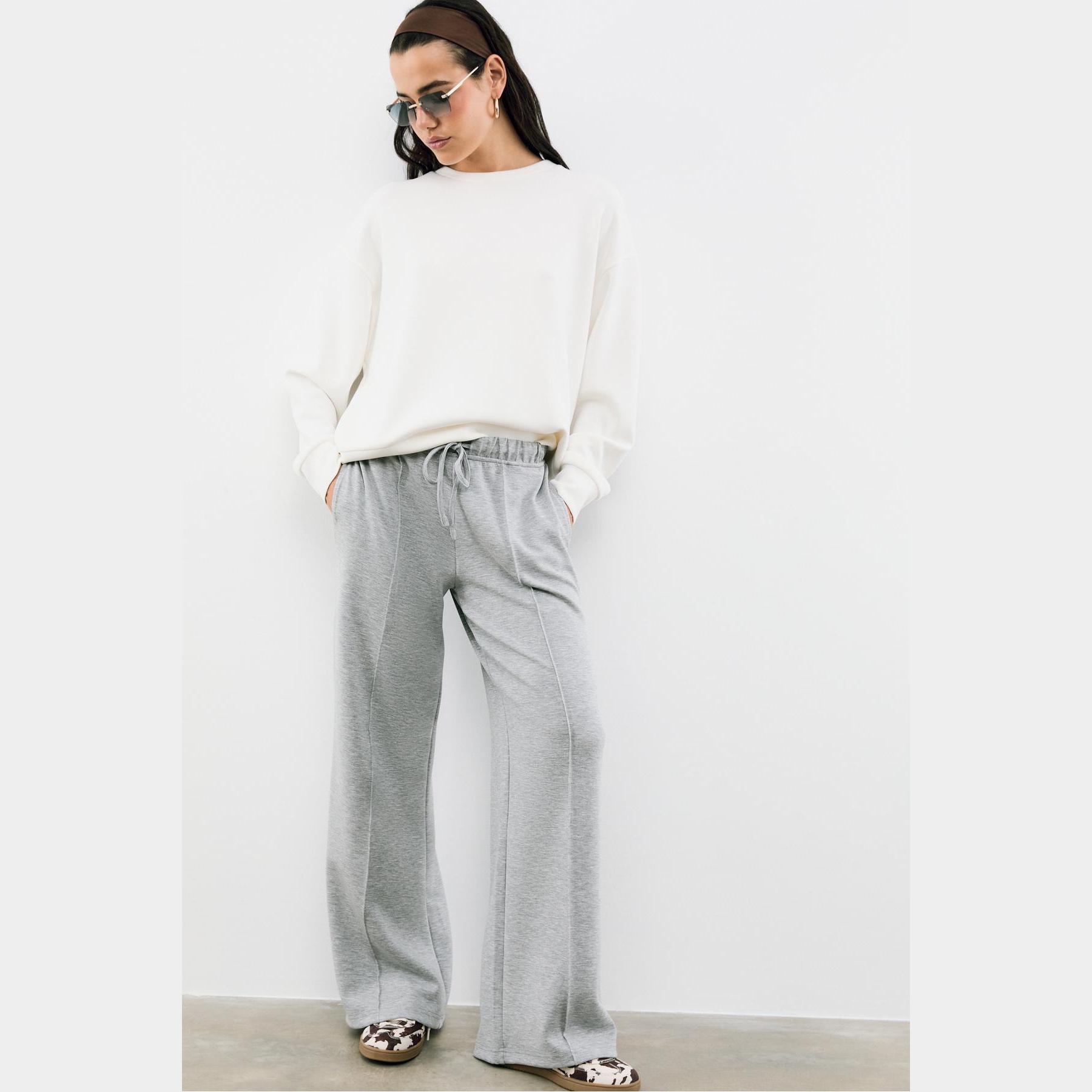 بنطال عملي من Stradivarius بلون رمادي فاتح، مصنوع من خامة ناعمة بتركيبة 49% مودال، 41% بوليستر، 10% إيلاستان، يتميز بقصة واسعة، خصر متوسط بخصر مطاطي ورباط داخلي قابل للتعديل بنفس اللون، أرجل طويلة وفضفاضة، تصميم سادة مع كسرات (نيرفور) أمامية تضيف لمسة تصميمية، مزود بجيبين جانبيين، بدون بطانة، ملمس داخلي ناعم، مثالي للتنسيق مع كنزة محبوكة أو تيشيرت لإطلالة كاجوال ناعمة.