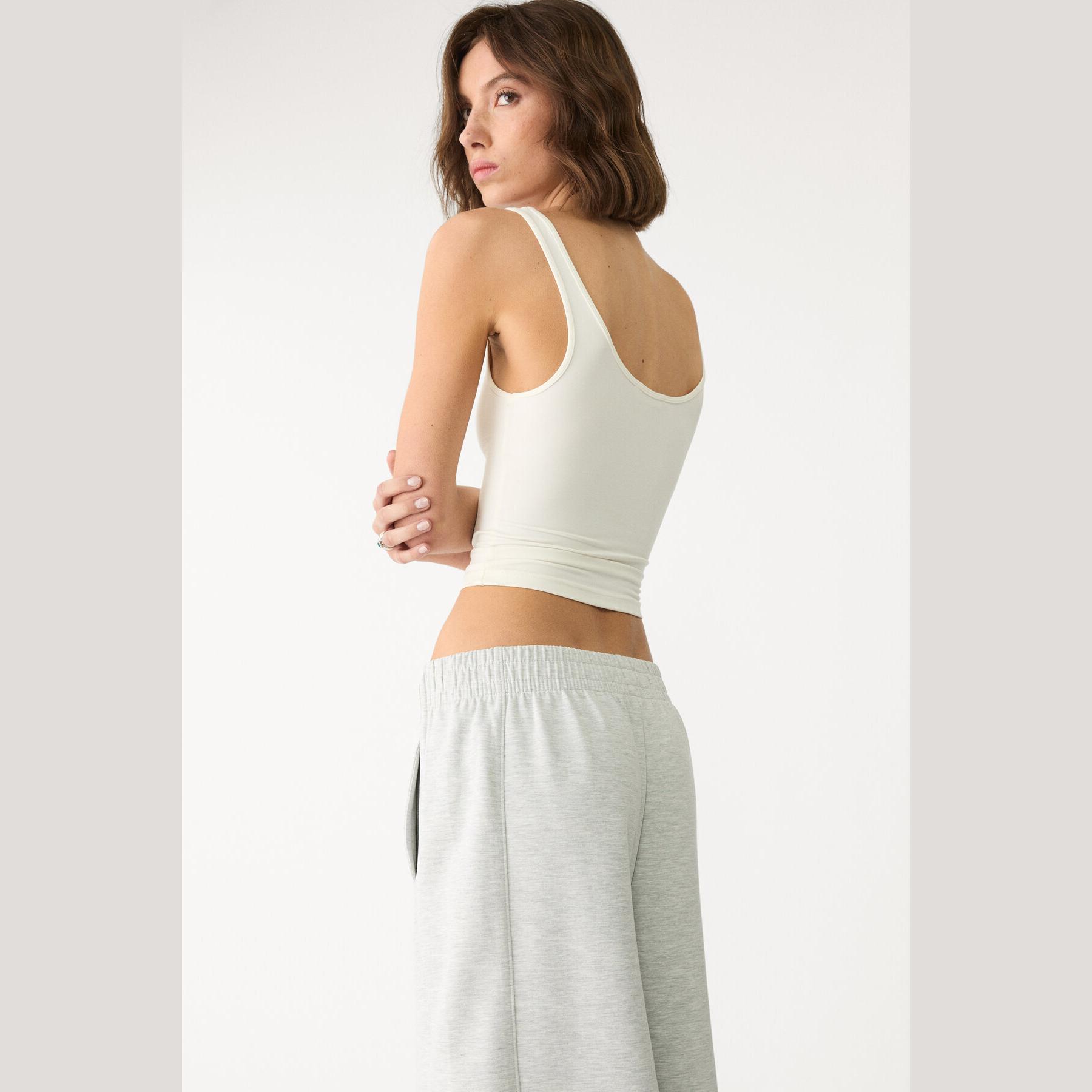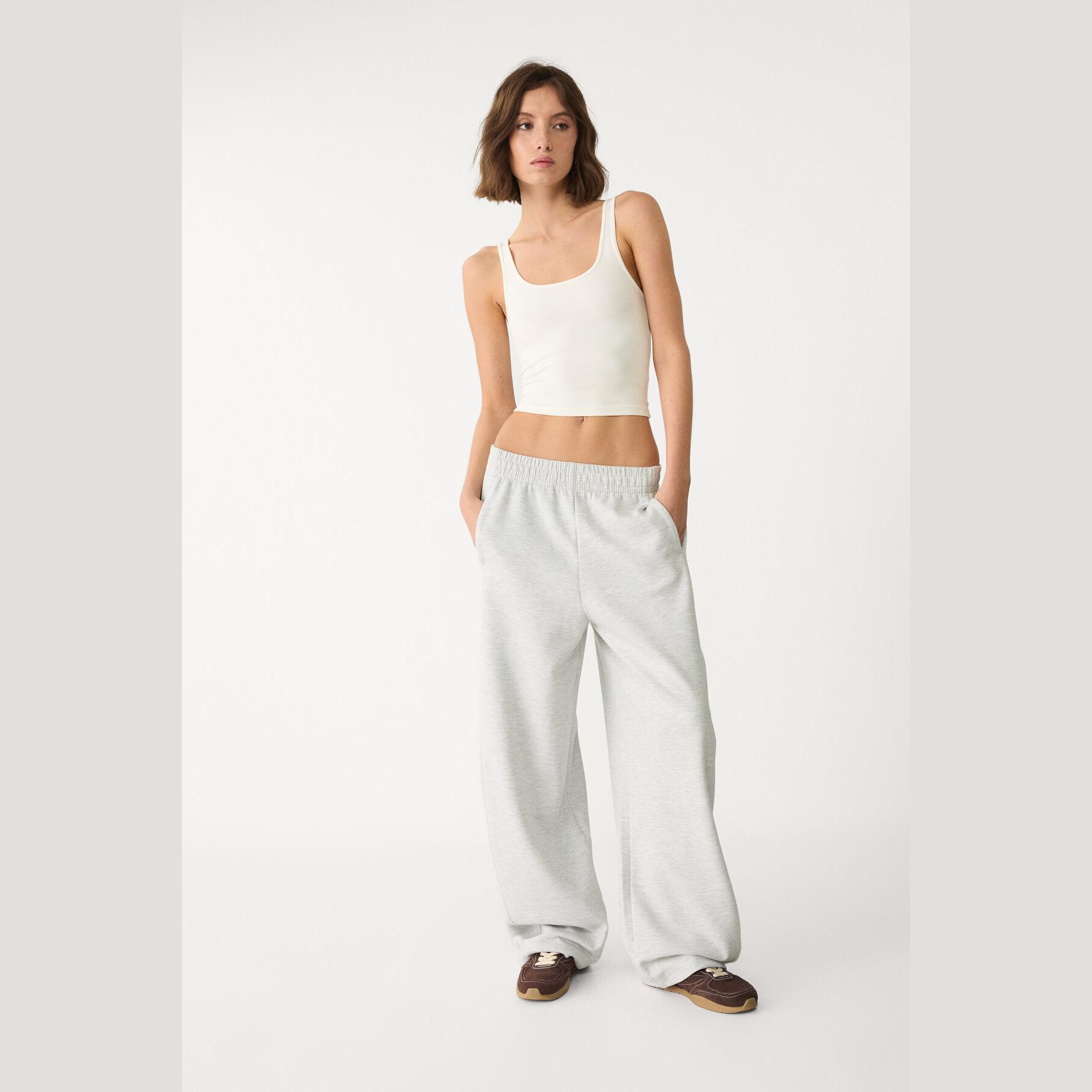 بنطال عملي من Stradivarius بلون رمادي فاتح، مصنوع من خامة قطنية مرنة بتركيبة 50% قطن، 45% بوليستر، 5% إيلاستان، يتميز بقصة Barrel Fit الواسعة، خصر عادي بدون حزام، إغلاق أمامي بسحاب وزر، مزود بجيبين جانبيين، تصميم سادة بملمس مغسول، بدون بطانة، ملمس داخلي ناعم، مثالي للتنسيق مع تيشيرت أو كنزة لإطلالة كاجوال مريحة.