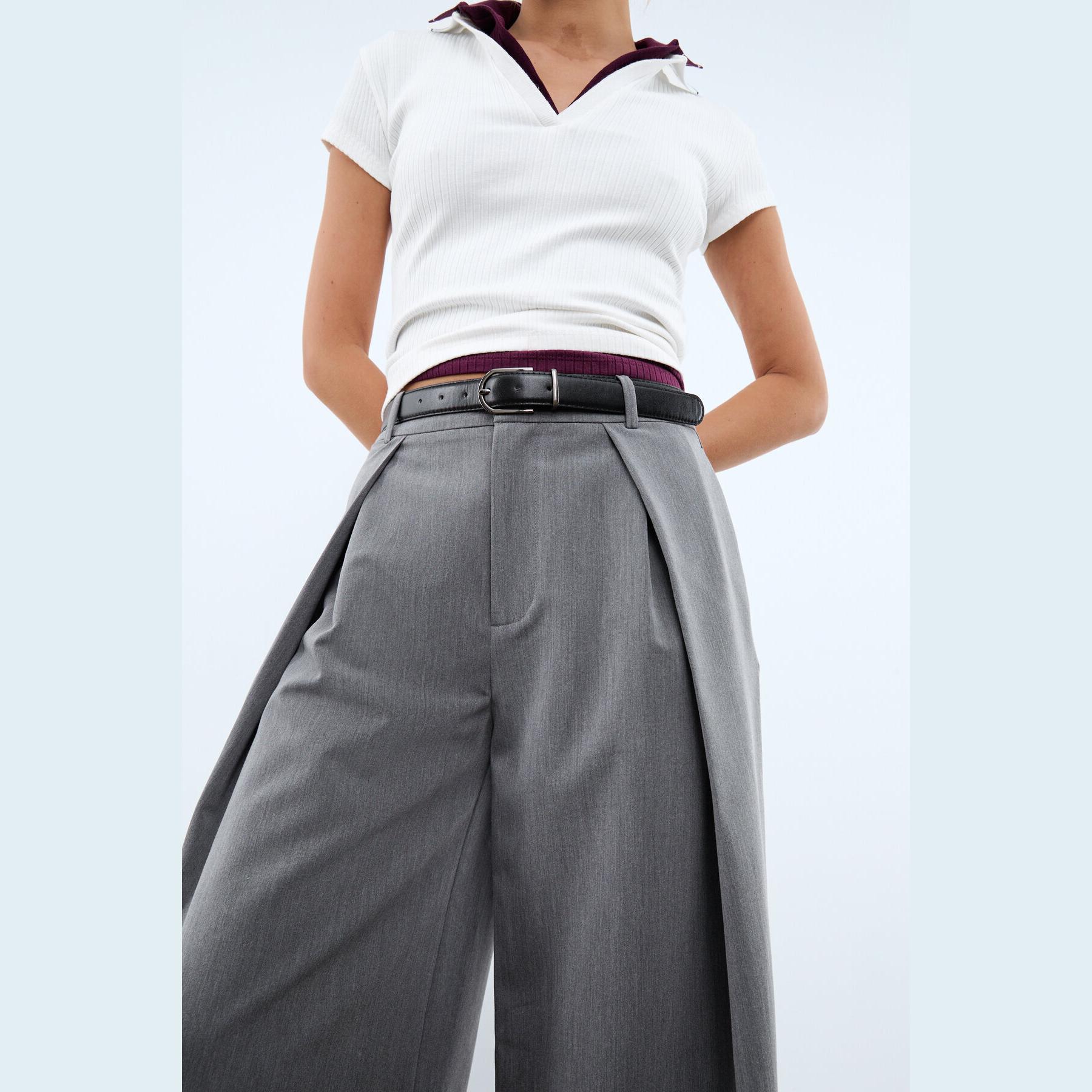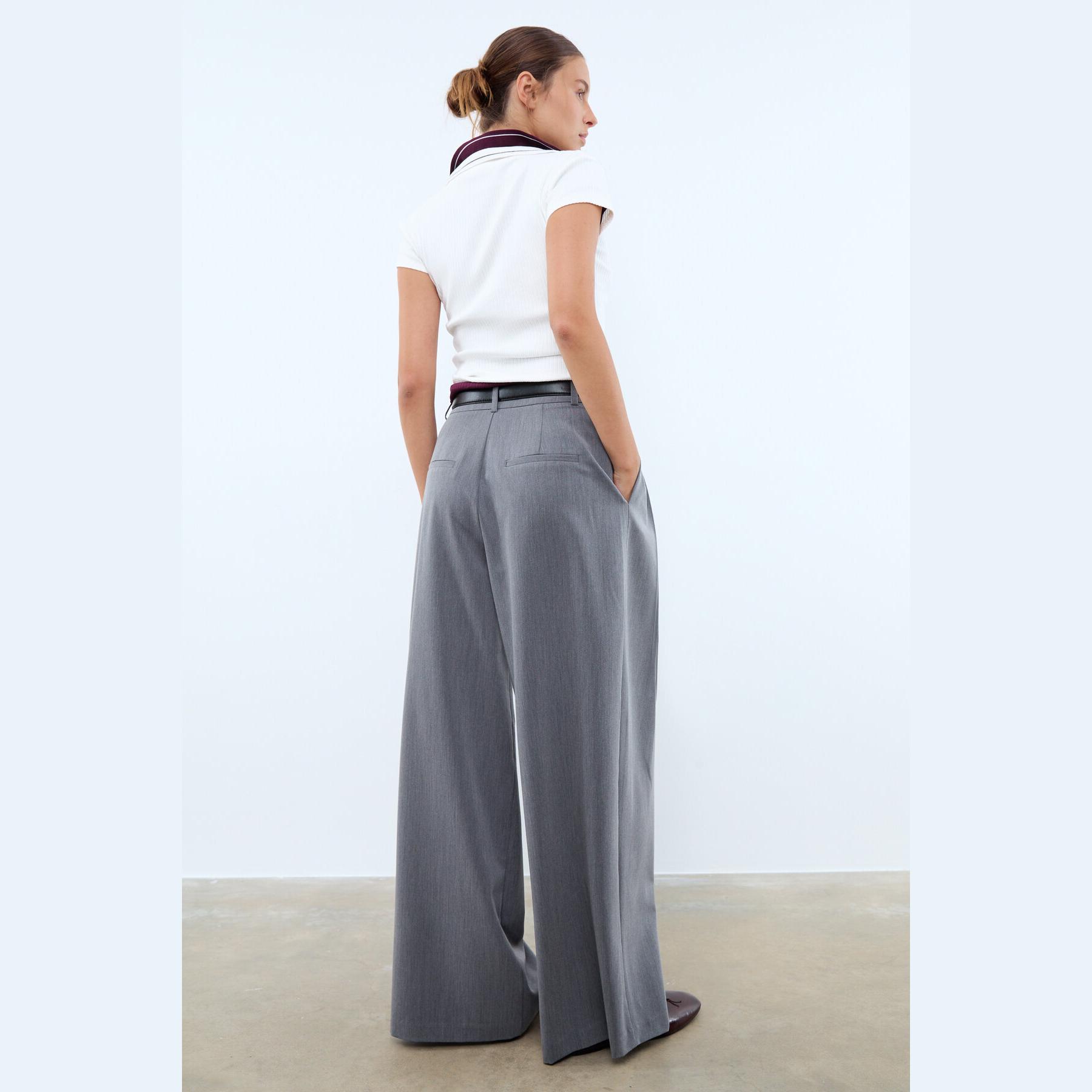 بنطال أنيق من Stradivarius بلون رمادي غامق، مصنوع من خامة مرنة بتركيبة 83% بوليستر، 15% فيسكوز، 2% إيلاستان، يتميز بقصة مستقيمة واسعة، خصر متوسط مزود بحلقات للحزام وحزام مرفق بلون متباين مع إبزيم معدني، إغلاق أمامي بسحاب داخلي، زر، دبوس وكبسة معدنية، مزود بجيبين جانبيين وجيوب خلفية بفتحة بيّلية، تصميم سادة مع بنس أمامية ماكسي تضيف طابعًا كلاسيكيًا، بدون بطانة، ملمس داخلي ناعم، مثالي للتنسيق مع قميص أو بلوزة لإطلالة مكتبية أو كاجوال أنيقة.