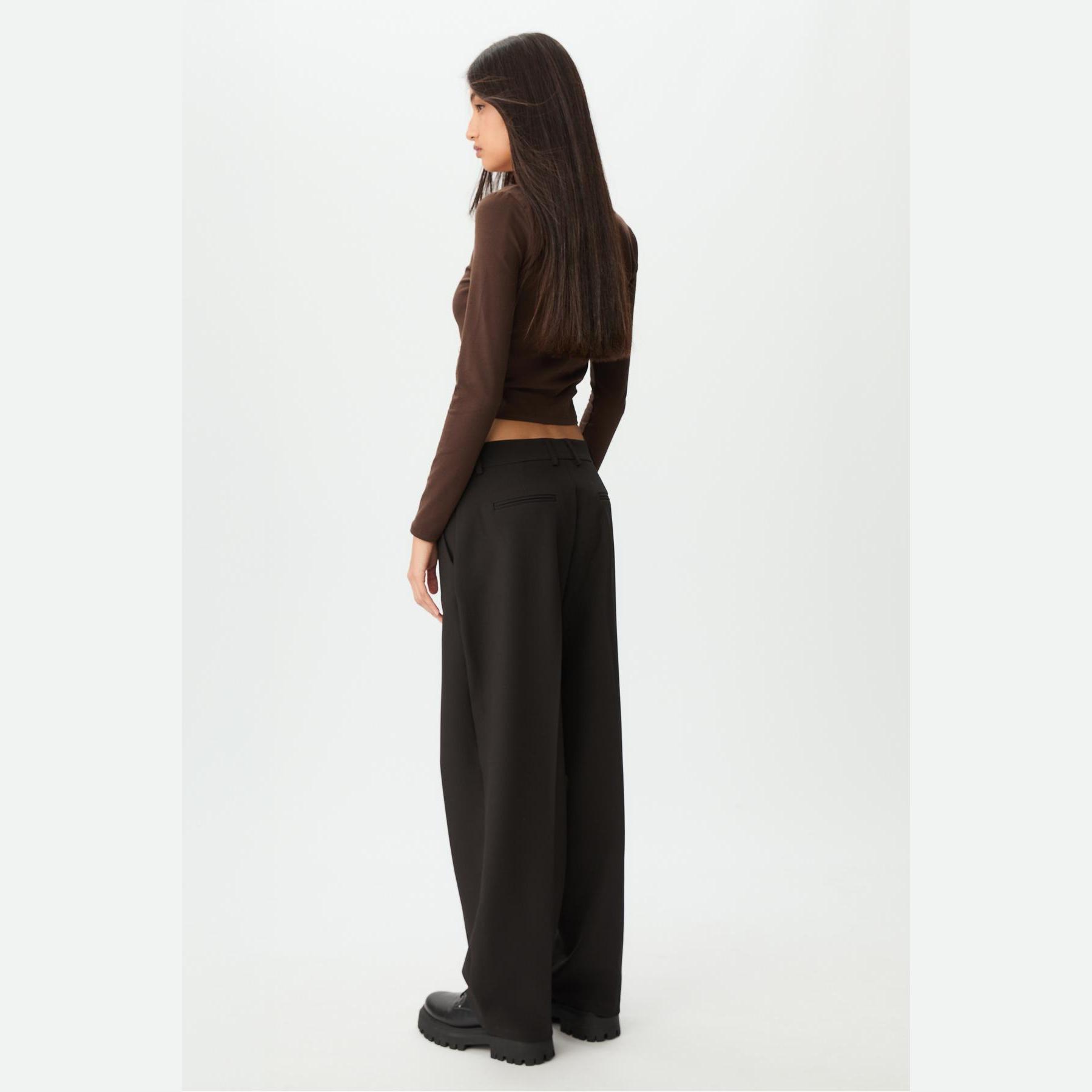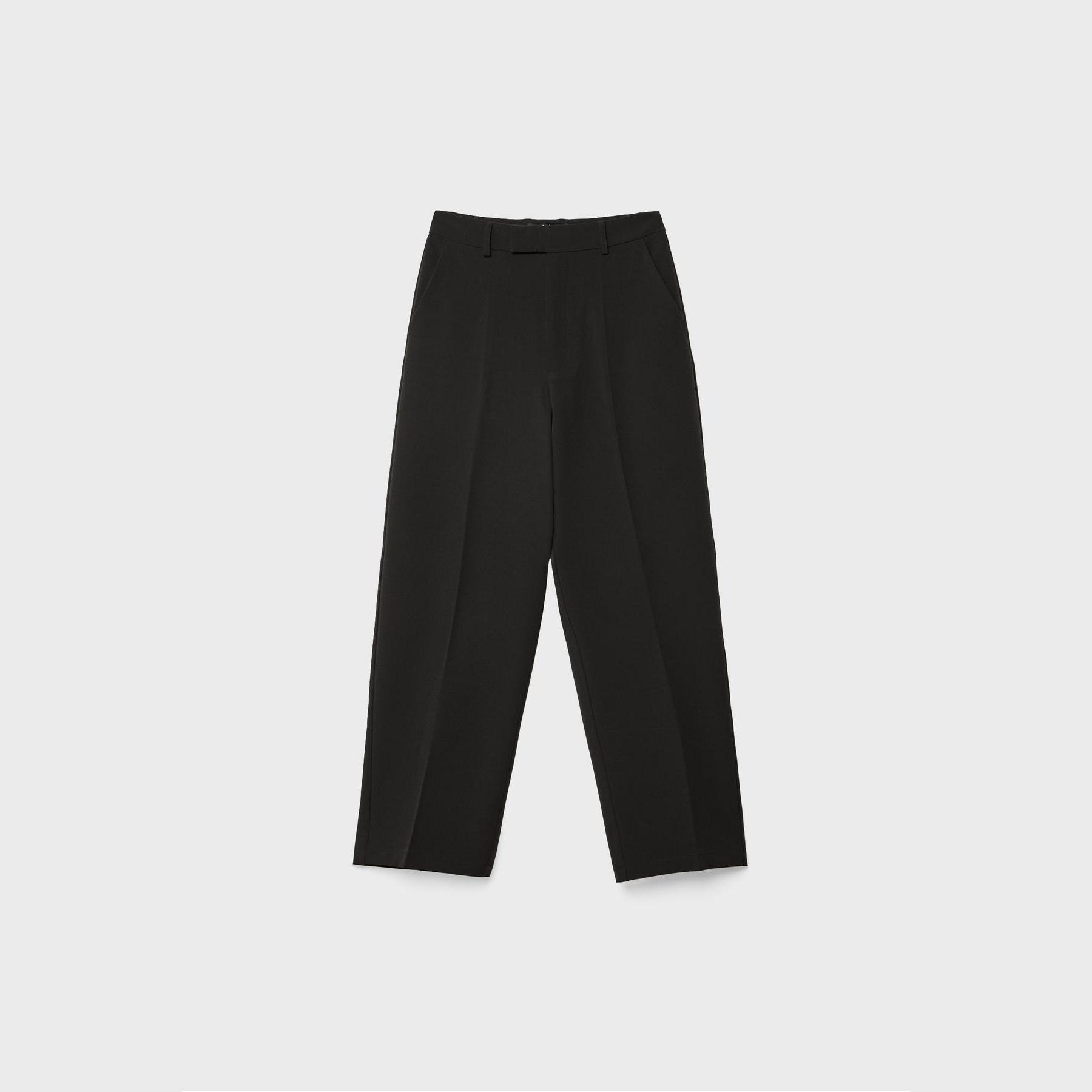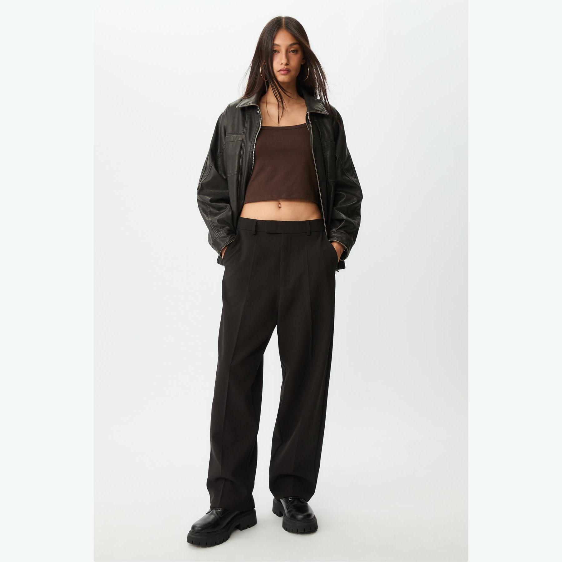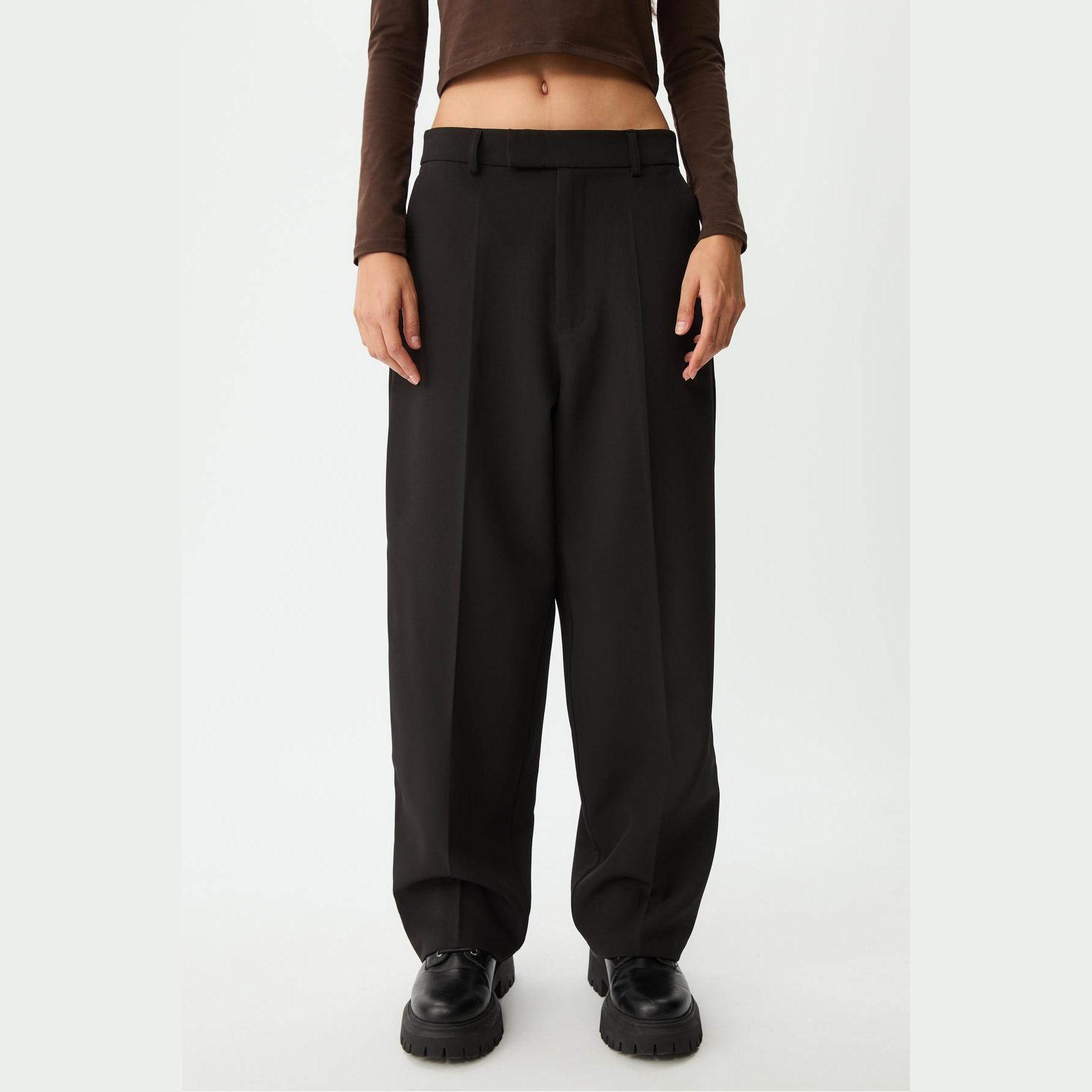 بنطال عملي من Stradivarius بلون أسود بنقشة مربعات، مصنوع من خامة مرنة بتركيبة 92% بوليستر، 8% إيلاستان، يتميز بقصة Flare واسعة، خصر متوسط مزود بحلقات للحزام، إغلاق أمامي متقاطع بسحاب داخلي، دبوس، زر وكبسة معدنية، مزود بجيبين جانبيين وجيوب خلفية بفتحة بيّلية، تصميم بنقشة مربعات، بدون بطانة، ملمس داخلي ناعم، مثالي للتنسيق مع تيشيرت أو بلوزة لإطلالة يومية مريحة.