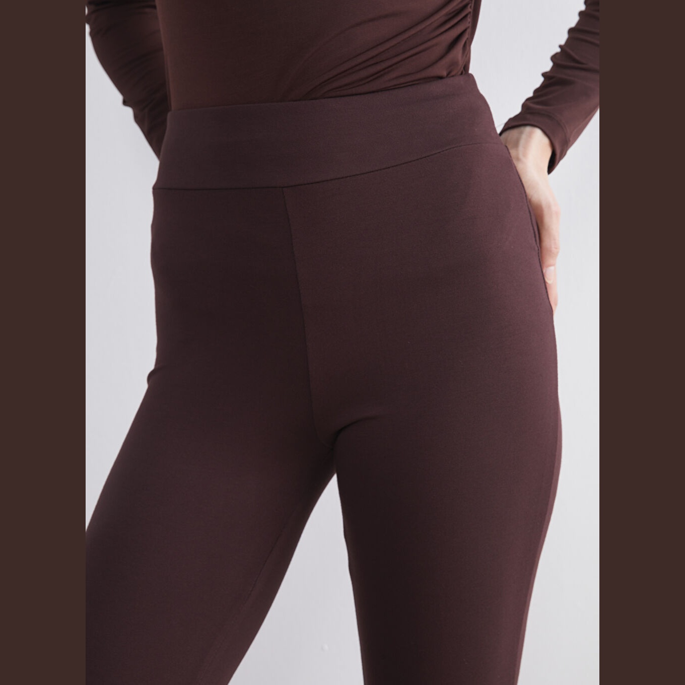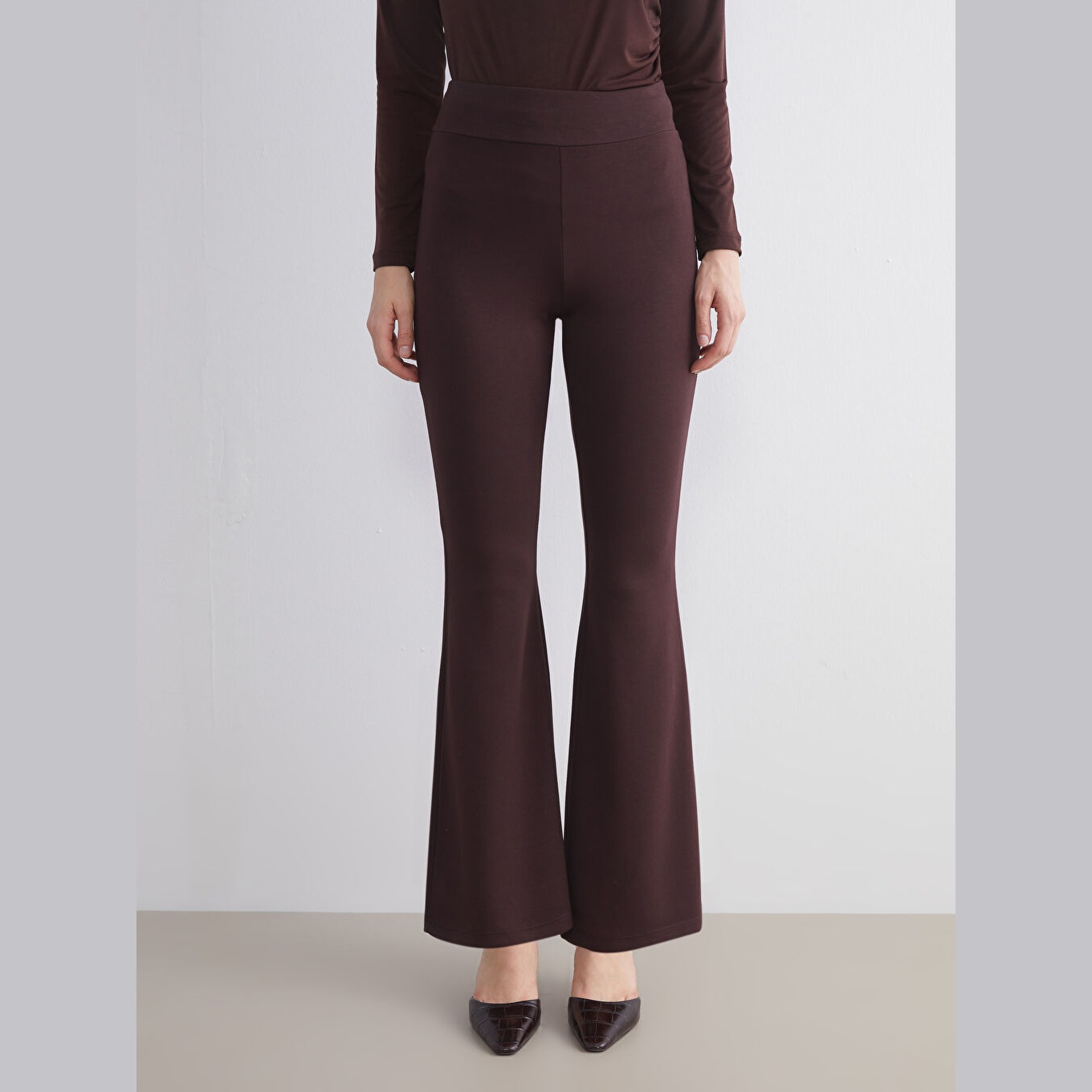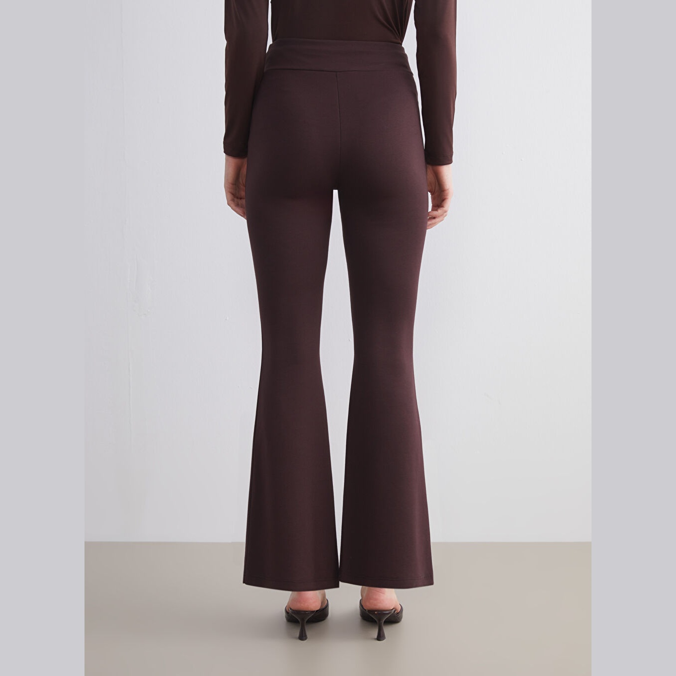 تَايْت نسائي بخصر مطاطي وقصة إسبانية – بني بقماش دالغيچ (قصة ضيقة جدًا، خامة مرنة، تصميم مريح، بطول كامل)