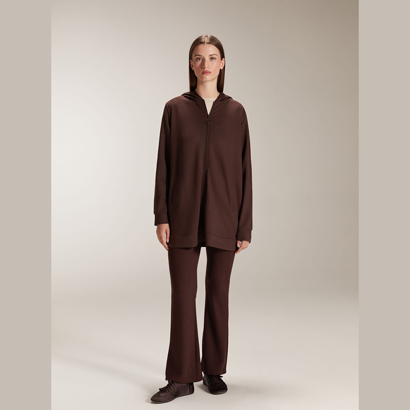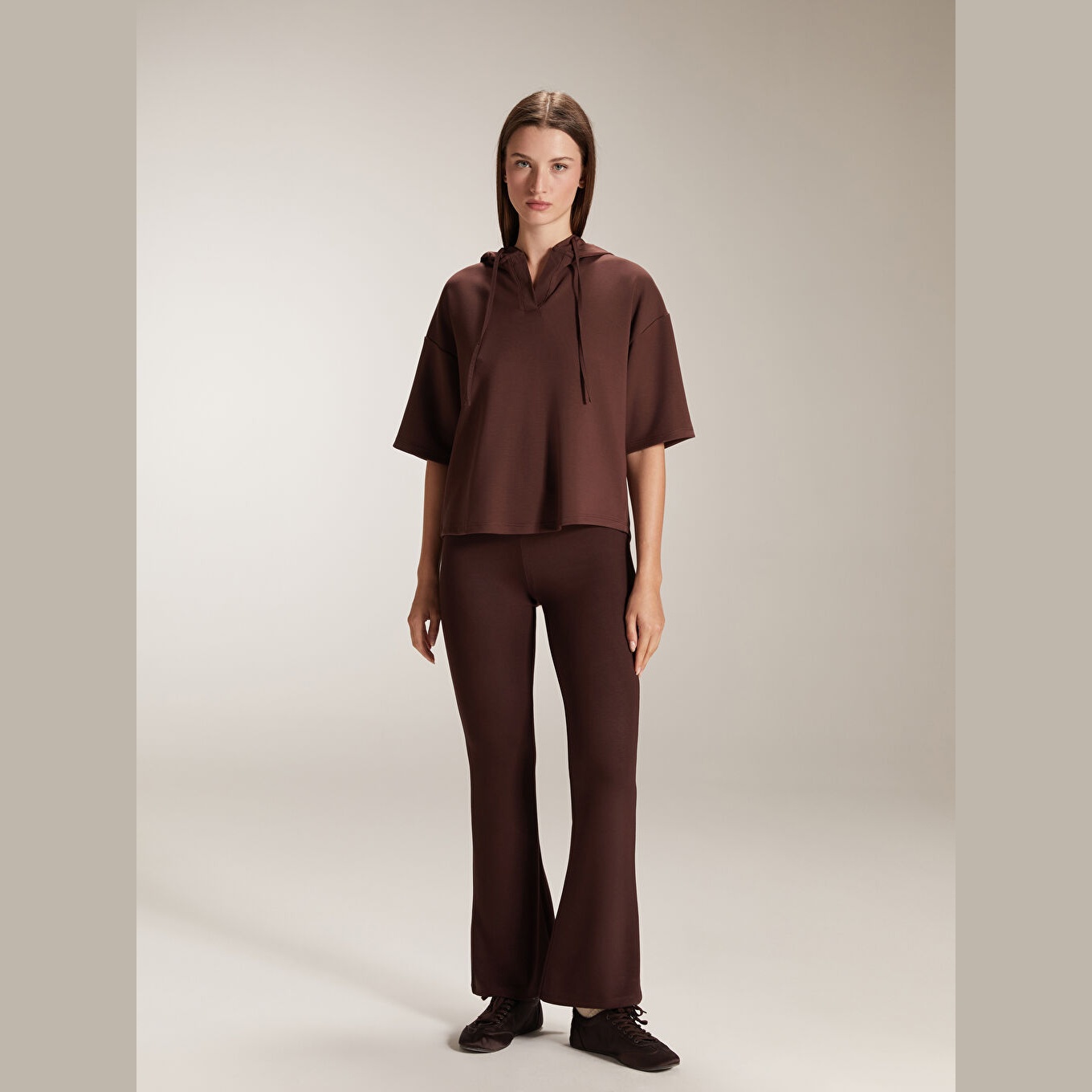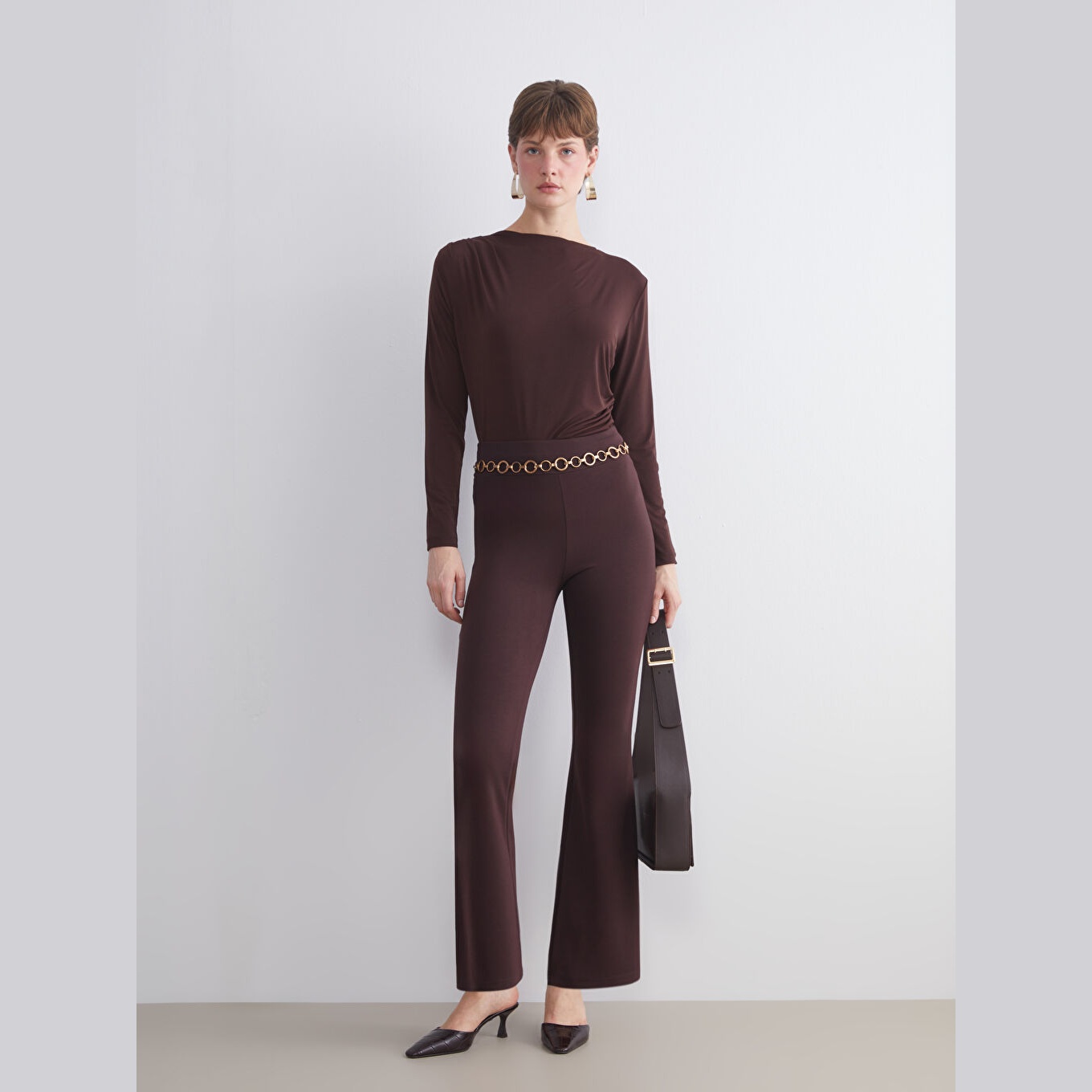 تَايْت نسائي بخصر مطاطي وقصة إسبانية – بني بقماش دالغيچ (قصة ضيقة جدًا، خامة مرنة، تصميم مريح، بطول كامل)