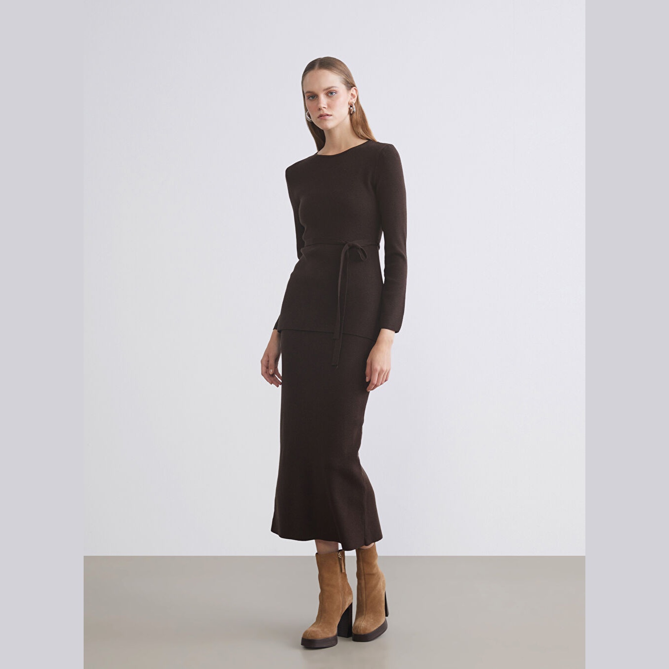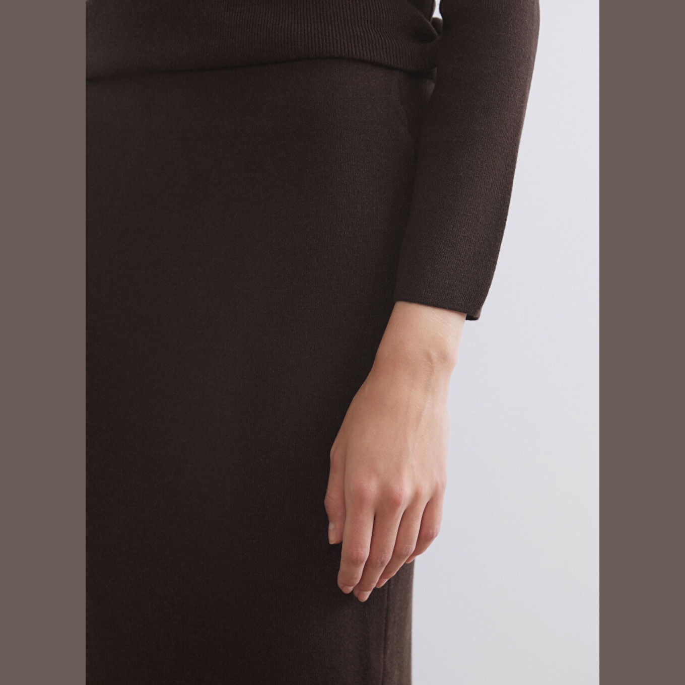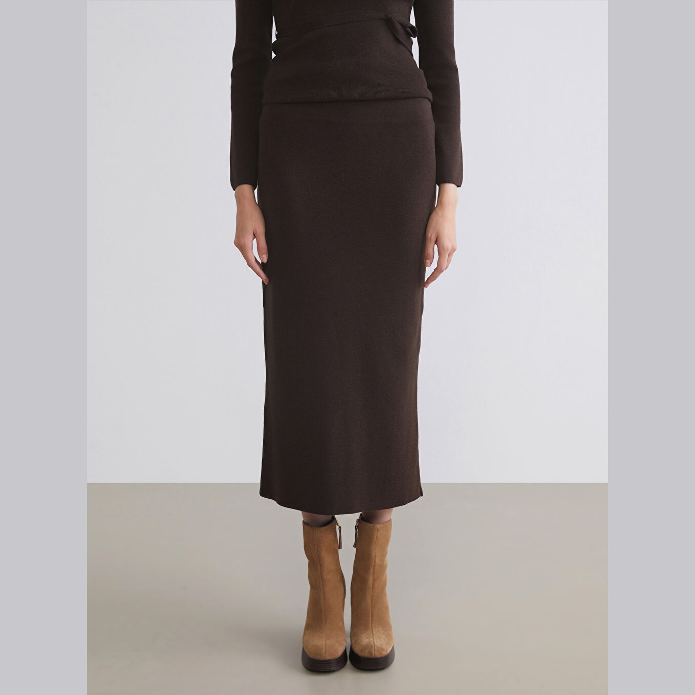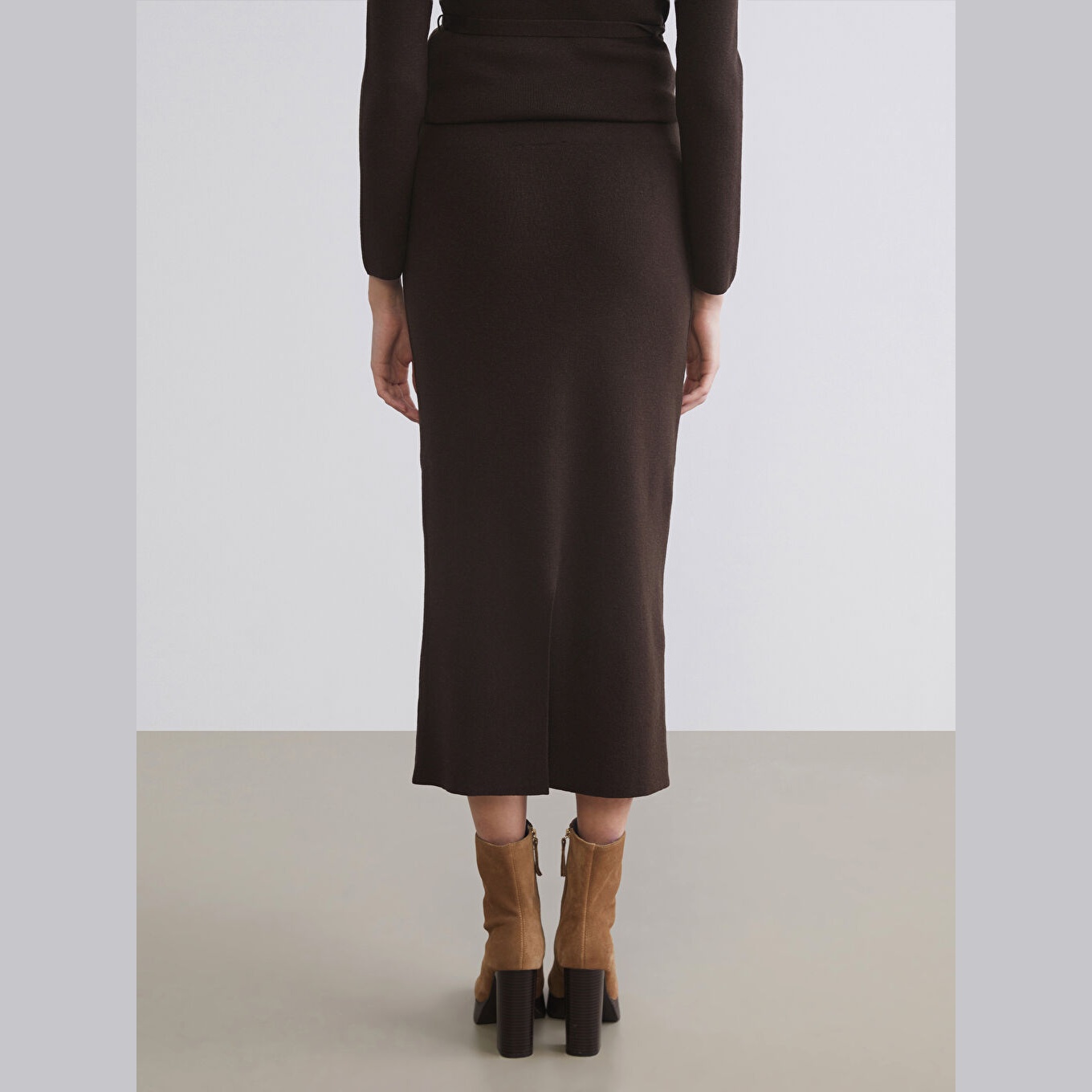 تنورة نسائية بخصر مطاطي وشق جانبي – بني عملي (قصة ضيقة، خامة تريكو، تصميم ميدي، بدون بطانة)