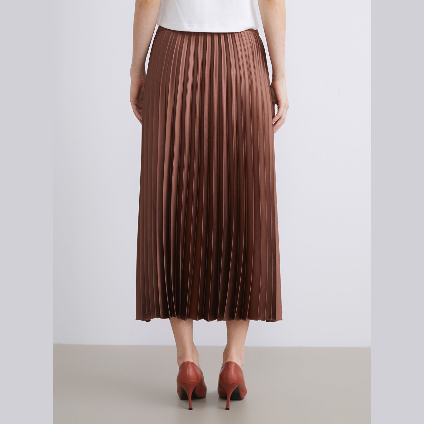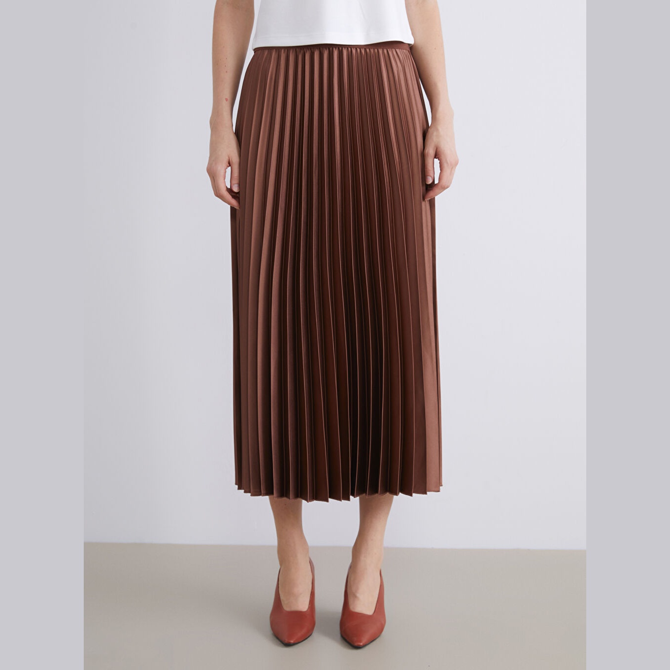 تنورة أنيقة بلون بني لامع من مجموعة LCWAIKIKI Classic Büyük Beden – لأناقة ناعمة ومحتشمة، تتميز بقصة بليسيه فضفاضة (Loose Fit Pileli) تمنحك حركة انسيابية أنثوية، مع خصر مطاطي عملي يضمن ثباتًا وراحة طوال اليوم. مصنوعة من خامة ساتان ناعمة ولامعة بتركيبة %97 بوليستر، %3 إيلاستان، بدون بطانة، وبطول ميدي يصل إلى منتصف الساق تقريبًا، مثالية للإطلالات اليومية أو الرسمية المحتشمة.