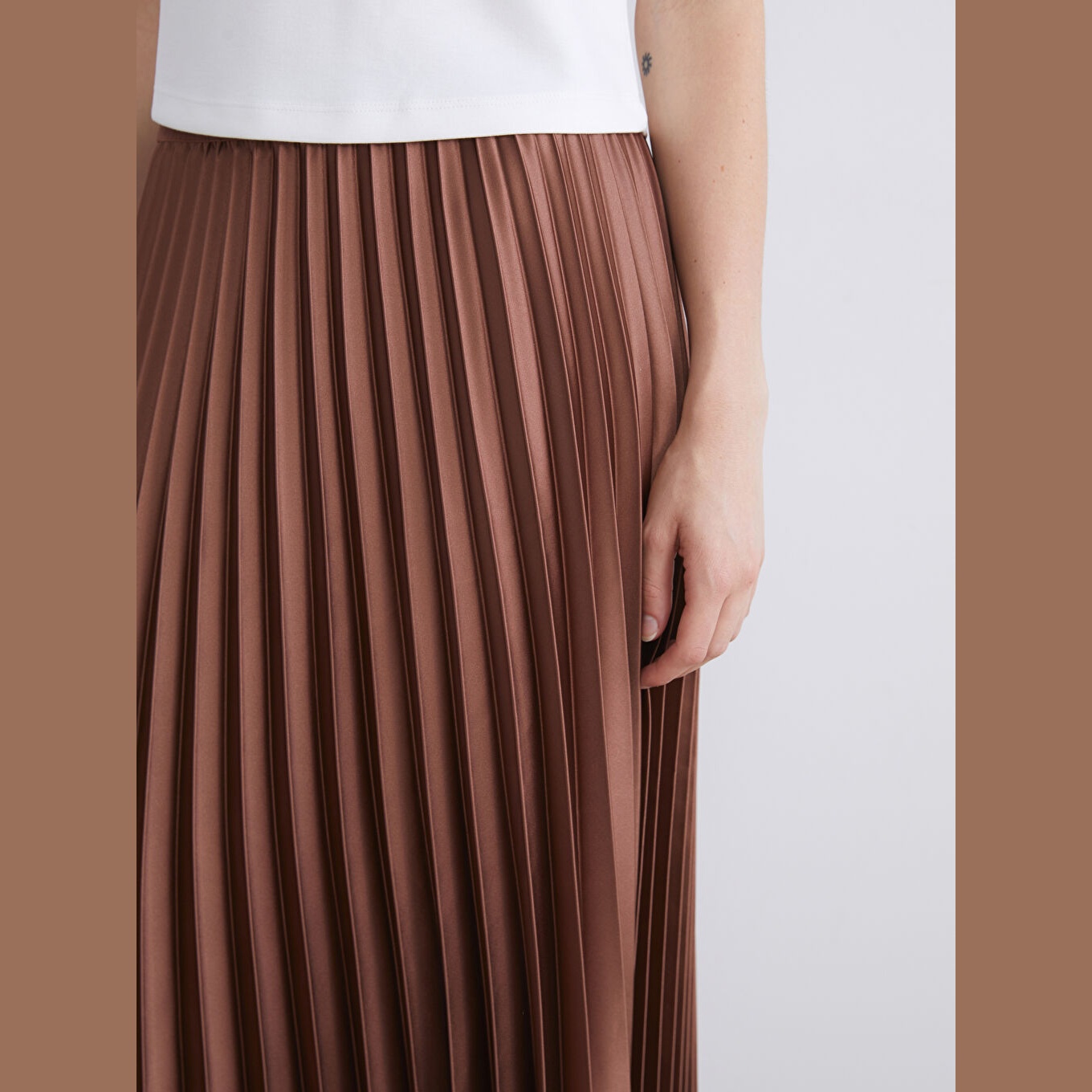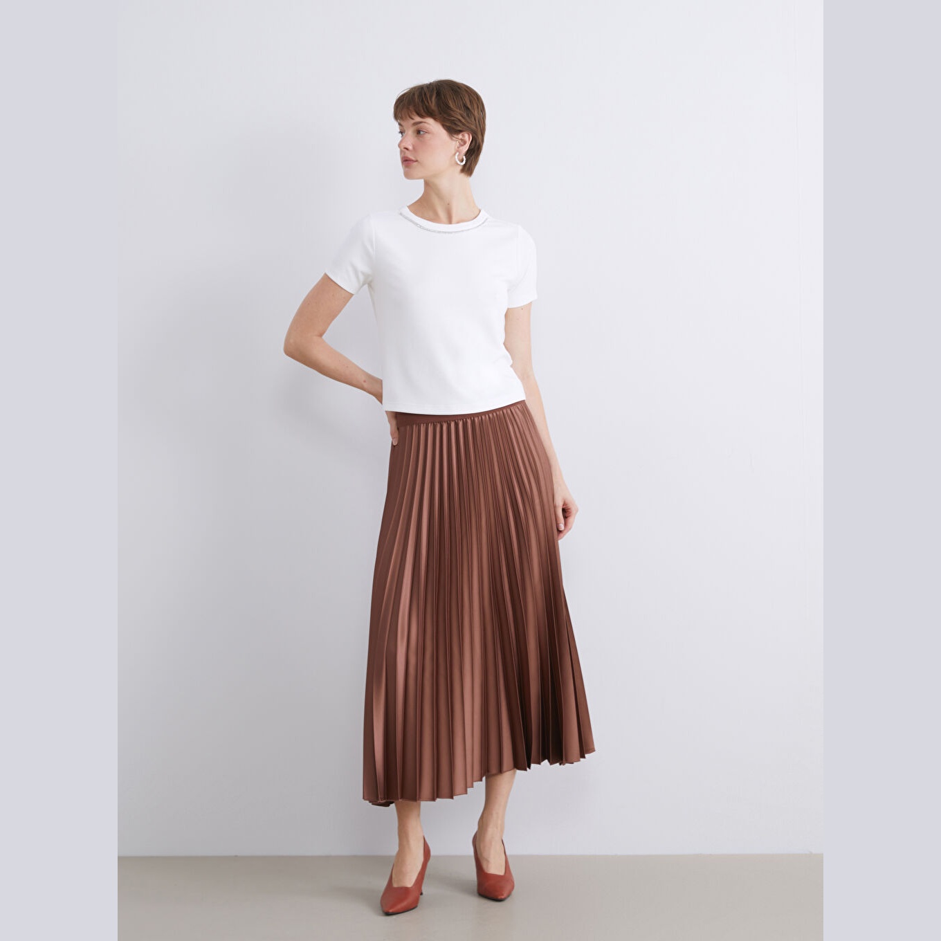 تنورة نسائية بخصر مطاطي وقصة بليسيه – بني ساتان (قصة فضفاضة، تصميم ميدي، بدون بطانة)