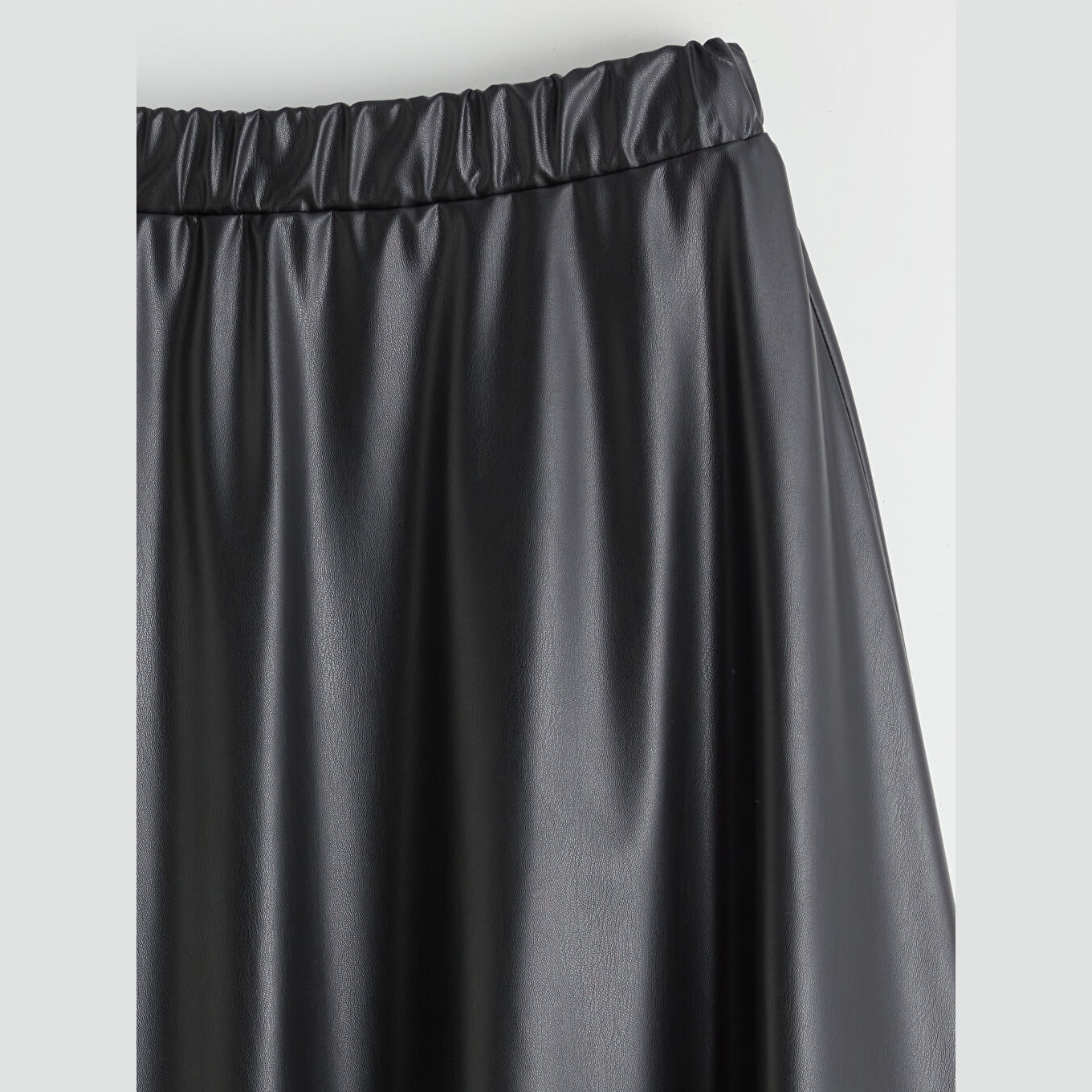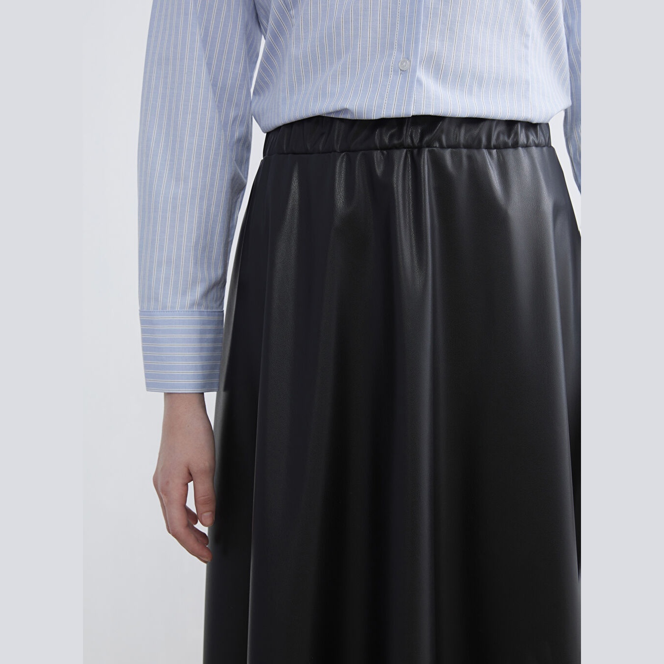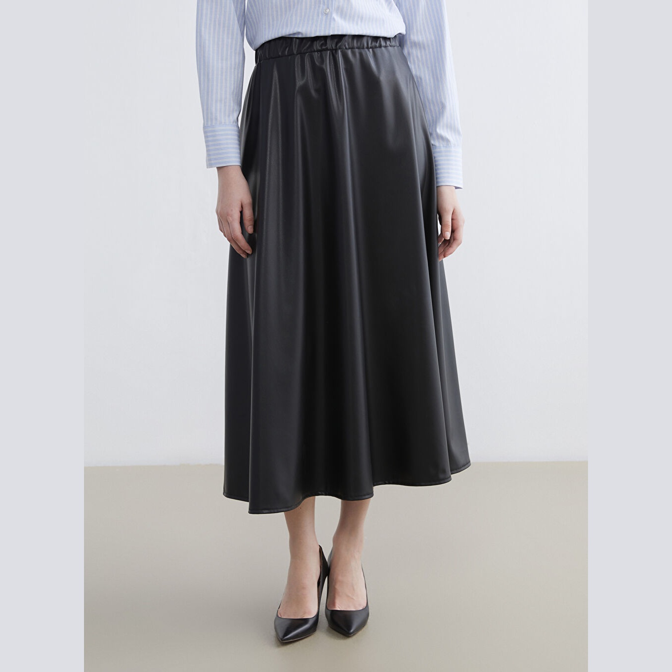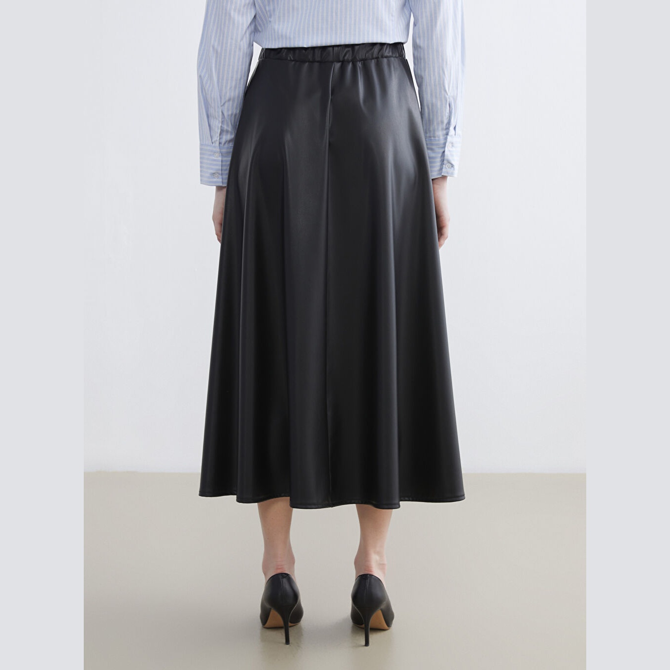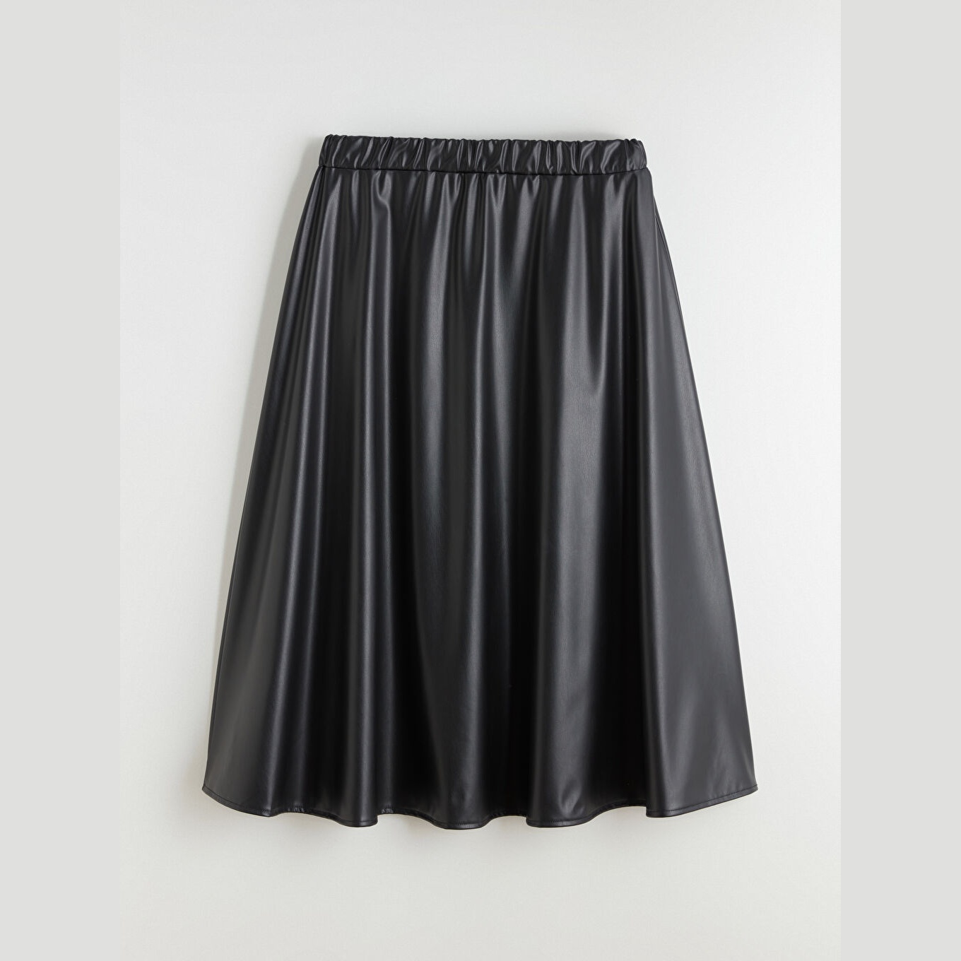 تنورة نسائية بخصر مطاطي وقصة كلوش – أسود جلد صناعي (قصة واسعة، تصميم ميدي، بدون بطانة)