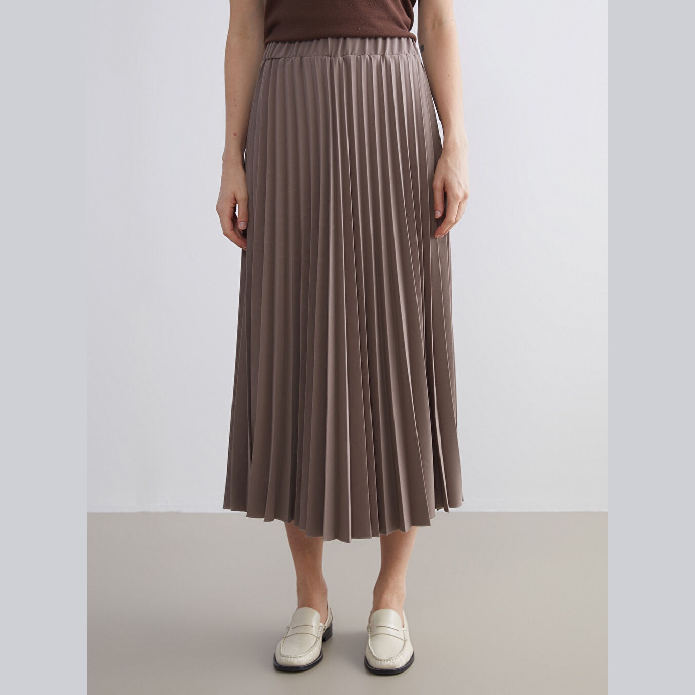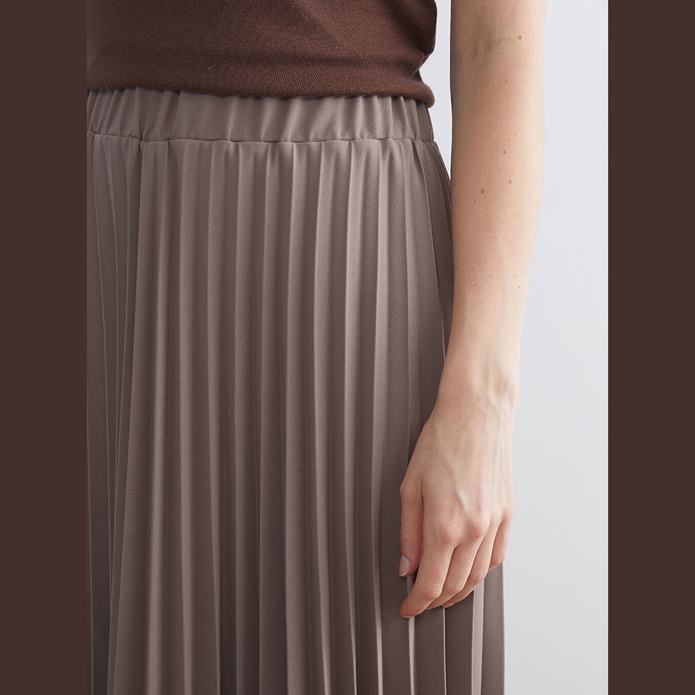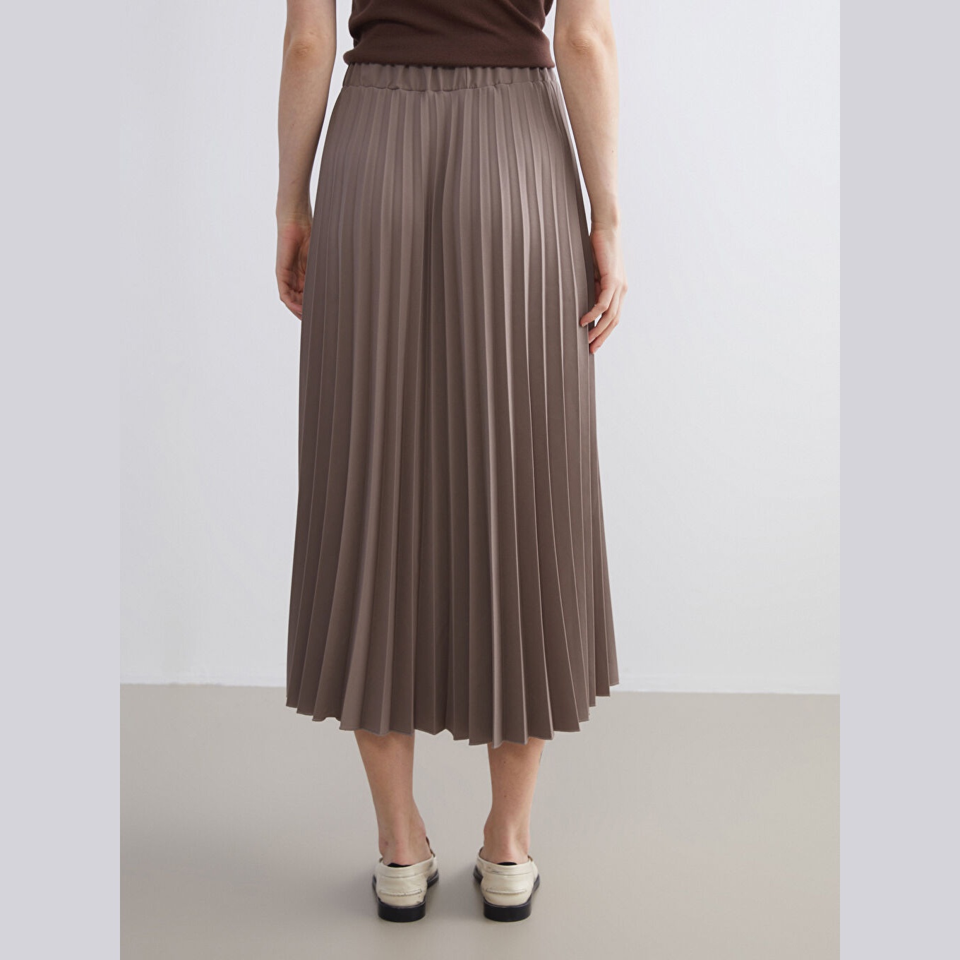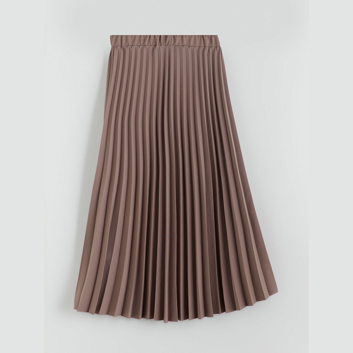تنورة نسائية بخصر مطاطي وقصة بليسيه – بني شيفون (قصة واسعة، تصميم ميدي، بدون بطانة)