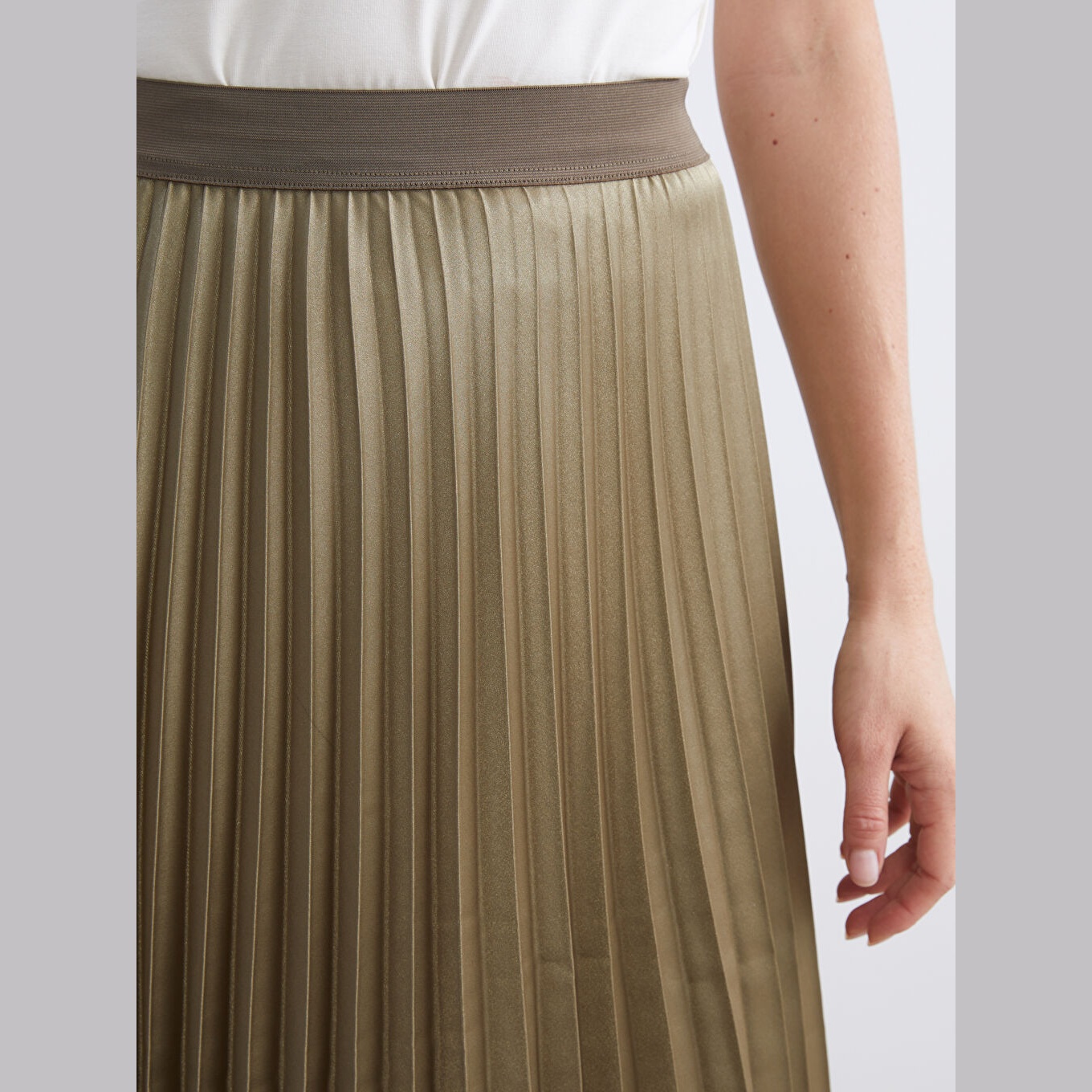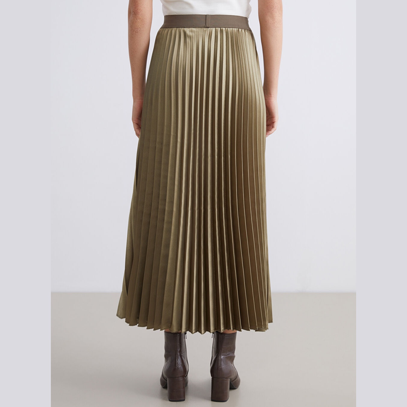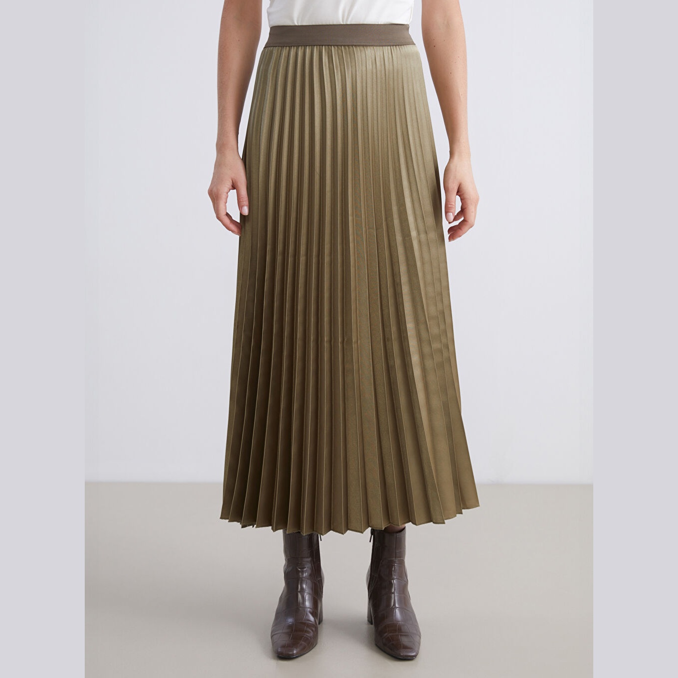 تنورة نسائية بخصر مطاطي وقصة بليسيه – كاكي ساتان (قصة فضفاضة، تصميم ميدي، بدون بطانة)