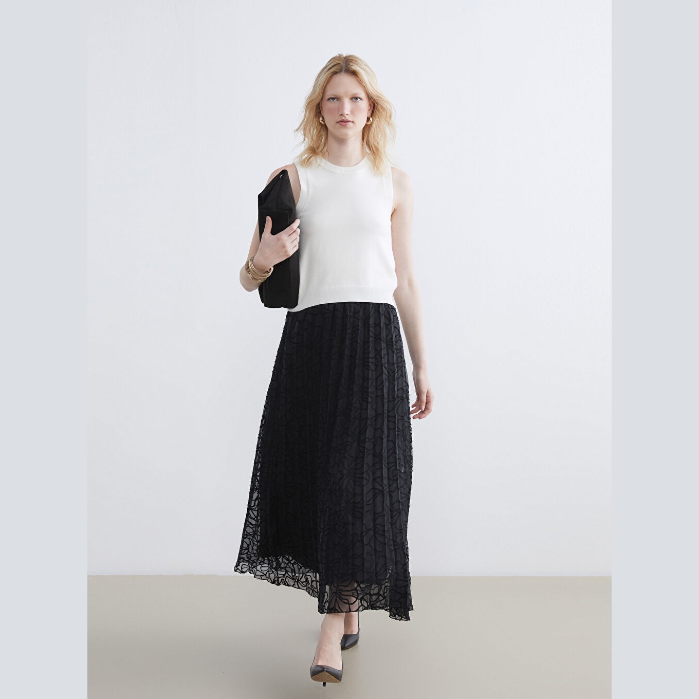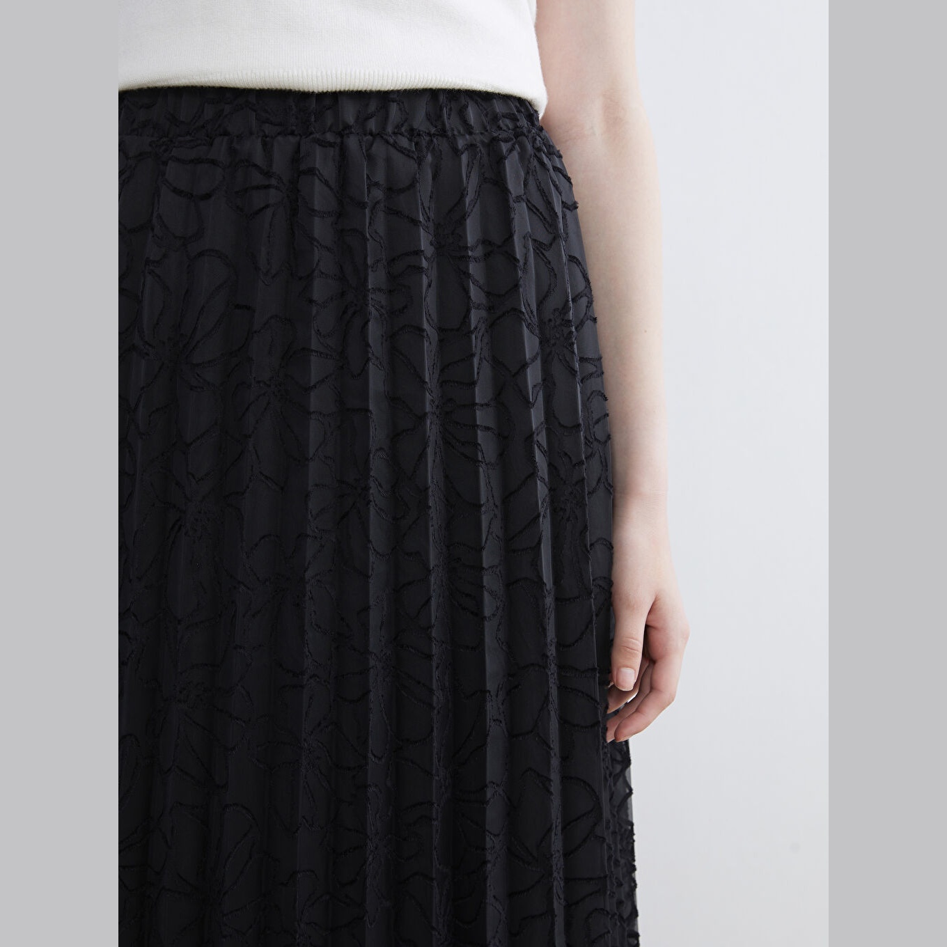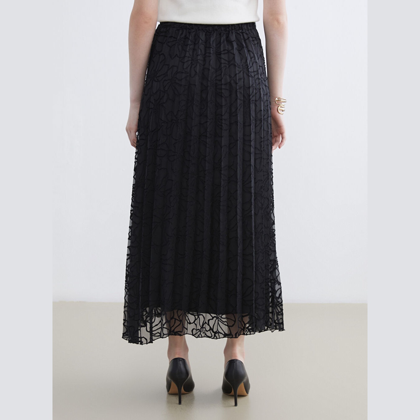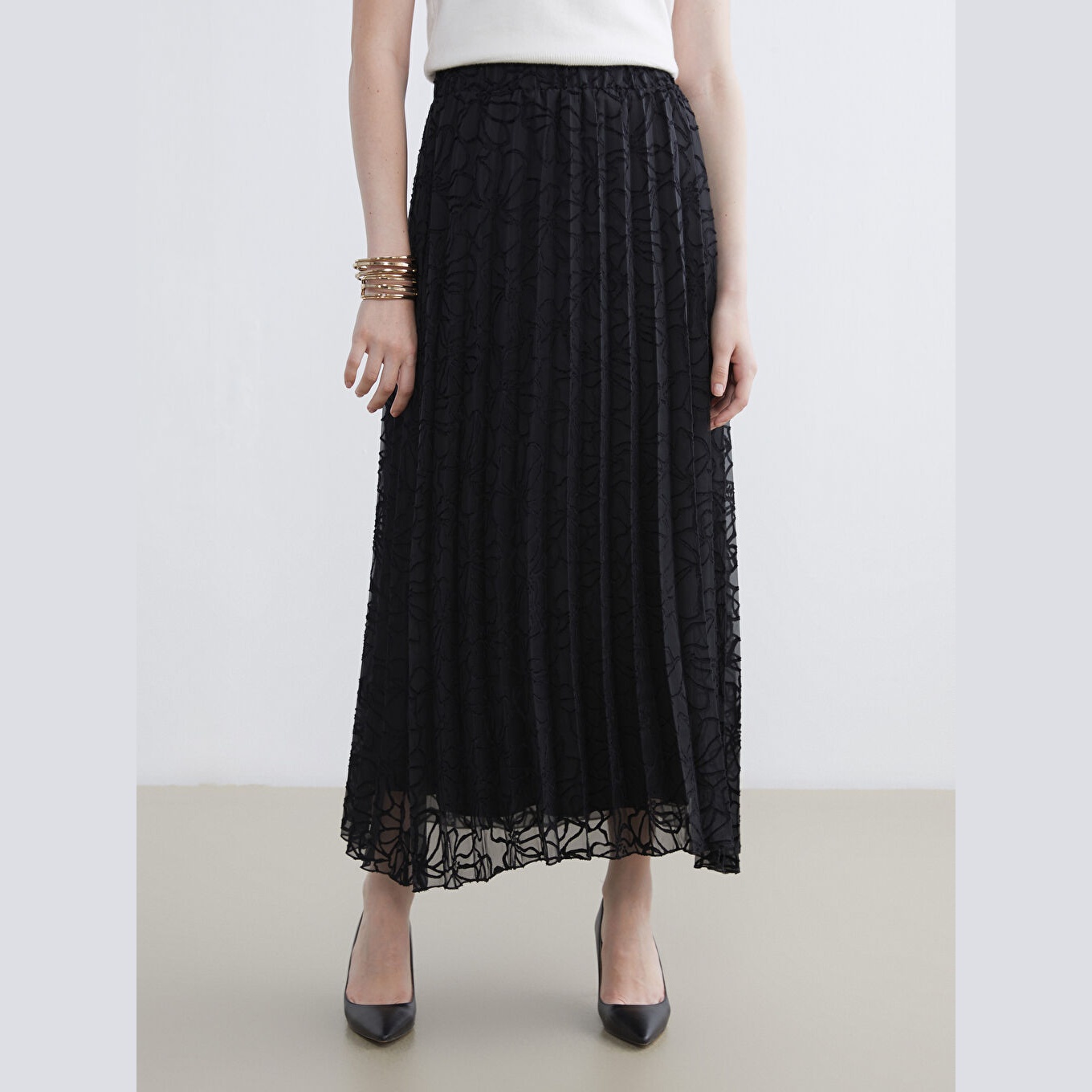 تنورة أنيقة بلون أسود مزخرف بنقشة ناعمة من مجموعة LCWAIKIKI Classic – لأناقة ناعمة ومحتشمة، تأتي بقصة بليسيه فضفاضة (Loose Fit Pileli) تمنحك حركة انسيابية أنثوية، مع خصر مطاطي عملي يضمن ثباتًا وراحة طوال اليوم. مصنوعة من خامة شيفون مزخرف خفيفة بتركيبة %53 بوليستر، %47 فيسكوز، ومبطنة بالكامل بطبقة داخلية من %100 بوليستر، وبطول طويل يصل إلى الكاحل تقريبًا، ما يجعلها مثالية للإطلالات اليومية أو الرسمية المحتشمة.