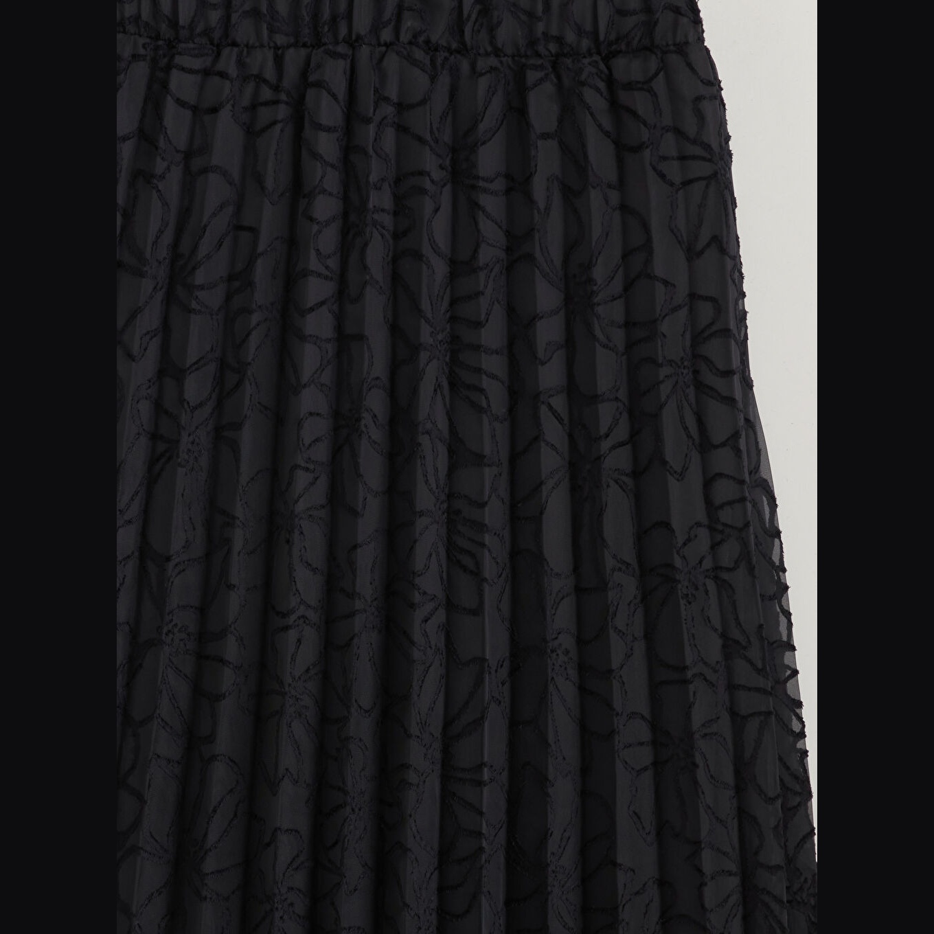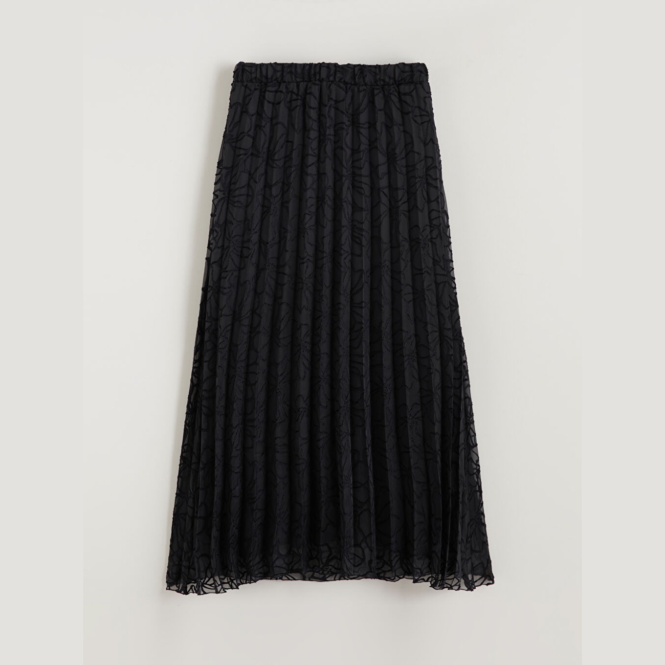 تنورة نسائية بخصر مطاطي وقصة بليسيه – أسود بنقشة شيفون مبطن (قصة فضفاضة، تصميم طويل، مبطنة بالكامل)