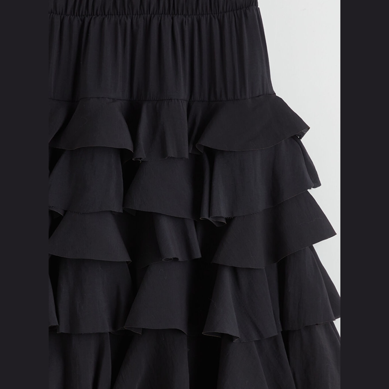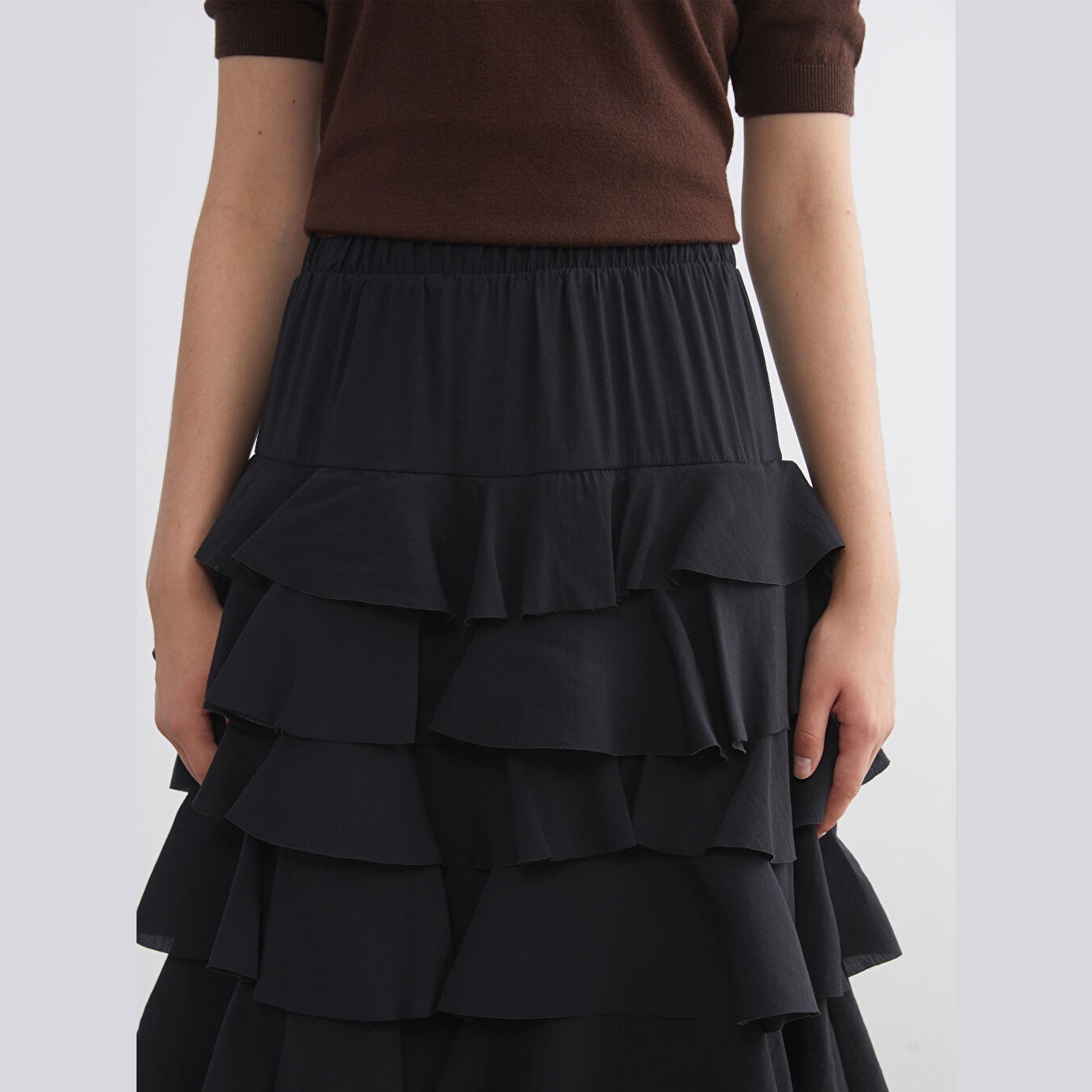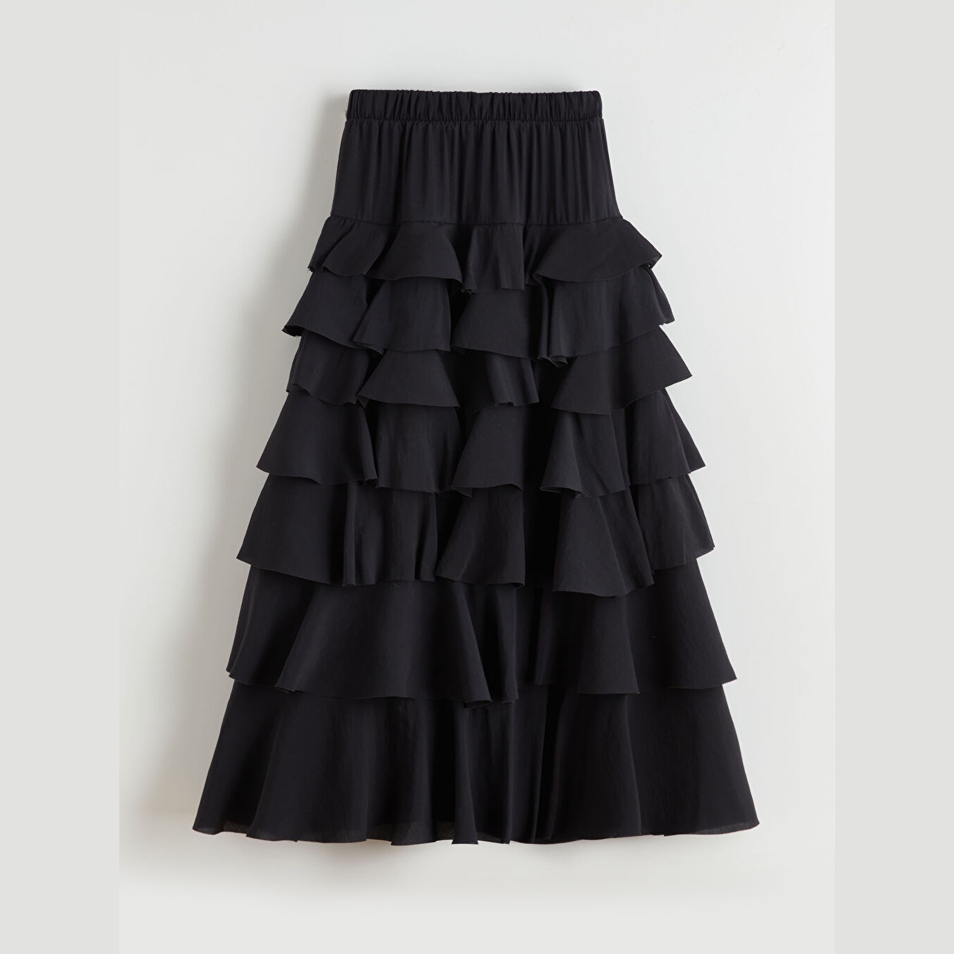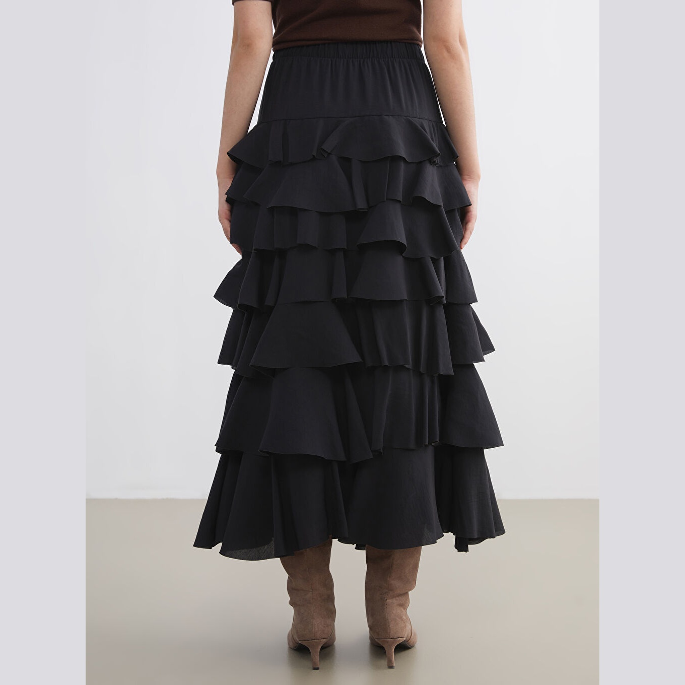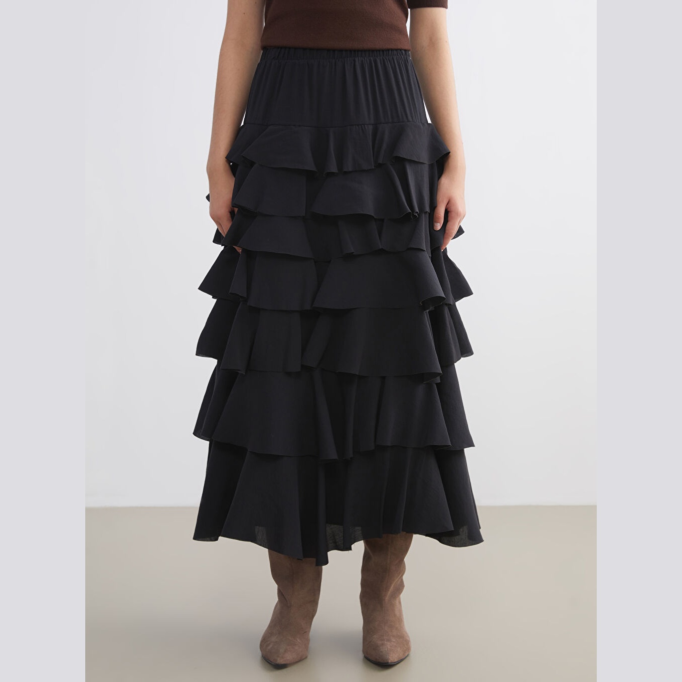 تنورة نسائية بخصر مطاطي وقصة كشكش – أسود مودال (قصة فضفاضة، تصميم طويل، بدون بطانة)