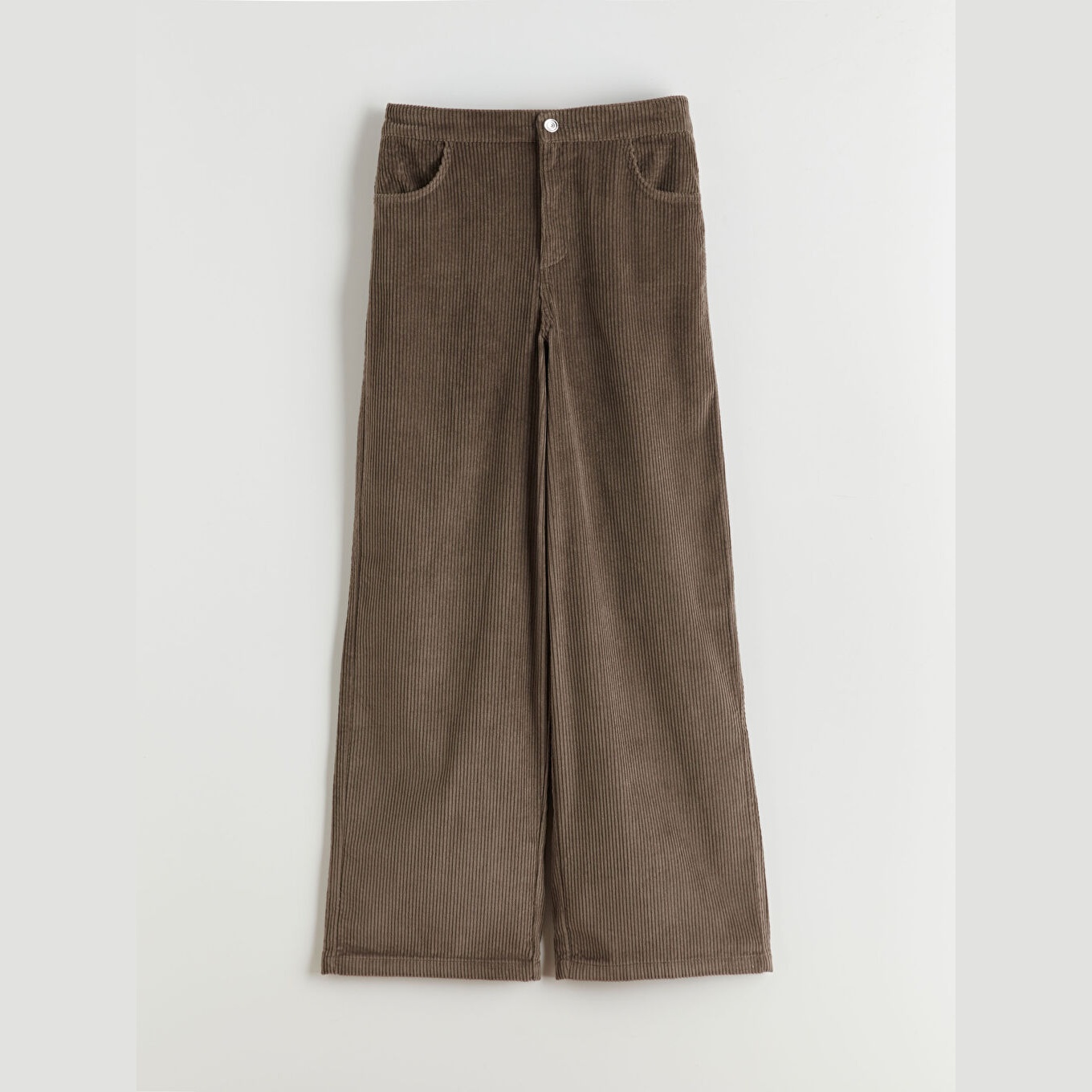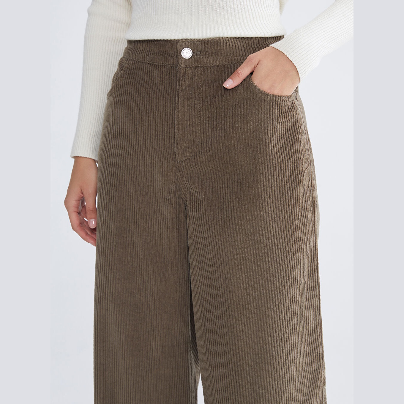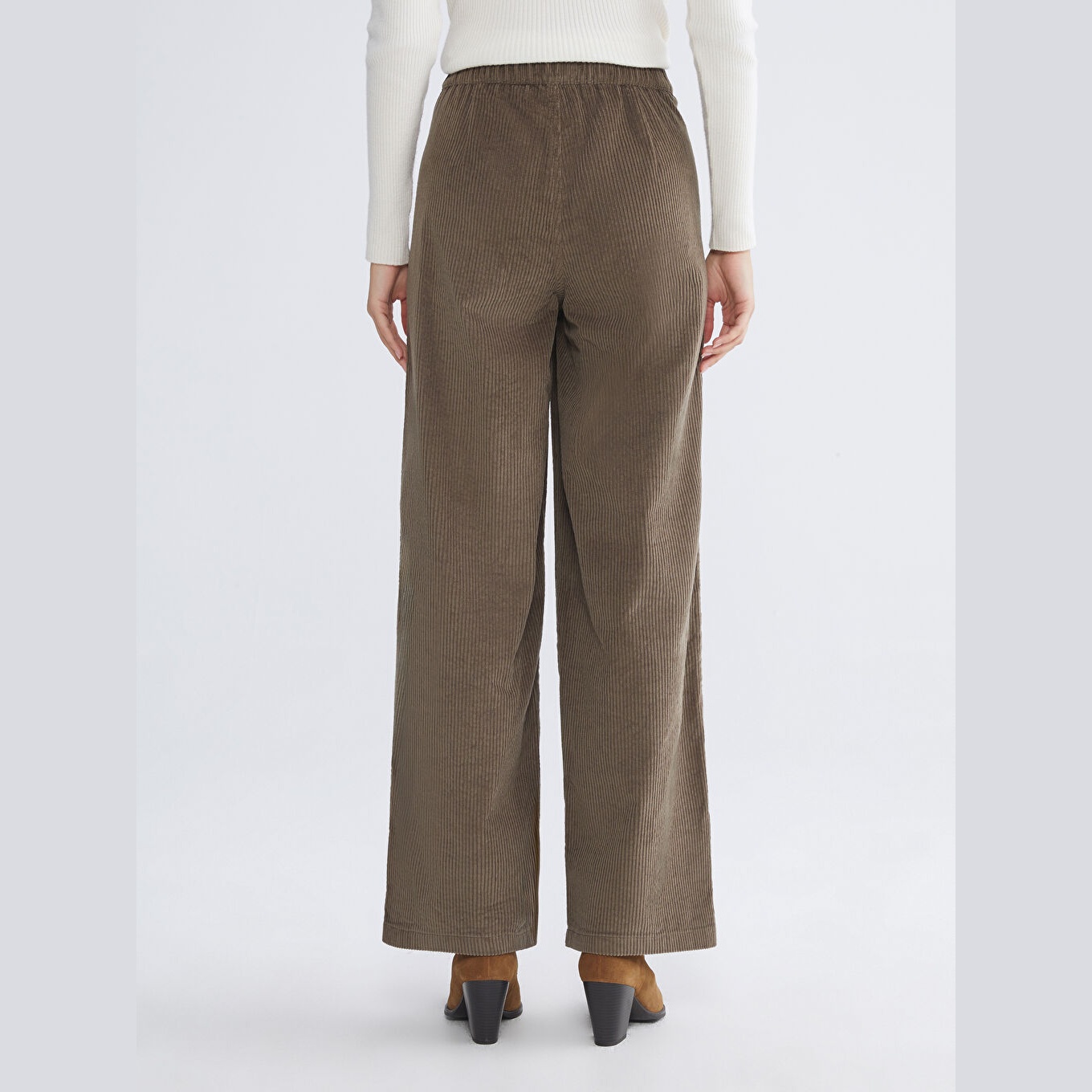 بنطال نسائي بخصر مطاطي – بني بقماش كوردروي (قصة فضفاضة، أرجل واسعة، خامة سميكة 100% قطن)