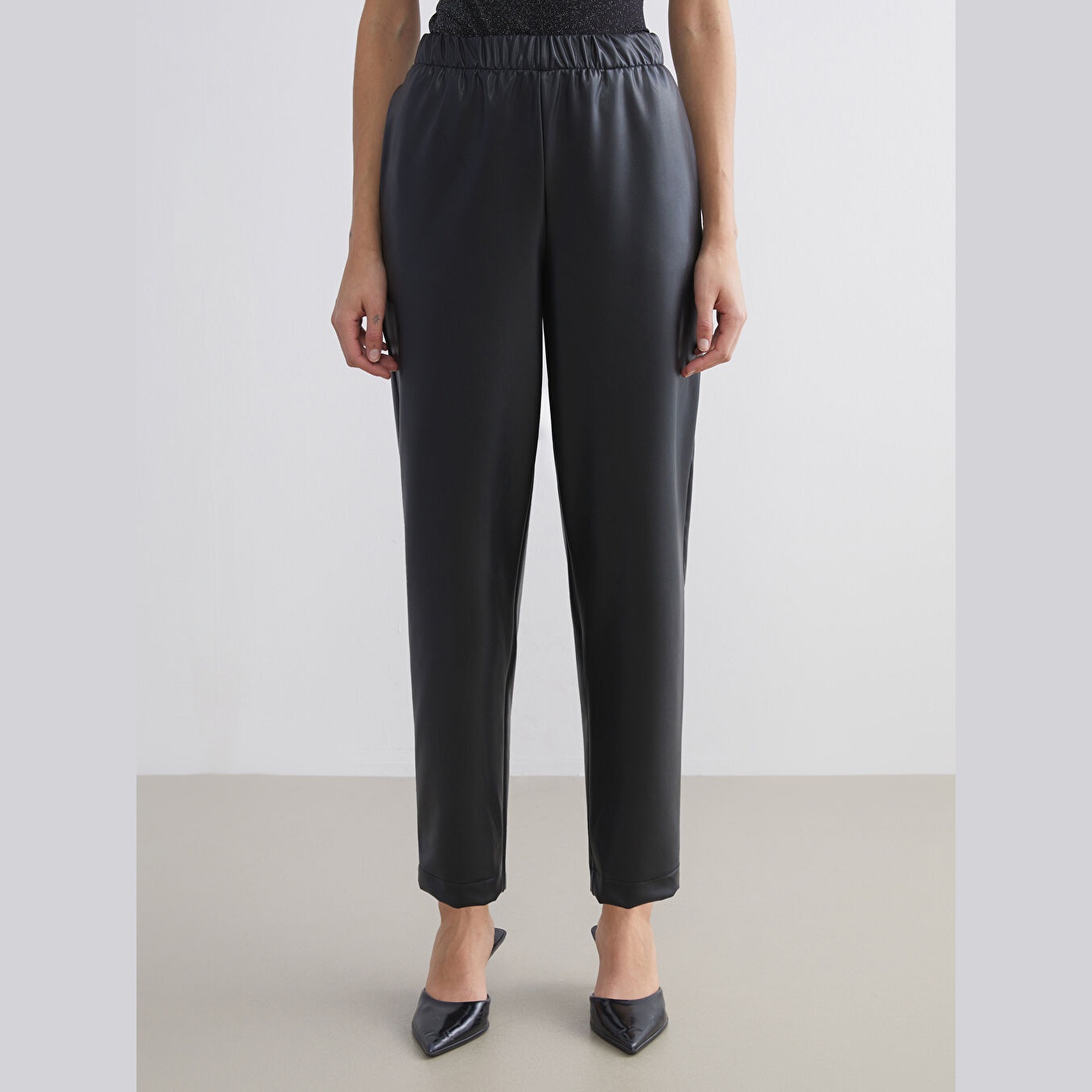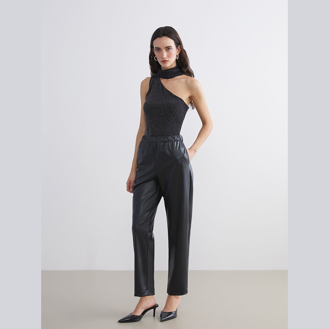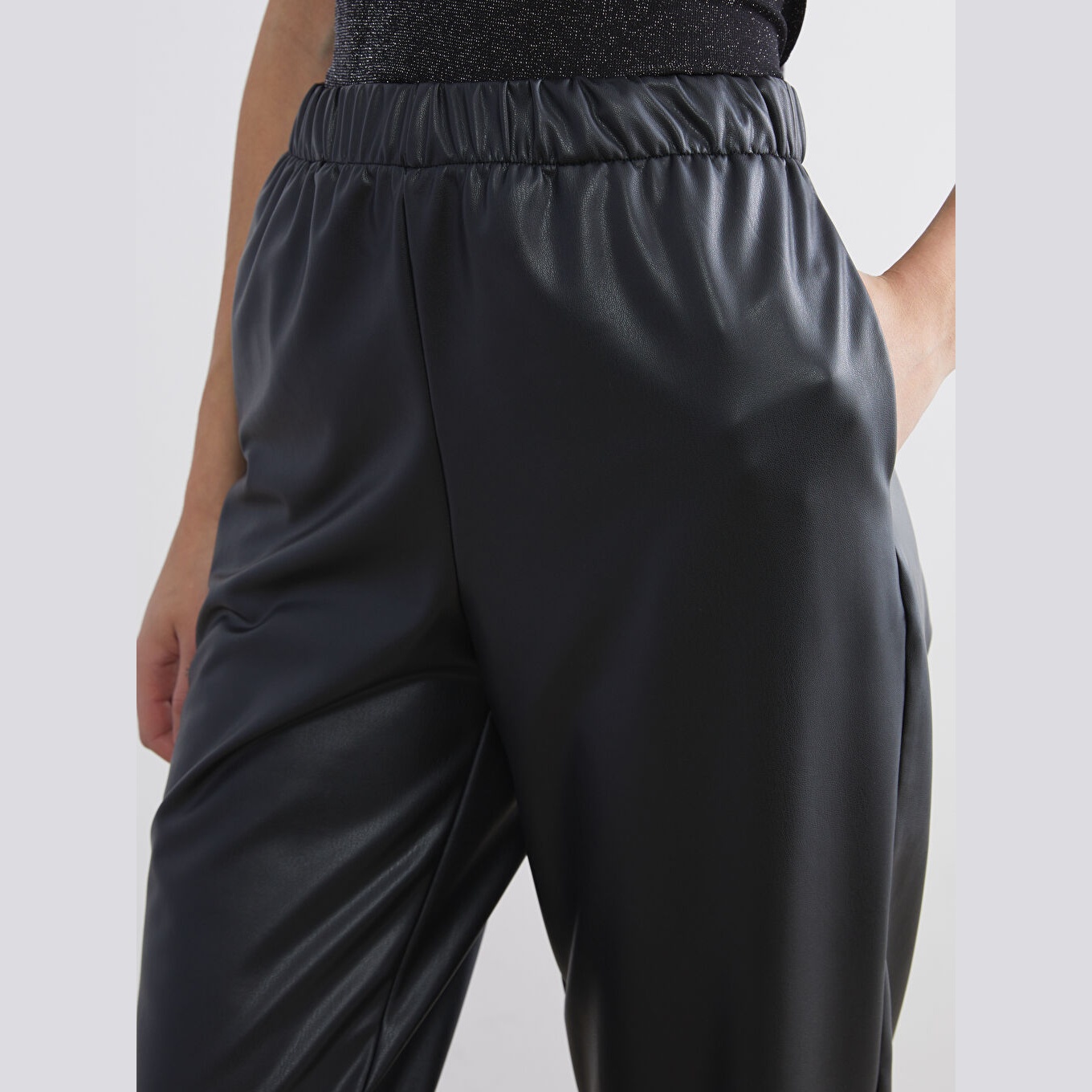 بنطال نسائي بخصر مطاطي – أسود بمظهر الجلد (قصة مريحة، أرجل ضيقة، خامة جلد صناعي مرنة)