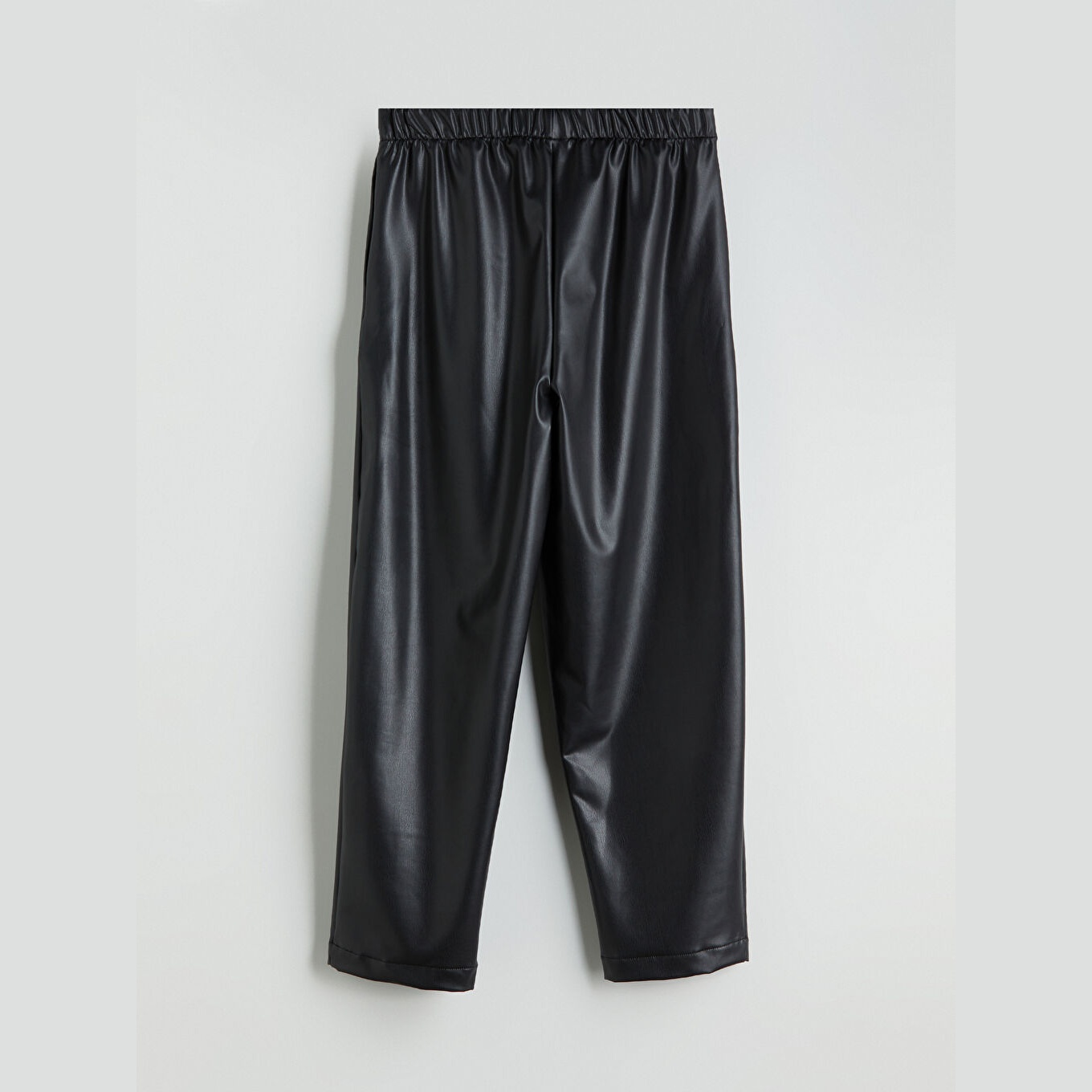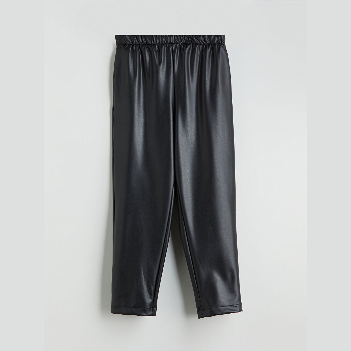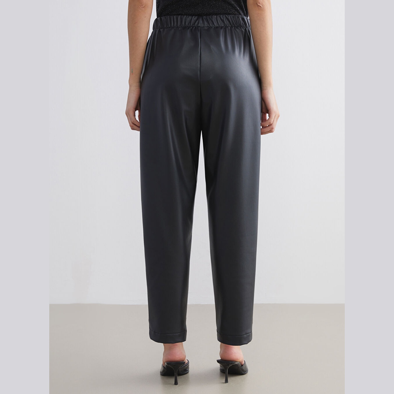 بنطال نسائي بخصر مطاطي – أسود بمظهر الجلد (قصة مريحة، أرجل ضيقة، خامة جلد صناعي مرنة)