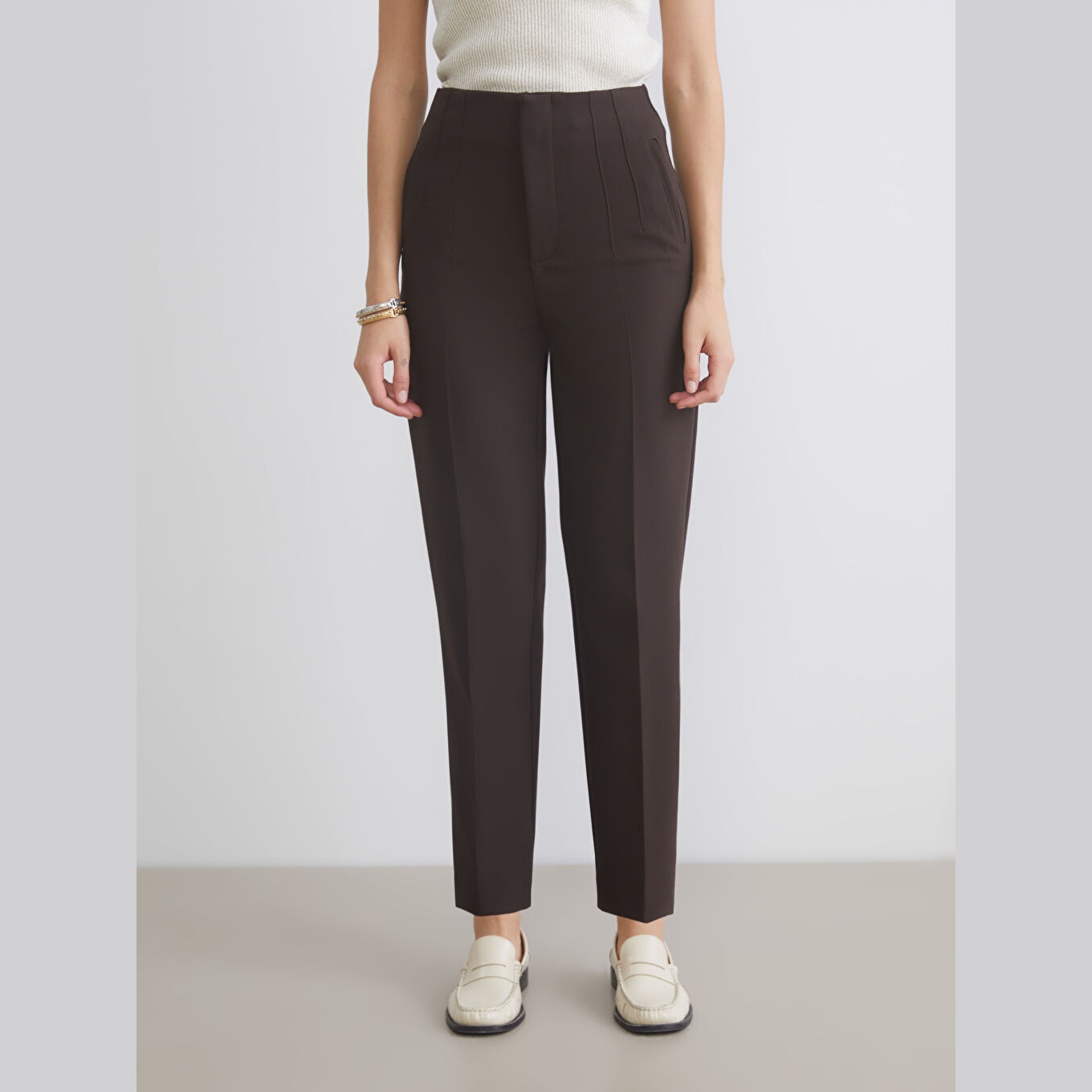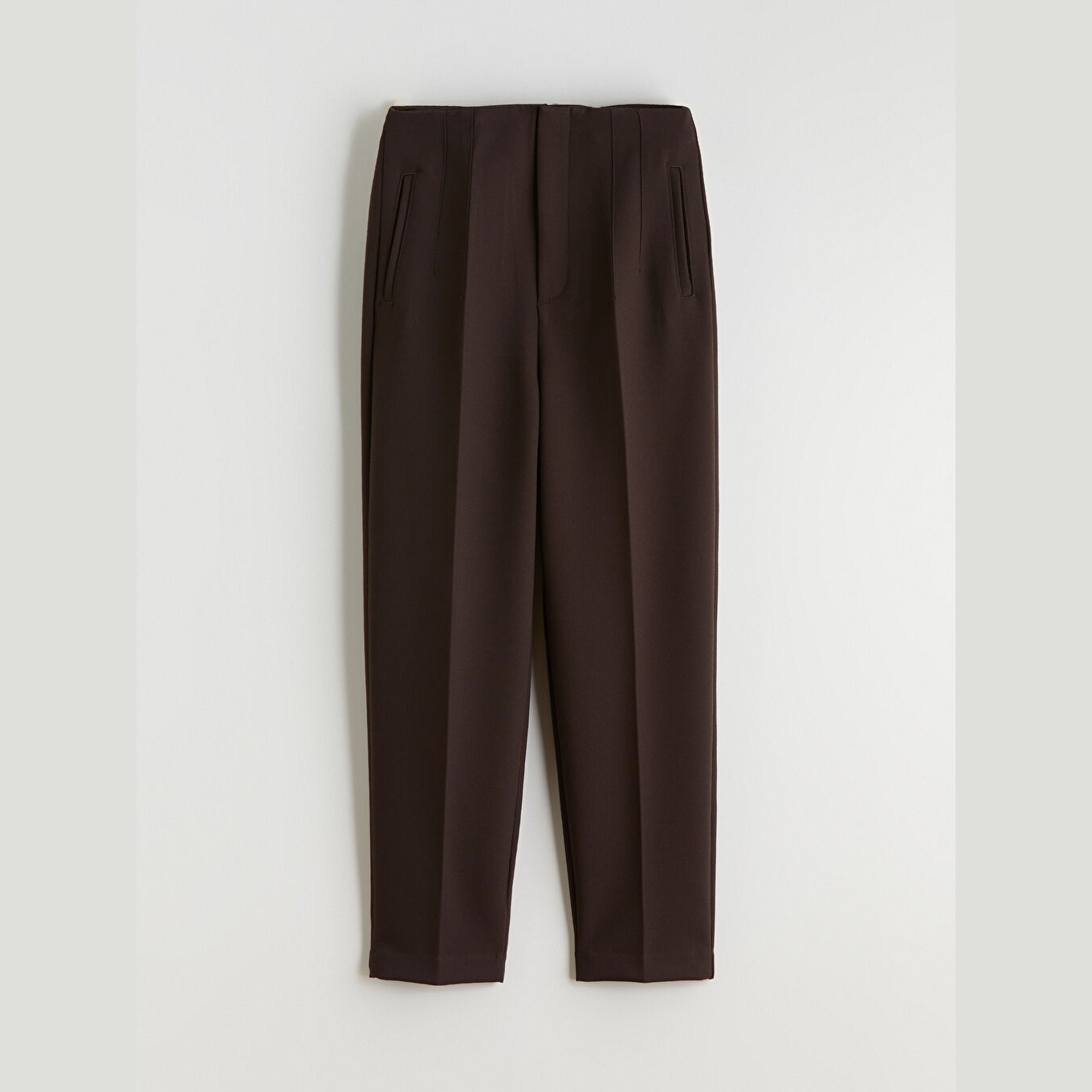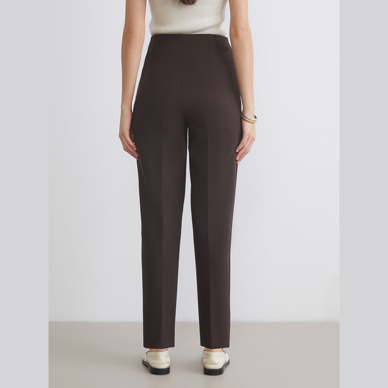 بنطال نسائي بخصر عالي – بني بقصة جزرة (قصة مريحة، أرجل ضيقة، خامة بولي فيسكوز مرنة)