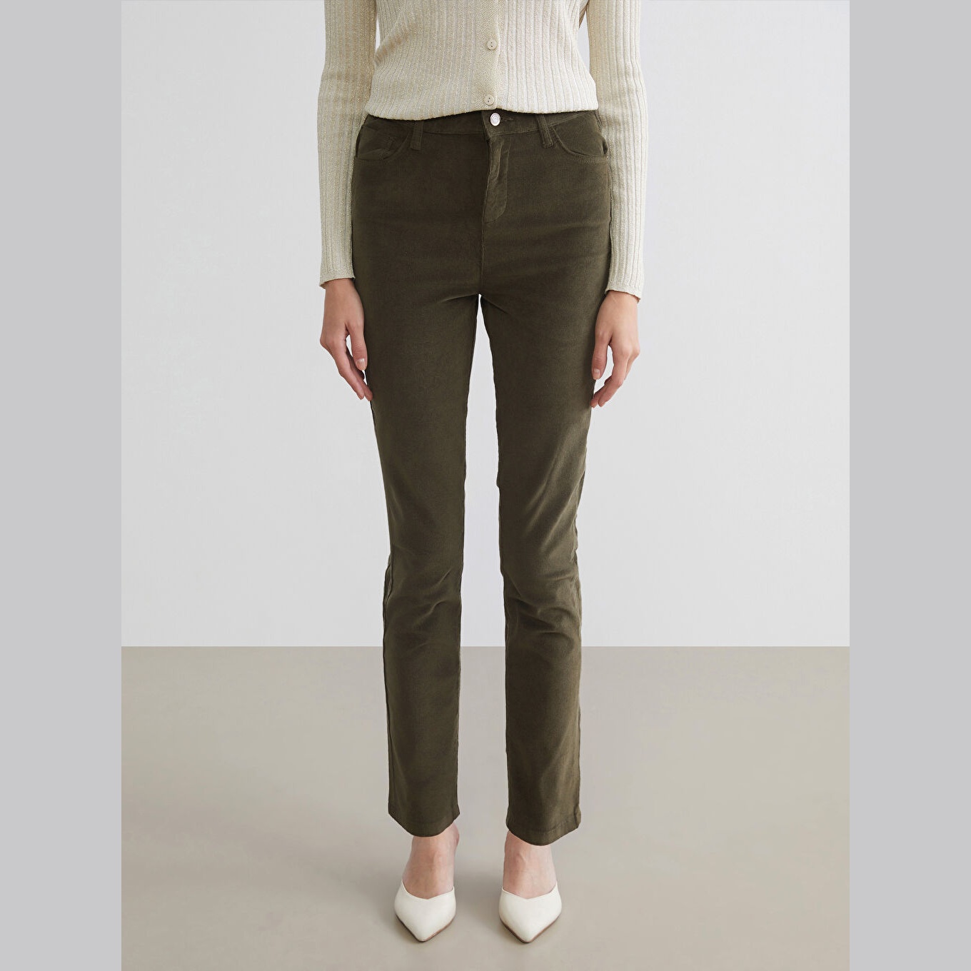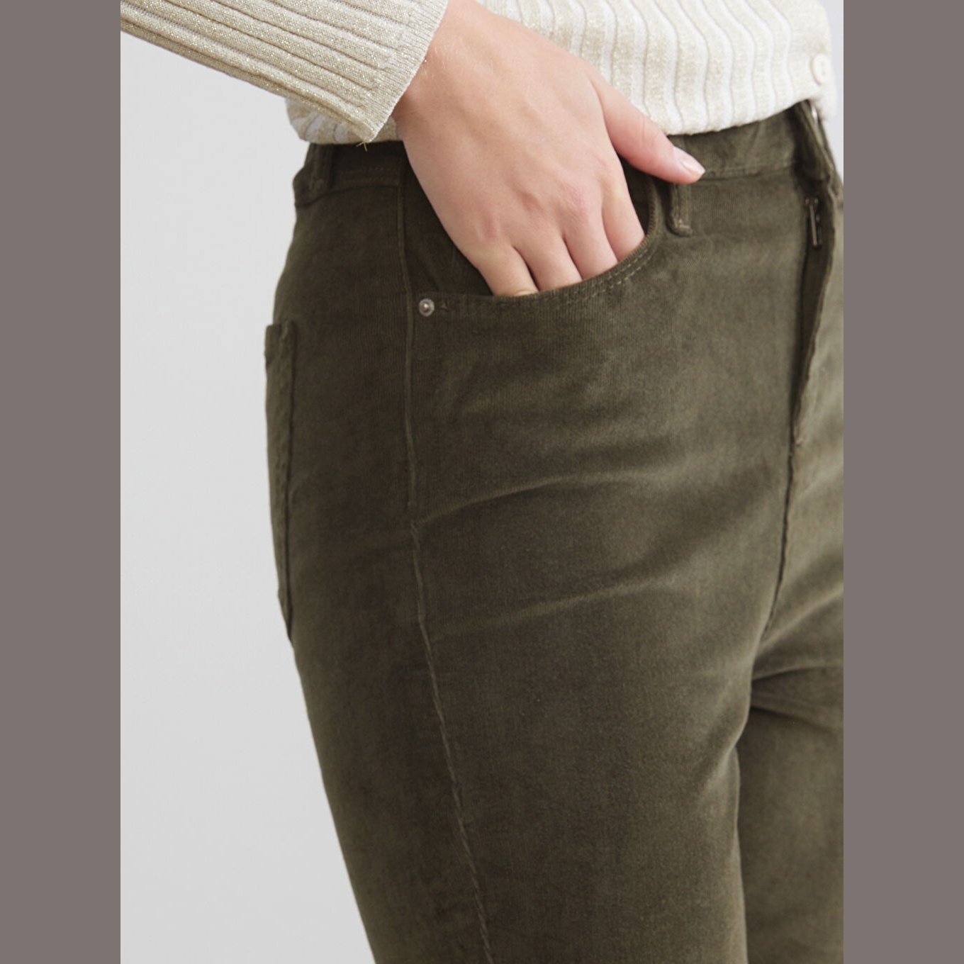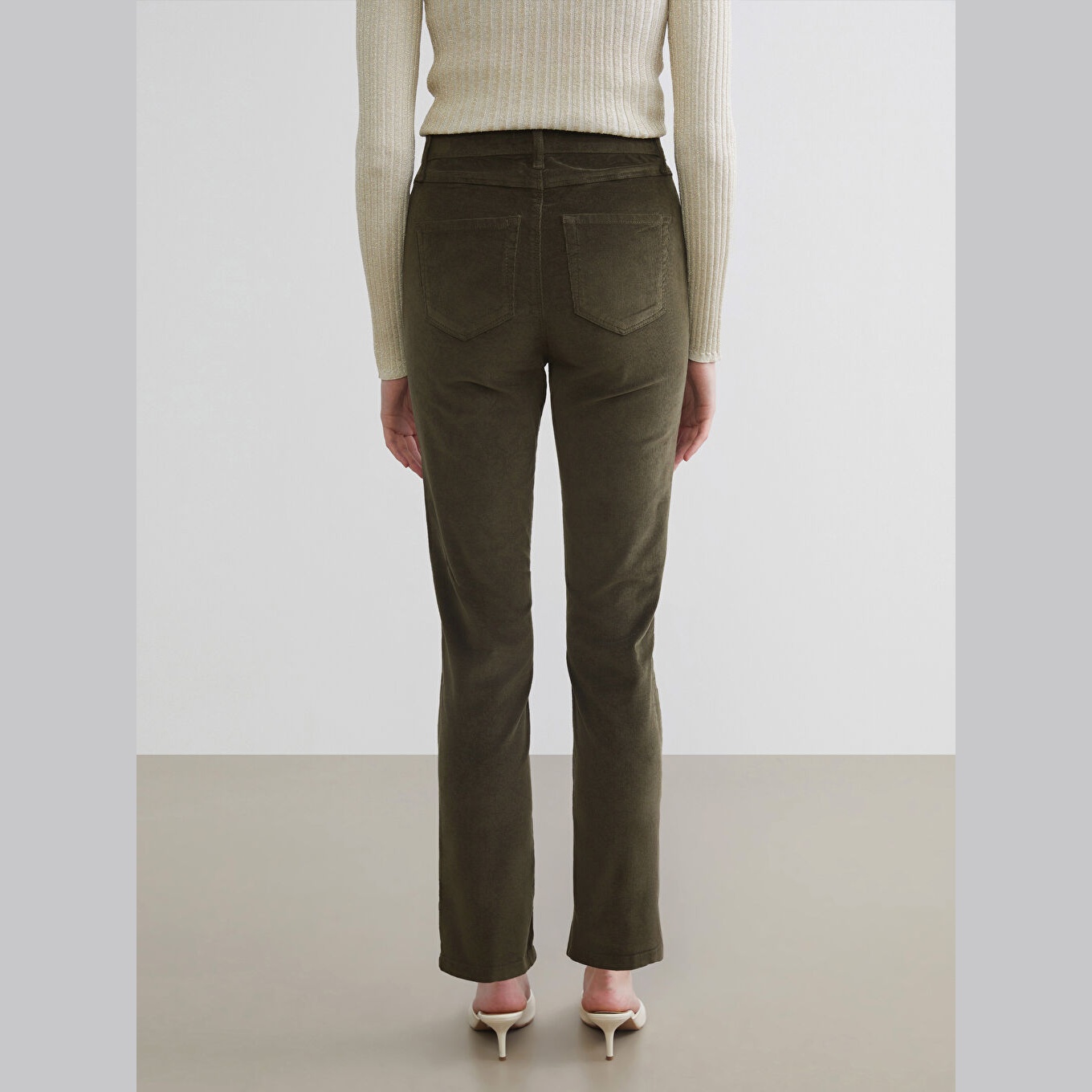 بنطال نسائي بخصر عالي – زيتي بقماش كاديفة مخططة (قصة ضيقة، أرجل ضيقة، خامة قطنية سميكة)