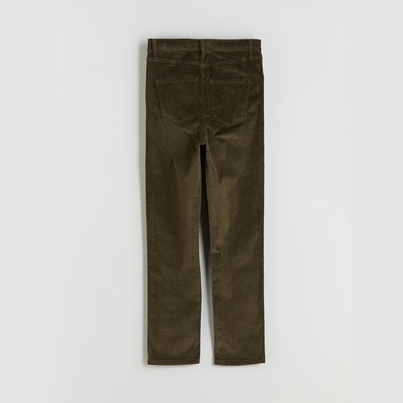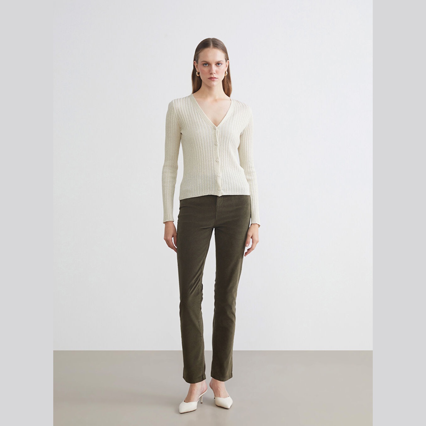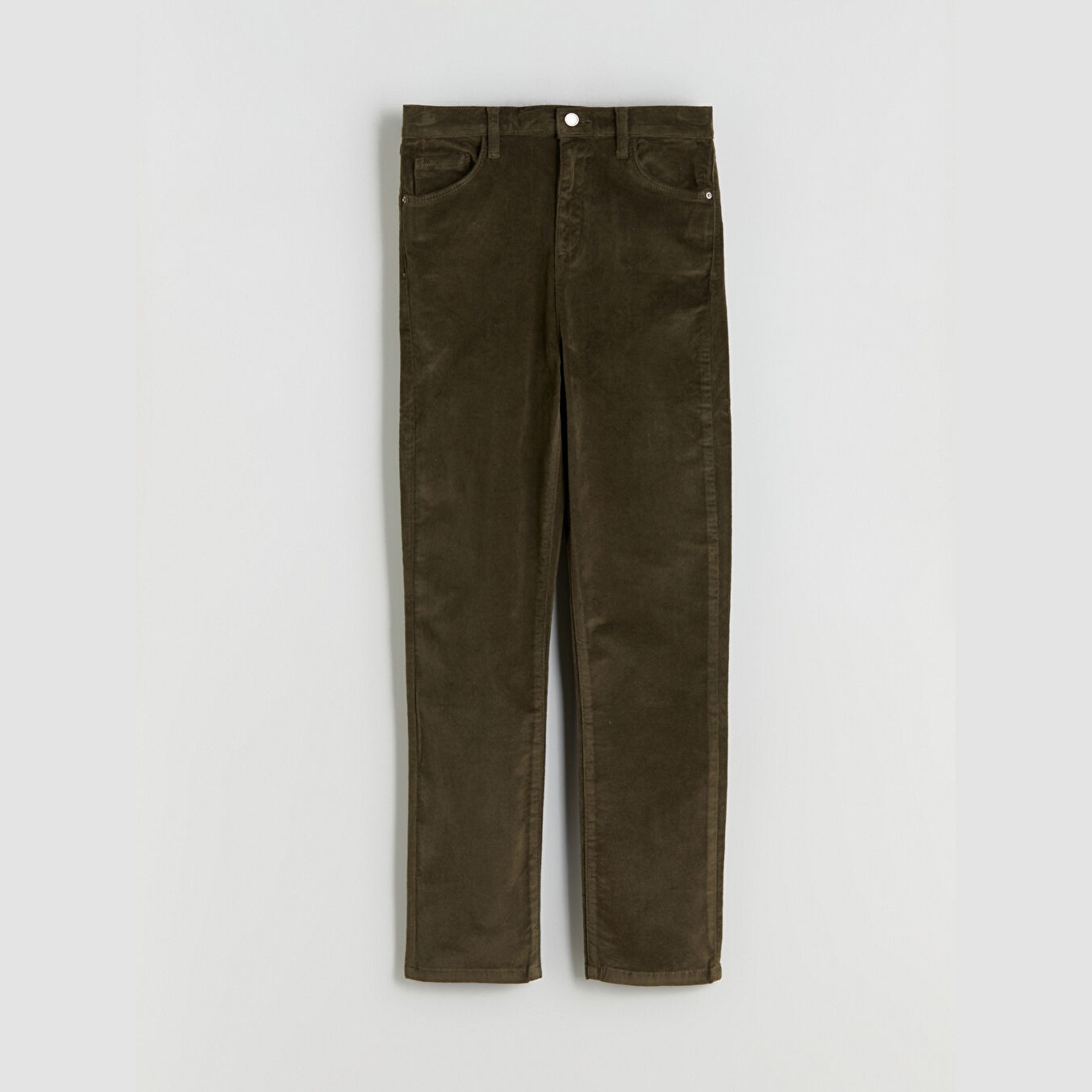 بنطال نسائي بخصر عالي – زيتي بقماش كاديفة مخططة (قصة ضيقة، أرجل ضيقة، خامة قطنية سميكة)