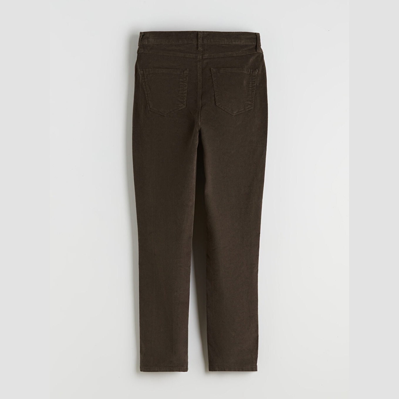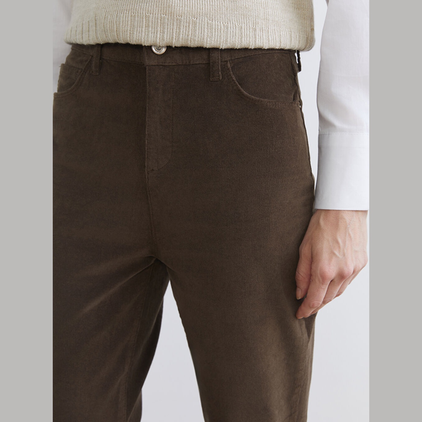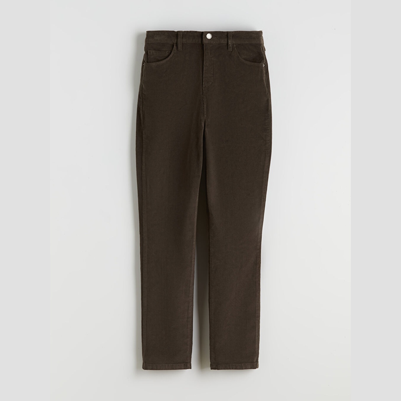 بنطال نسائي بخصر عالي – بني بقماش كاديفة مخططة (قصة ضيقة، أرجل ضيقة، خامة قطنية سميكة)