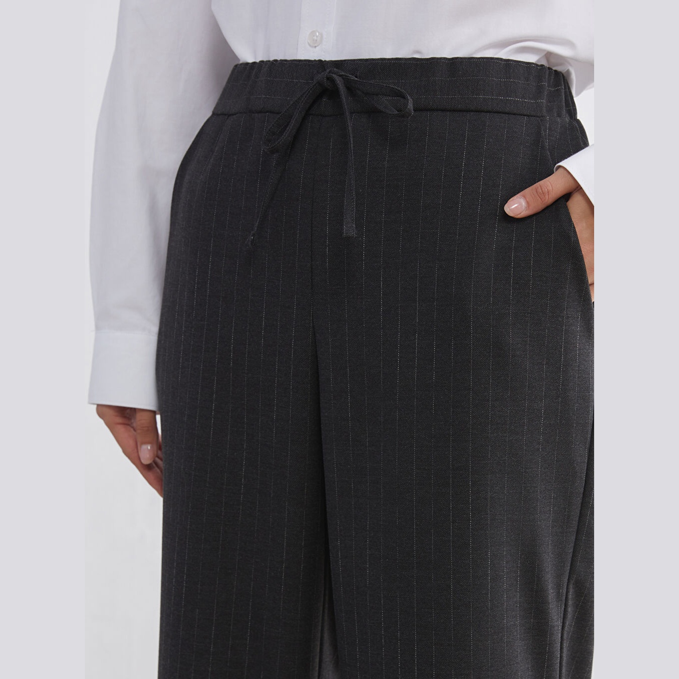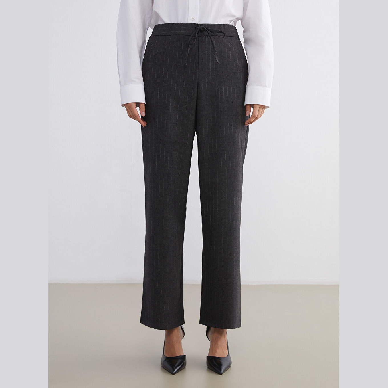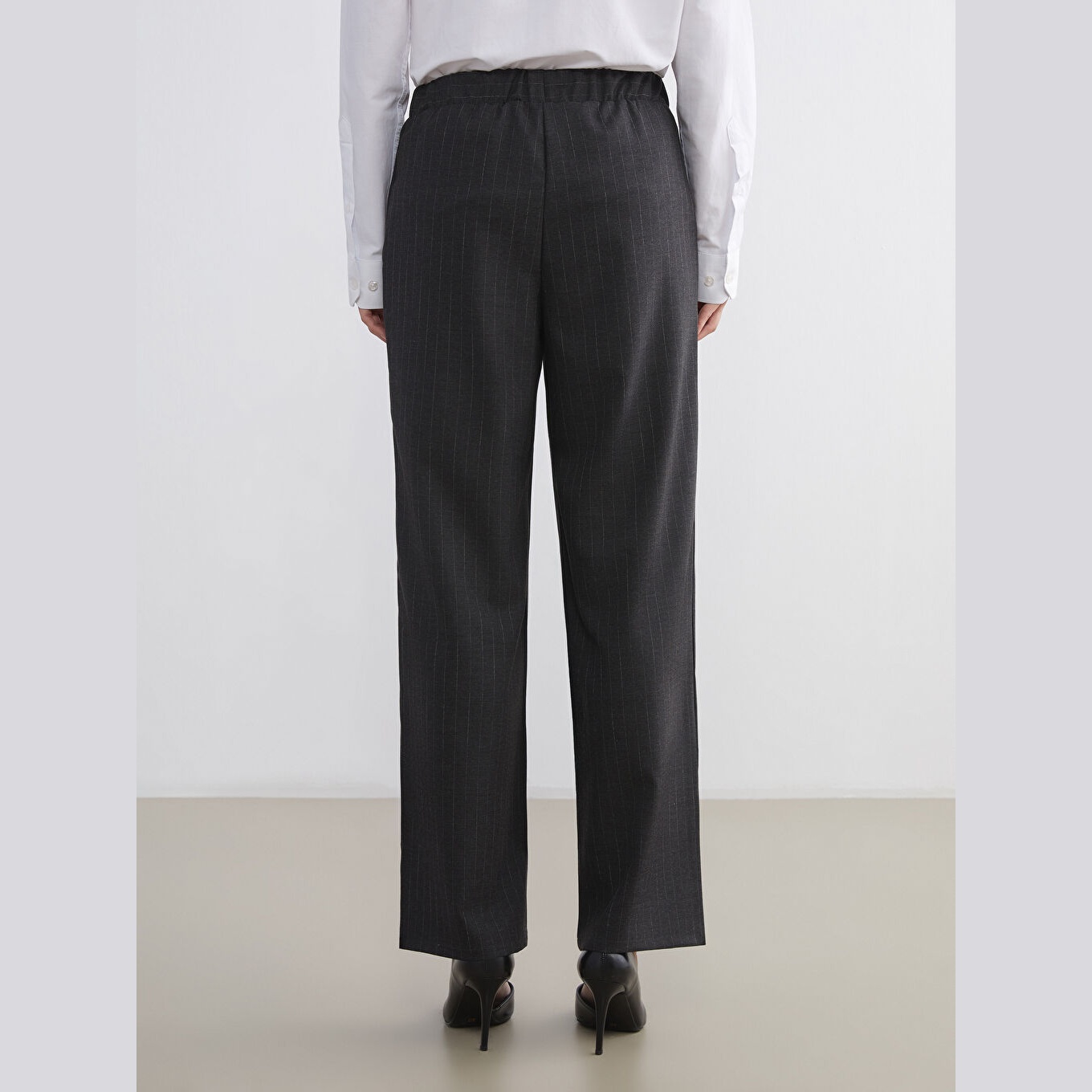 بنطال نسائي بخصر مطاطي – رمادي مخطط بقماش جبردين (قصة واسعة، أرجل عريضة، خامة بولي فيسكوز مرنة)