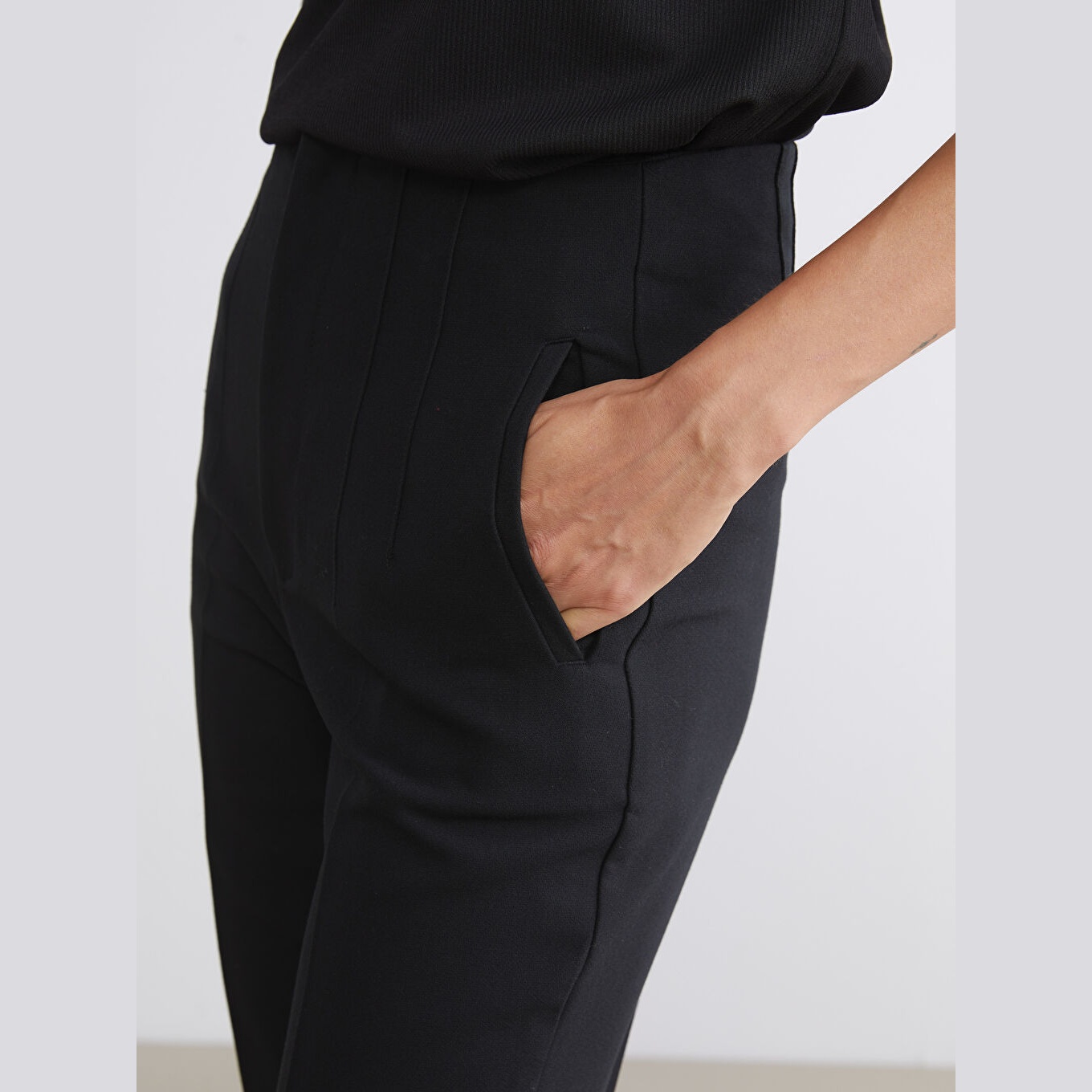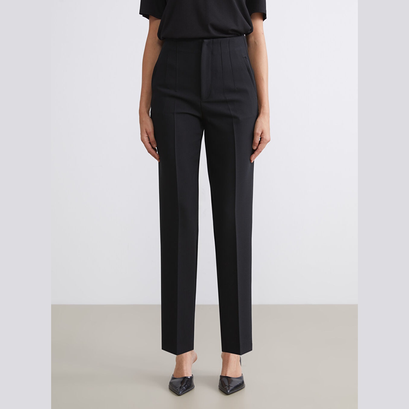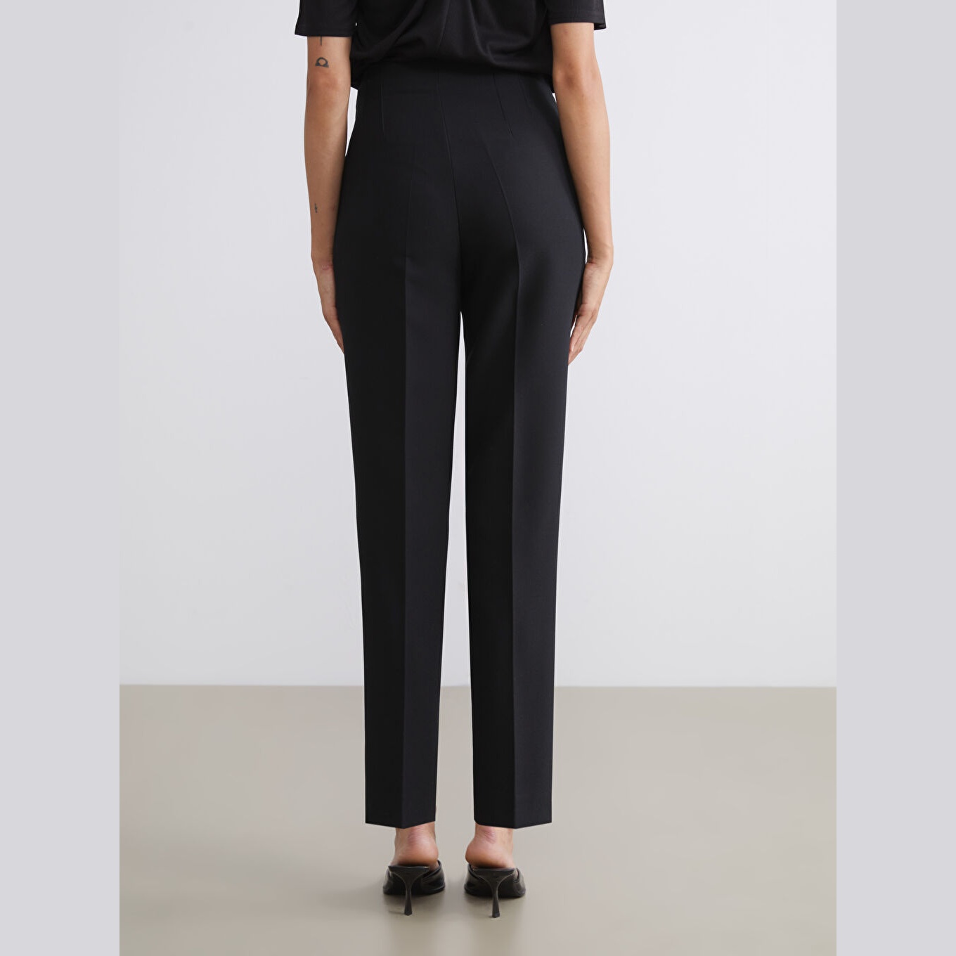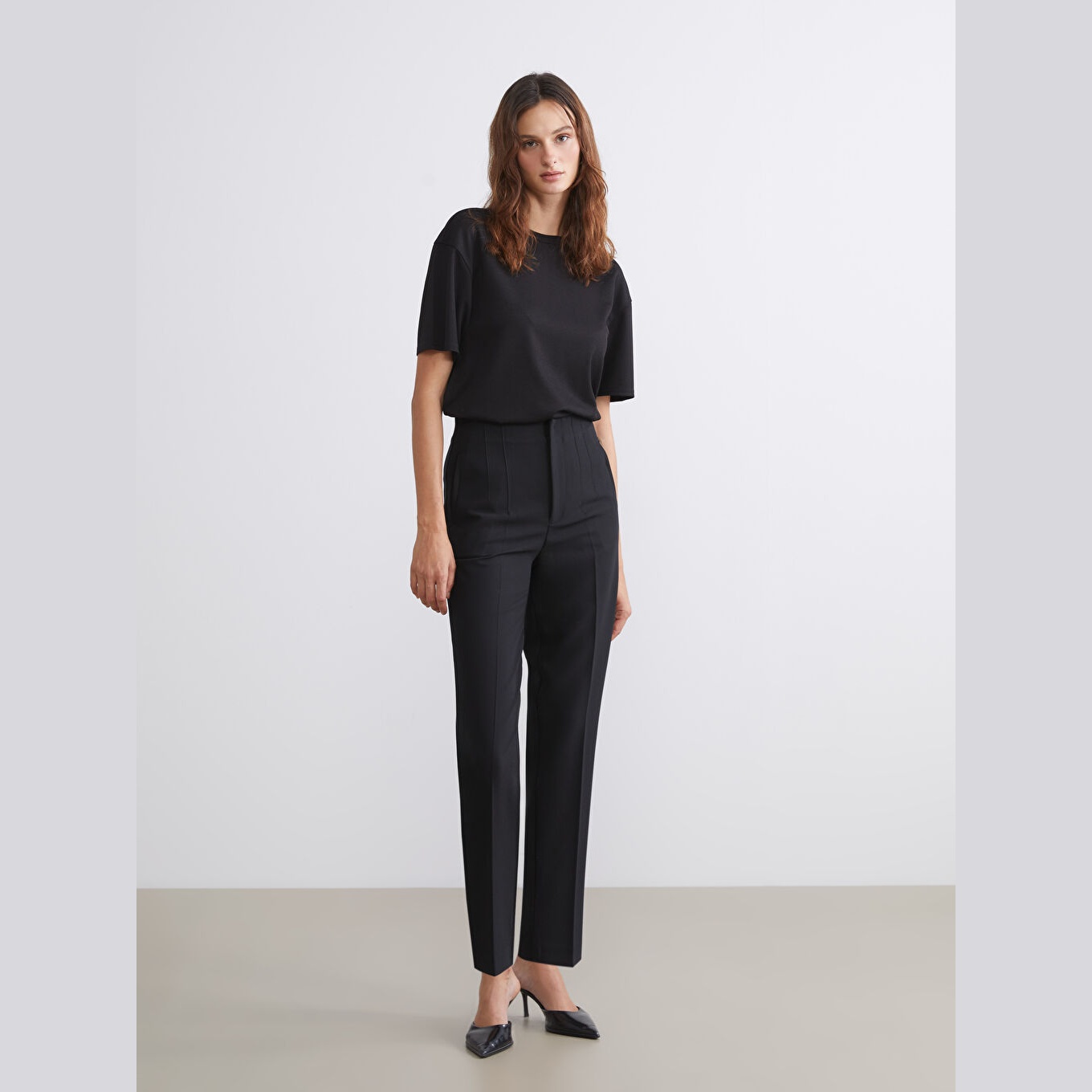 بنطال نسائي بخصر عالي – أسود بقصة ضيقة وطيات أمامية (قماش بولي فيسكوز مرن، أرجل مدببة)