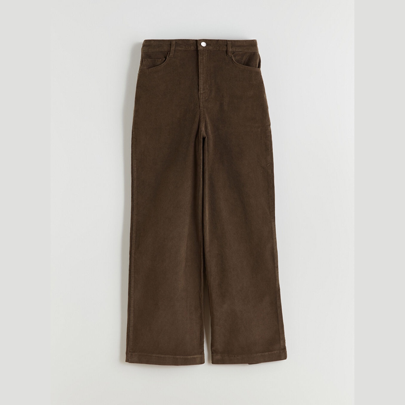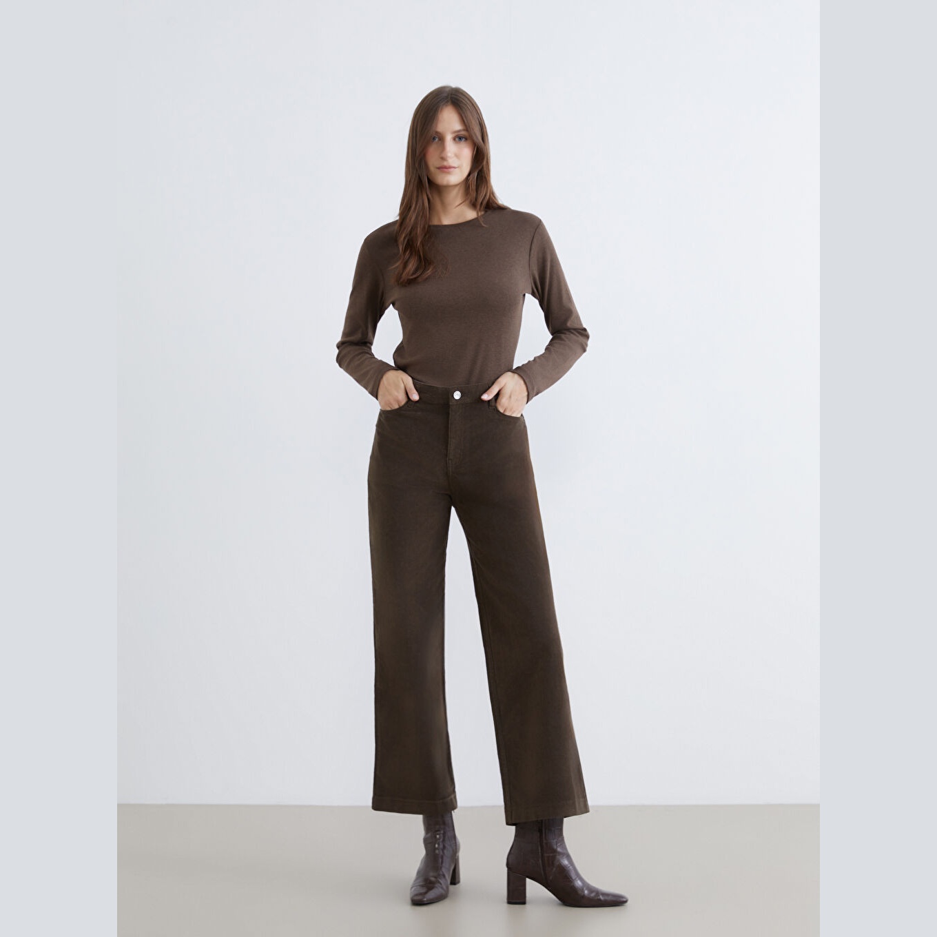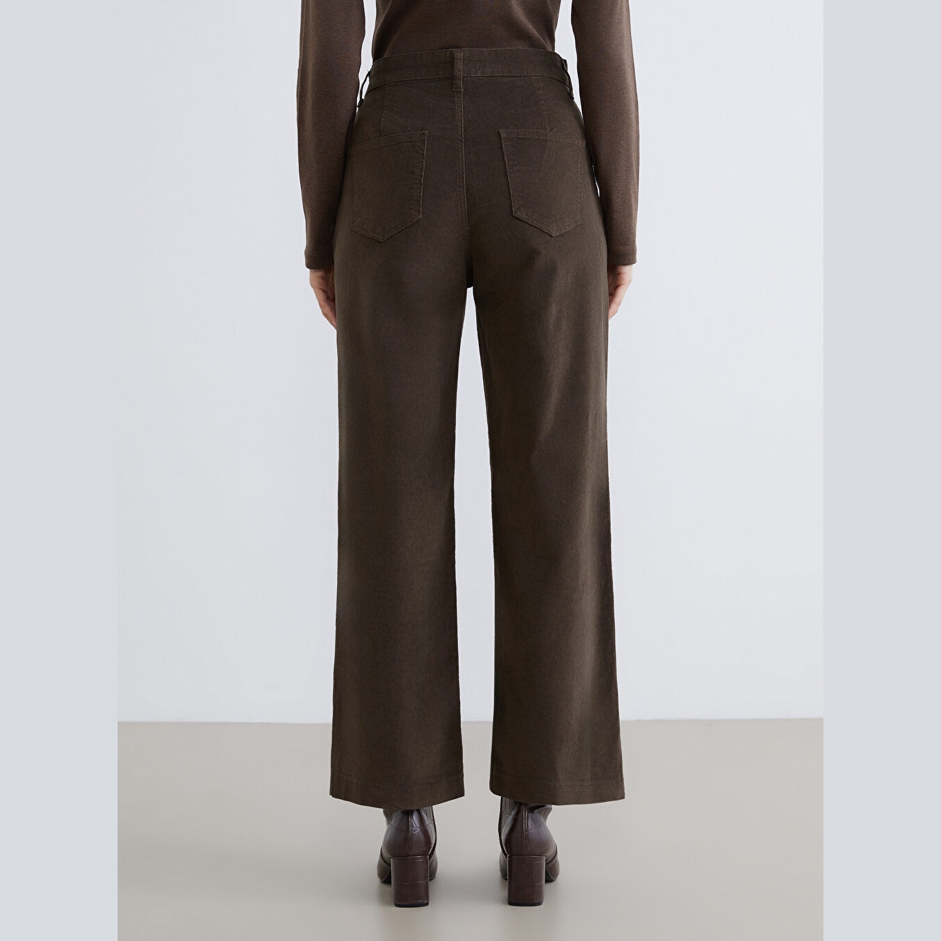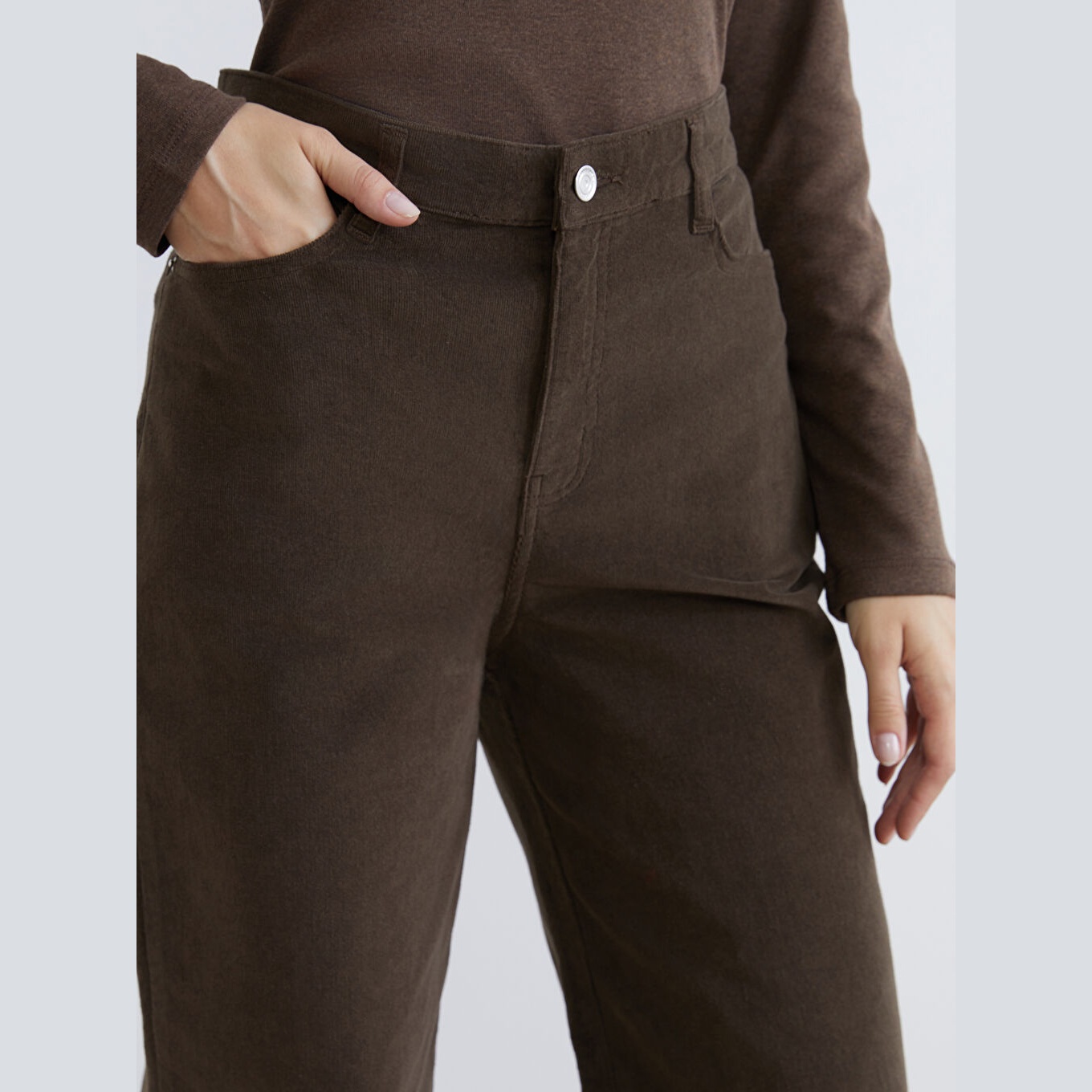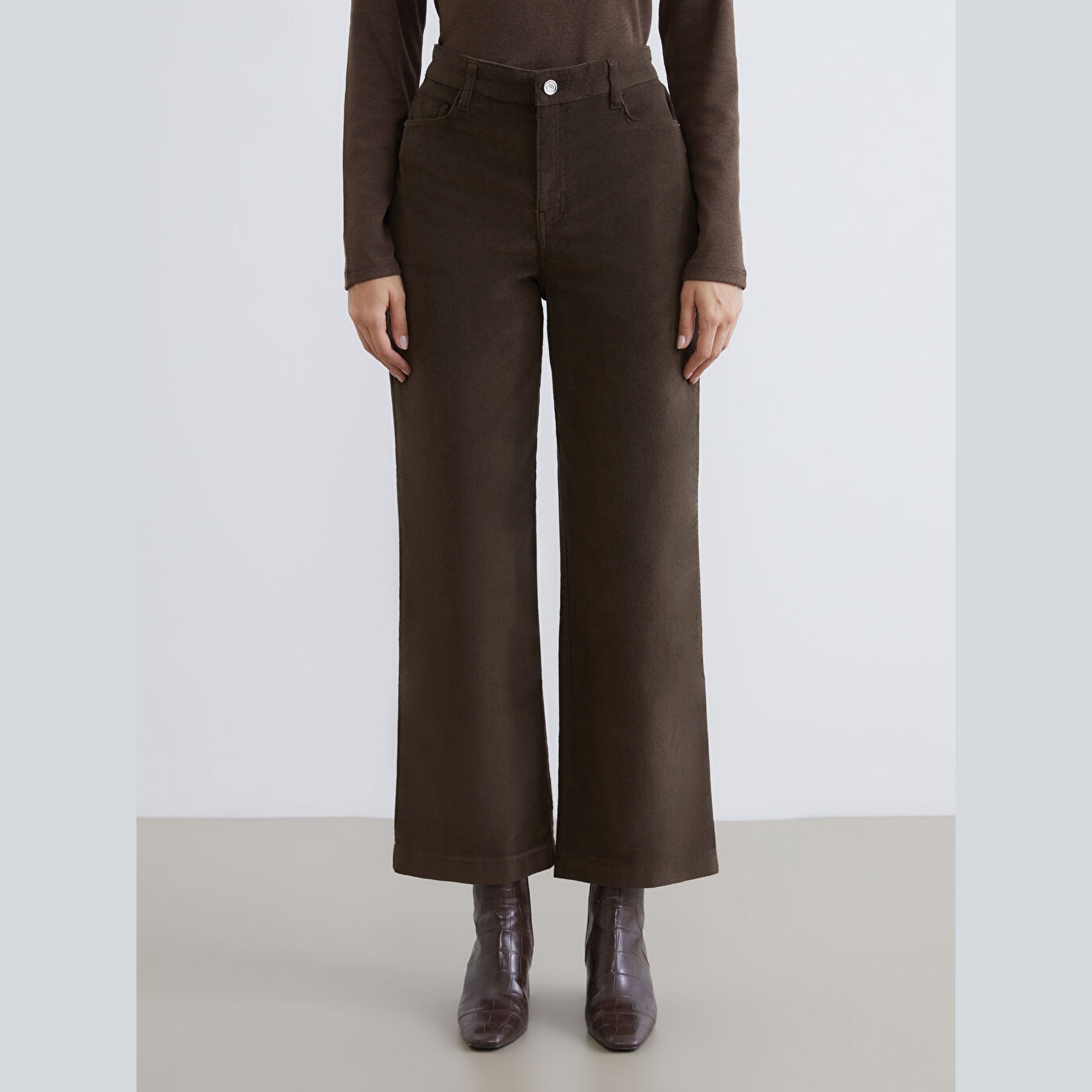 بنطال نسائي بخصر عالي – بني بقماش كاديفة سميك (قصة واسعة، أرجل عريضة، خامة قطنية دافئة)