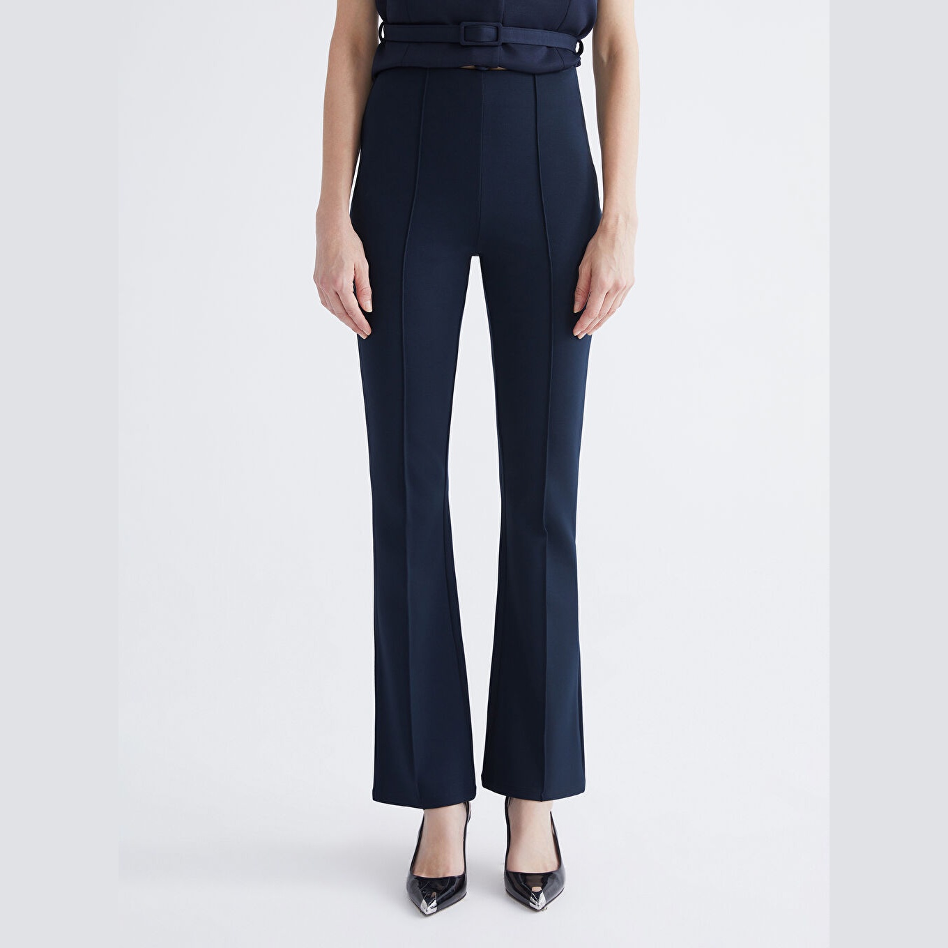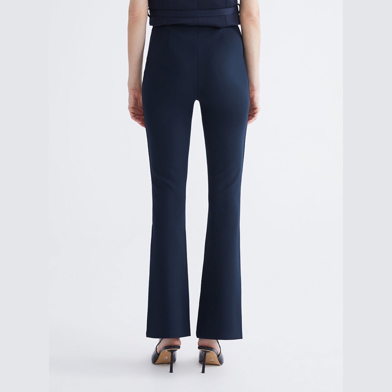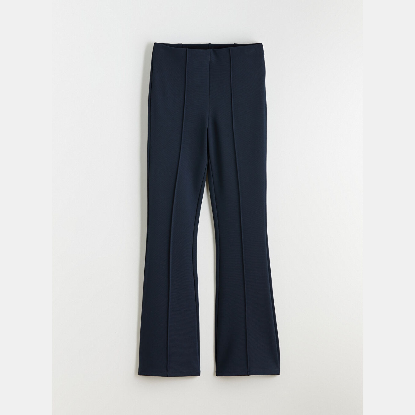 بنطال نسائي بخصر مطاطي – كحلي بقصة سوبر ضيقة وأرجل إسبانية (قماش بولي فيسكوز مرن، تصميم أنثوي)