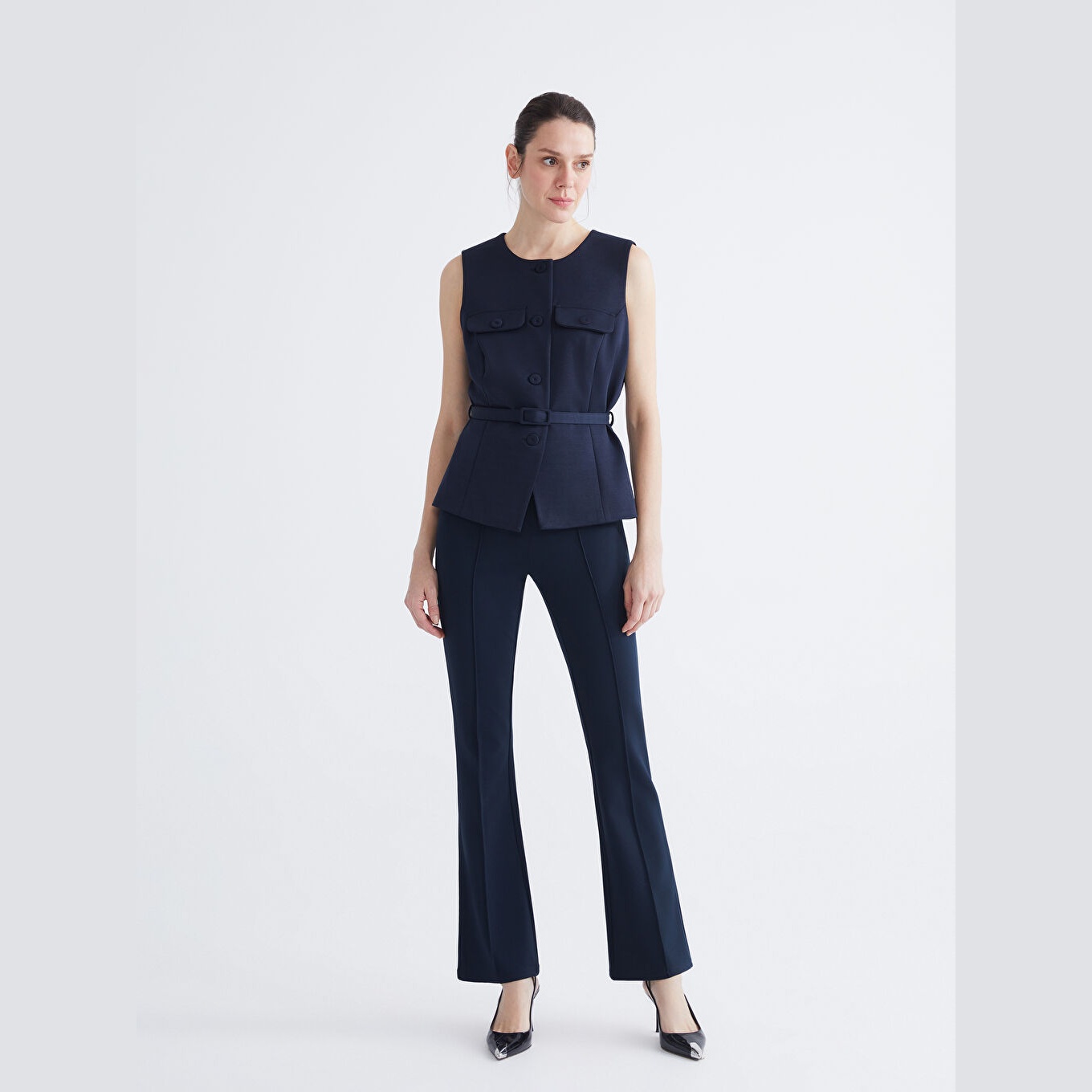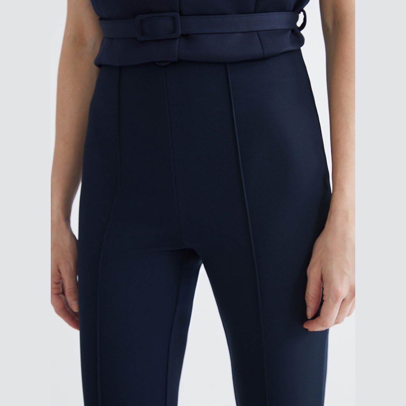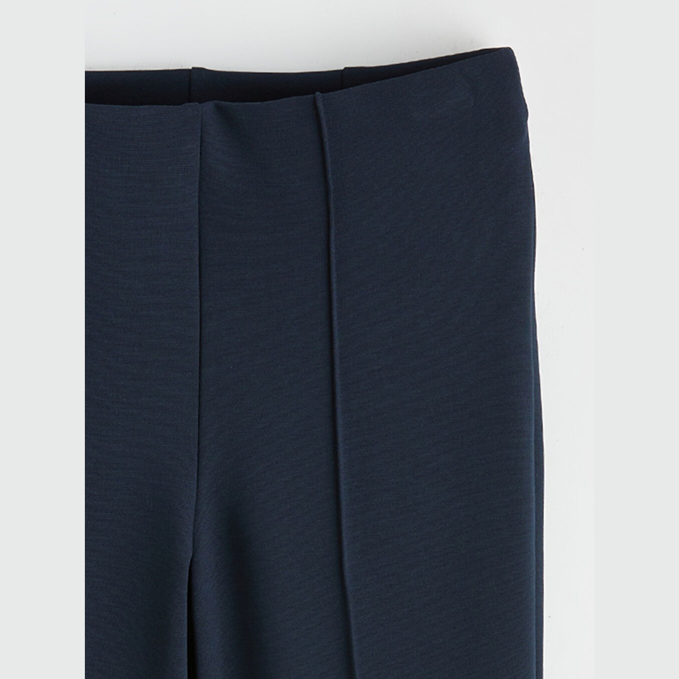 بنطال نسائي بخصر مطاطي – كحلي بقصة سوبر ضيقة وأرجل إسبانية (قماش بولي فيسكوز مرن، تصميم أنثوي)