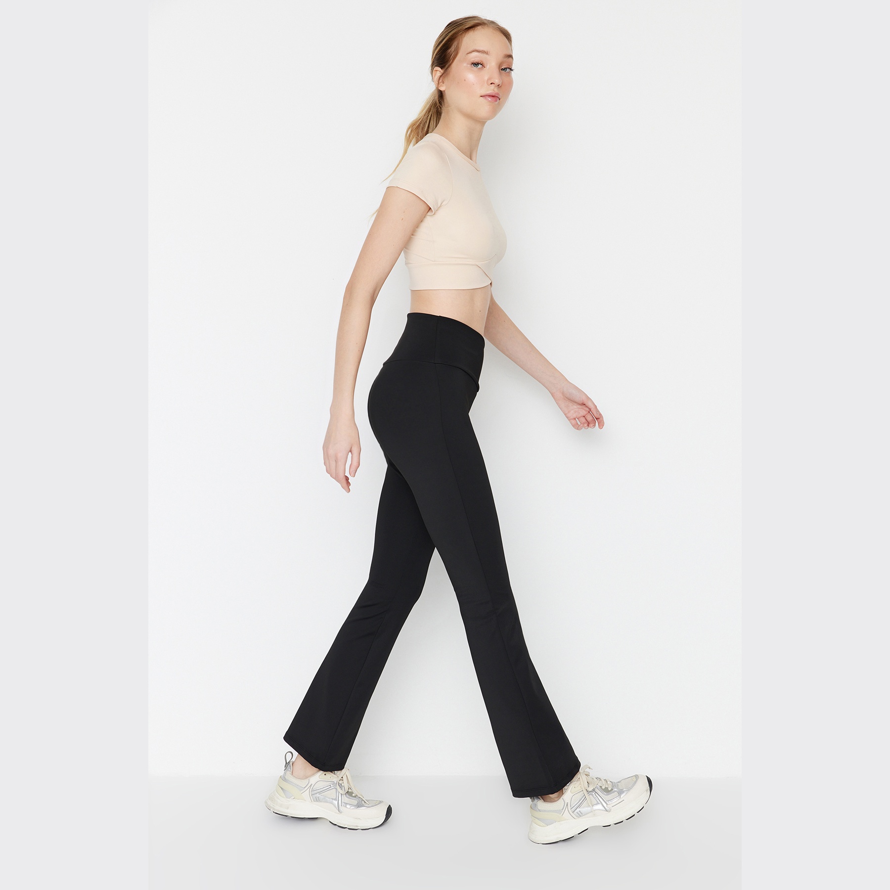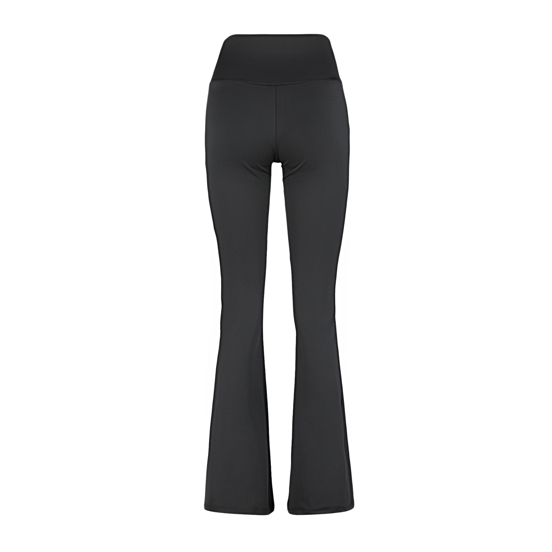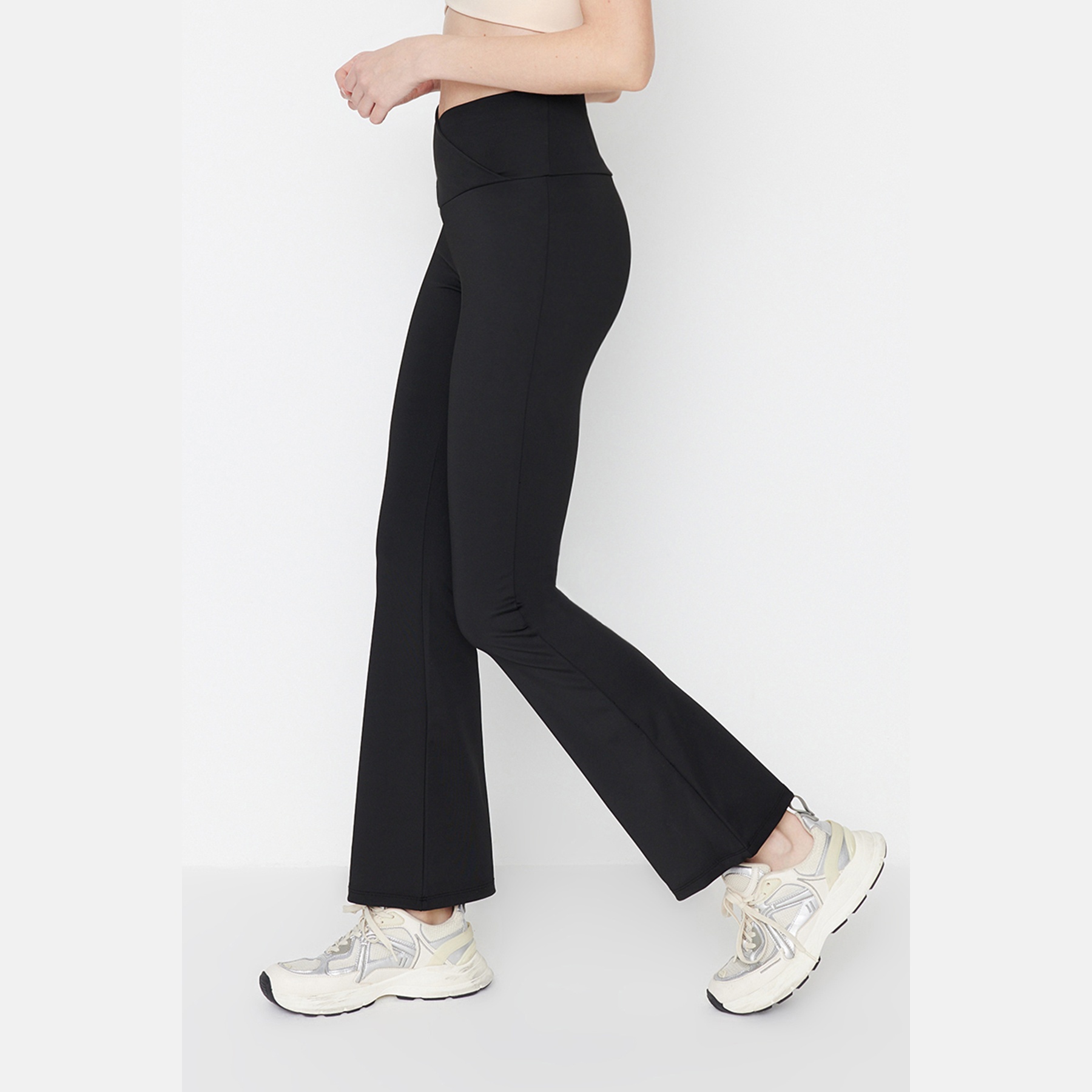 بنطال رياضي نسائي بلون أسود، مصنوع من خامة تريكو مطاطية بتركيبة بوليستر وإيلاستان، يتميز بخصر ملتف بكسرات أمامية تضيف لمسة أنثوية أنيقة، مع قصة Fitted تبرز القوام، وأرجل واسعة بأسلوب بنطال يوجا بفتحة إسبانية. تصميم مثالي للتمارين أو الإطلالات اليومية المريحة.