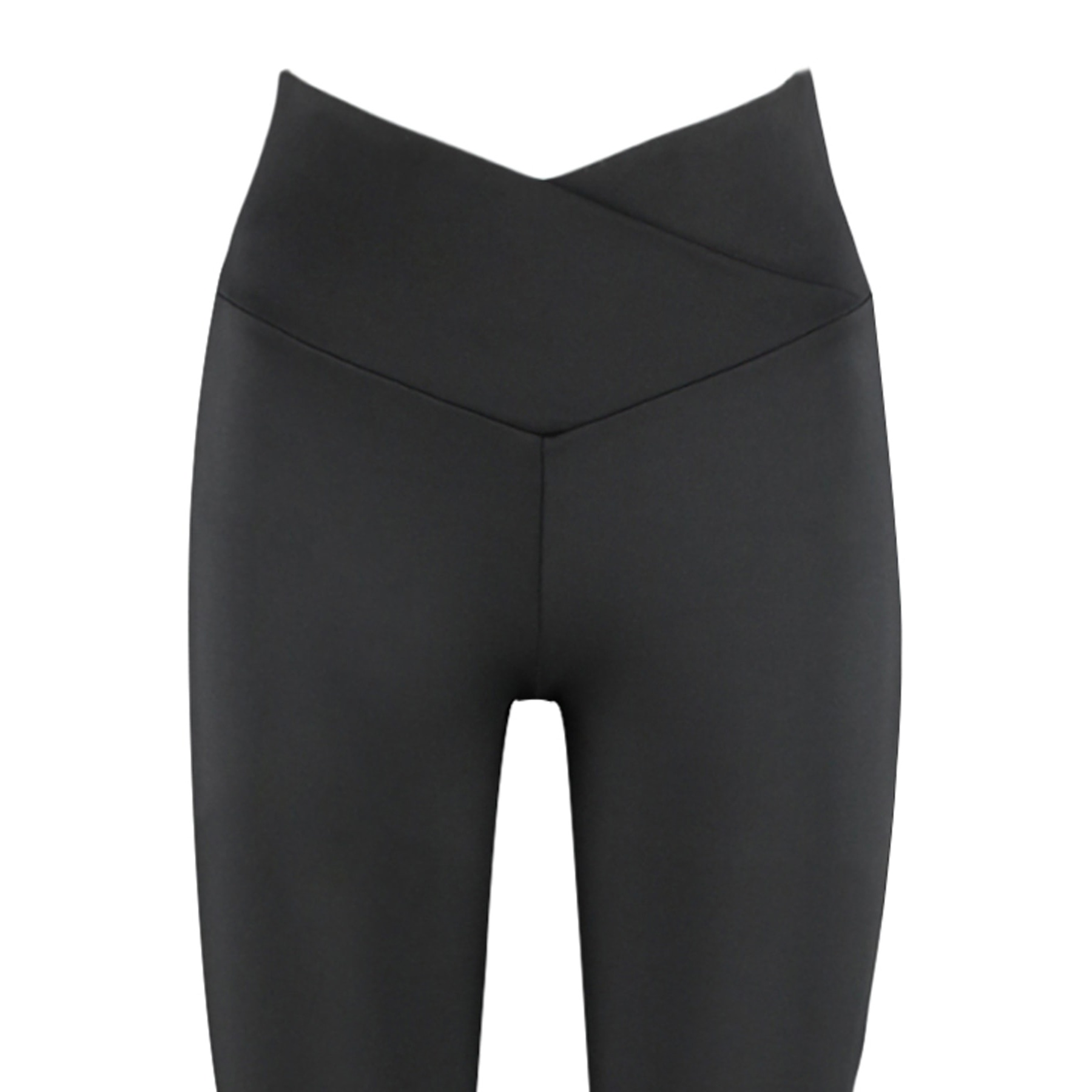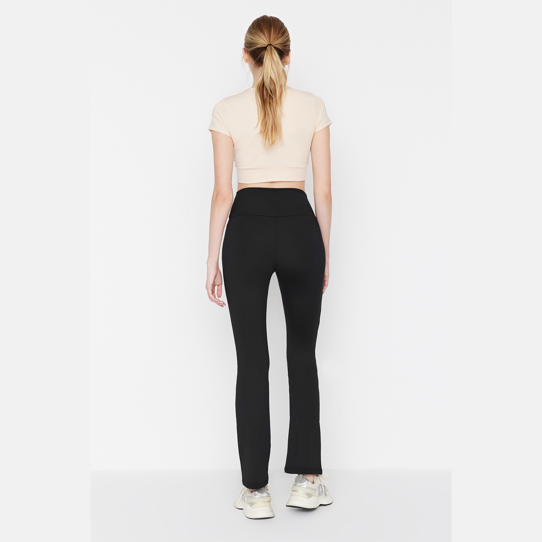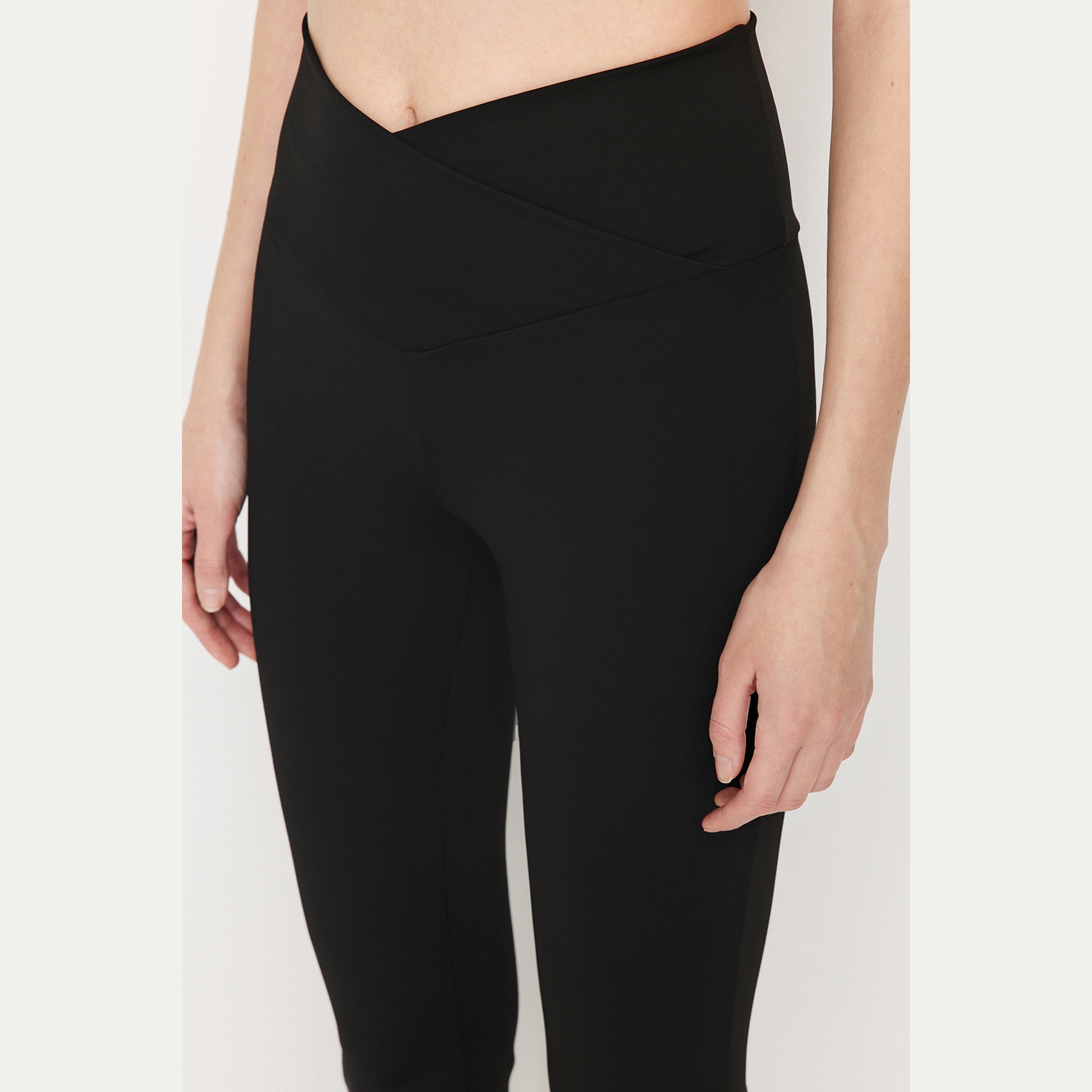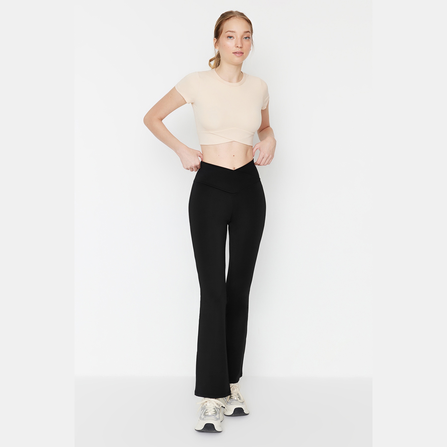 بنطال رياضي نسائي بلون أسود، مصنوع من خامة تريكو مطاطية بتركيبة بوليستر وإيلاستان، يتميز بخصر ملتف بكسرات أمامية تضيف لمسة أنثوية أنيقة، مع قصة Fitted تبرز القوام، وأرجل واسعة بأسلوب بنطال يوجا بفتحة إسبانية. تصميم مثالي للتمارين أو الإطلالات اليومية المريحة.