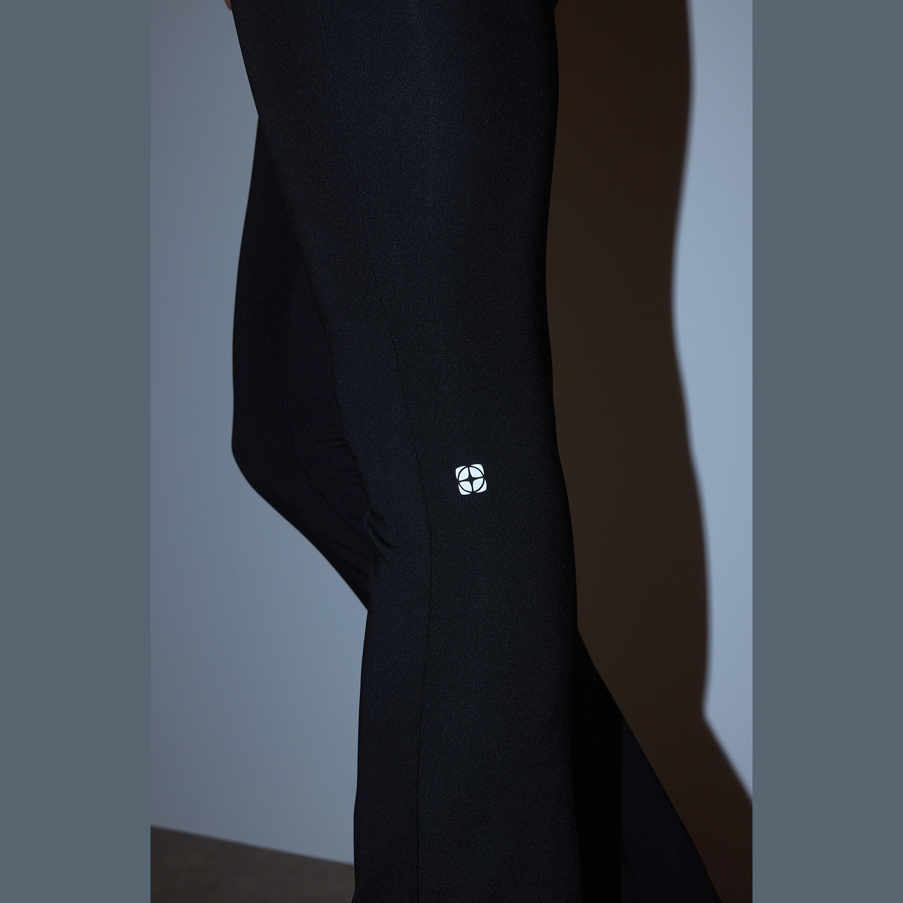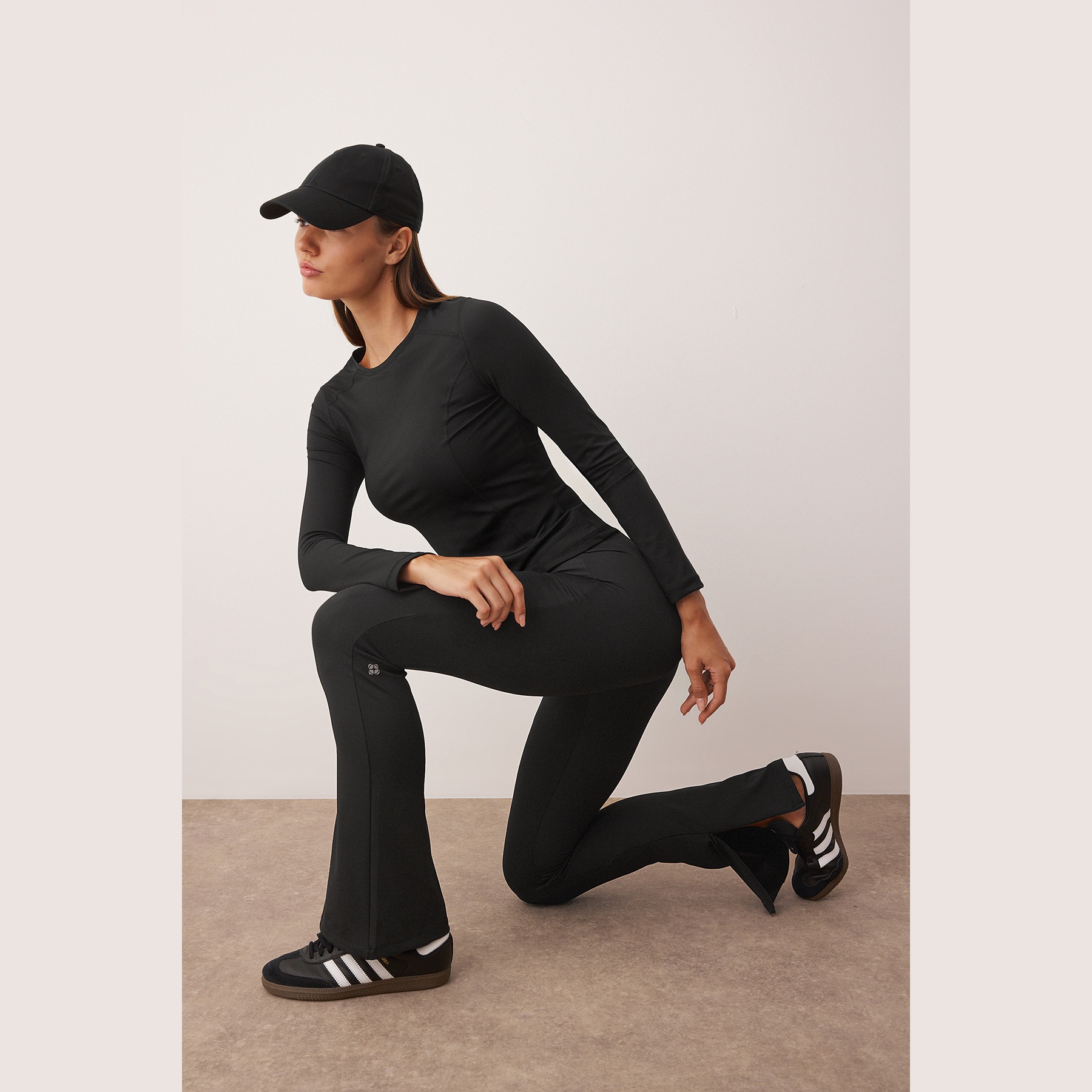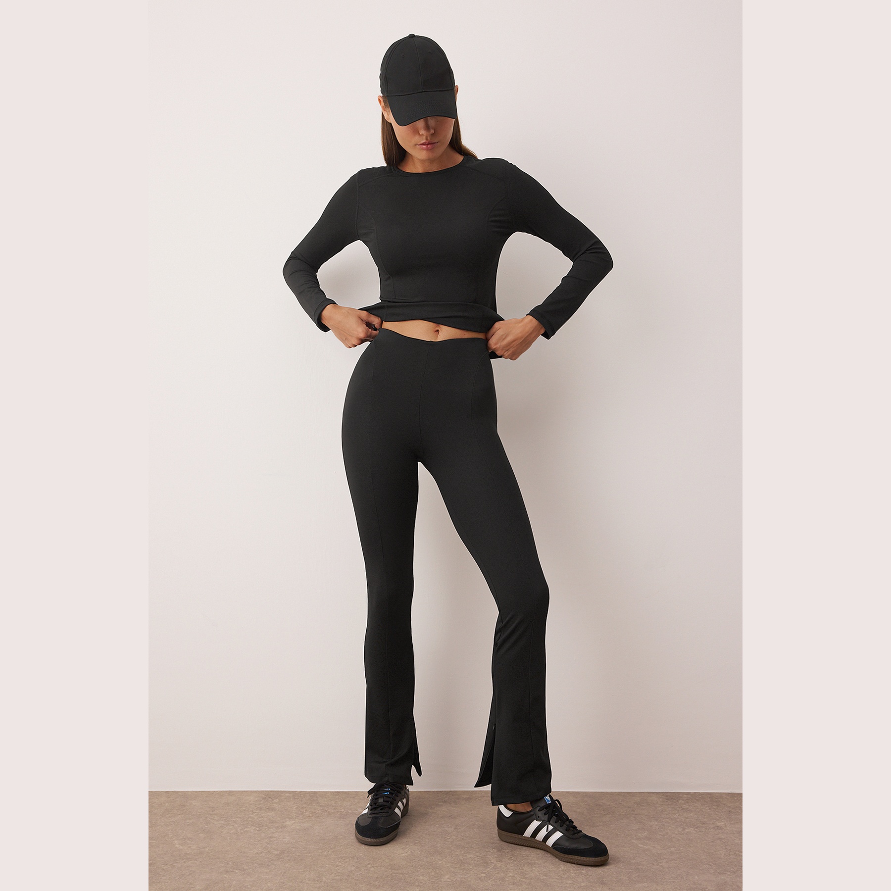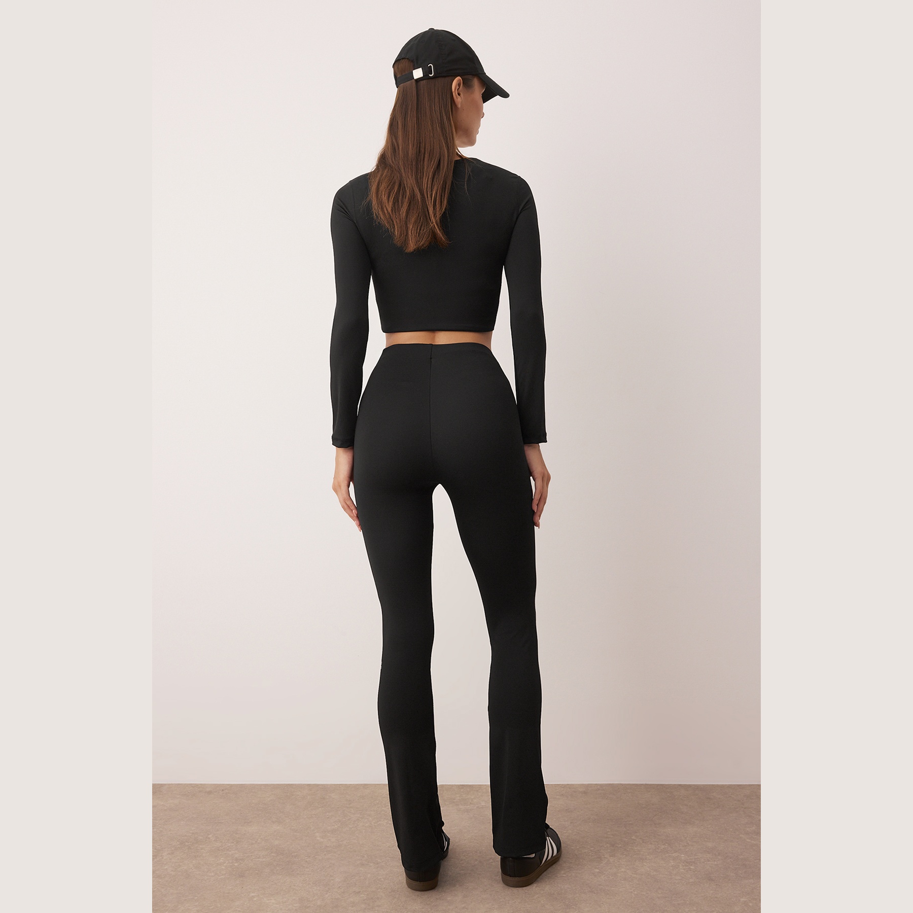 بنطال رياضي نسائي بلون أسود، مصنوع من خامة تريكو مطاطية بتركيبة بوليستر وإيلاستان، يتميز بقصة Flare واسعة من الأسفل تمنح انسيابية وأناقة، مع خصر مرتفع يوفر دعمًا وراحة أثناء الحركة. تصميم مثالي للتمارين أو الإطلالات اليومية المحتشمة.