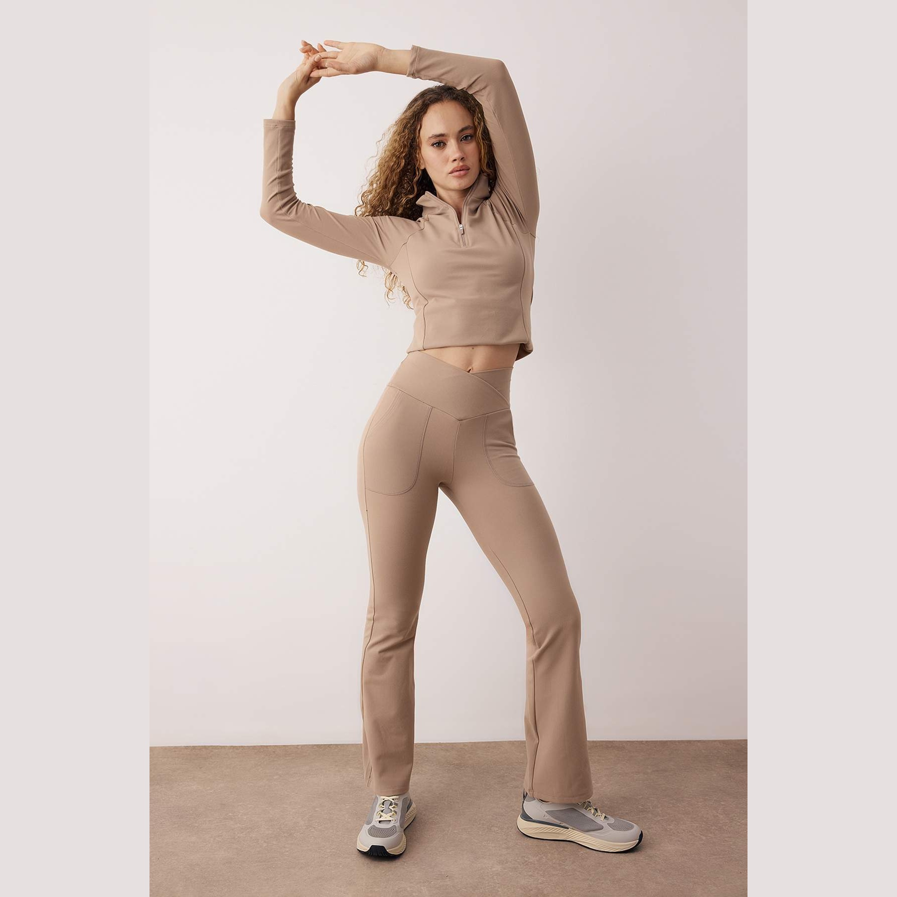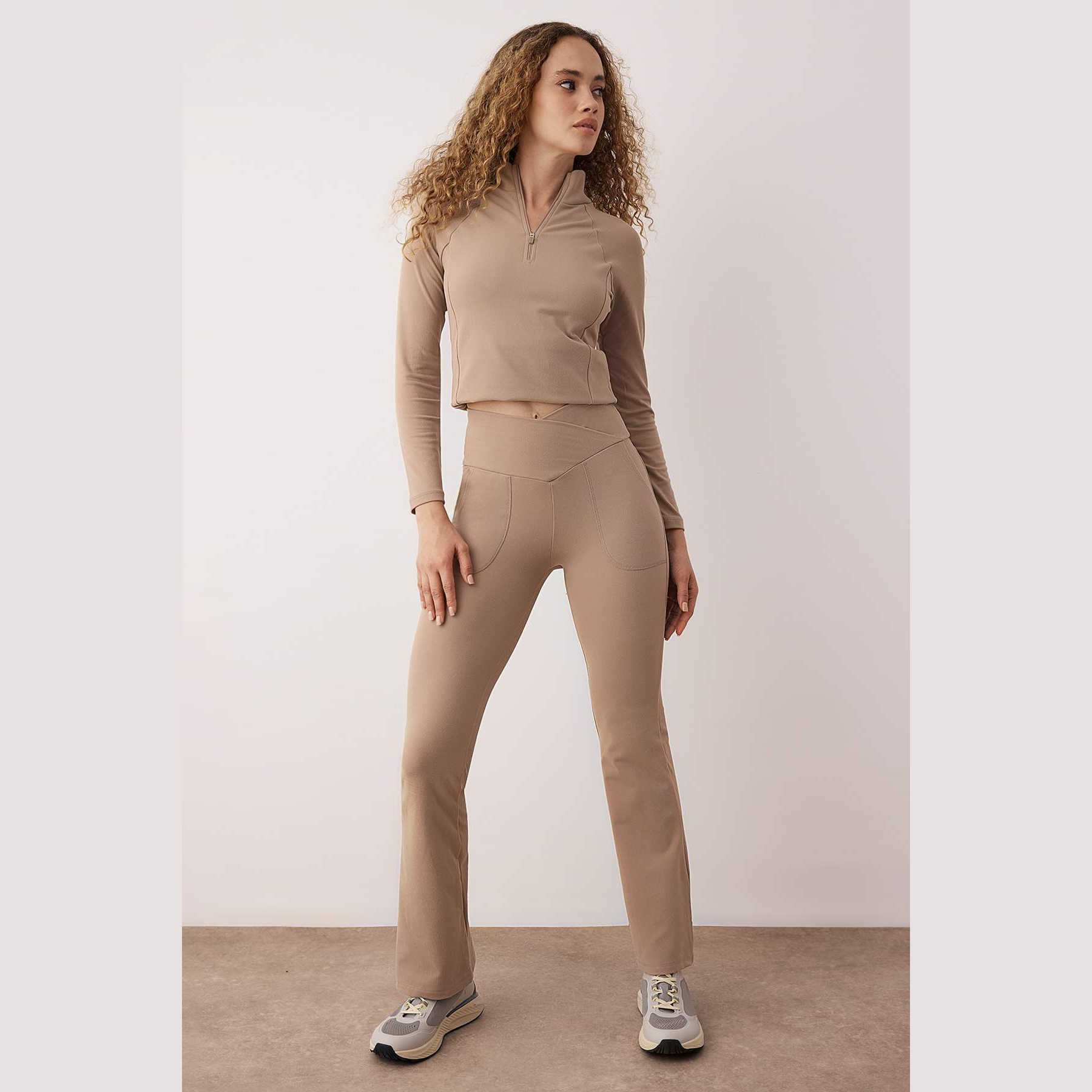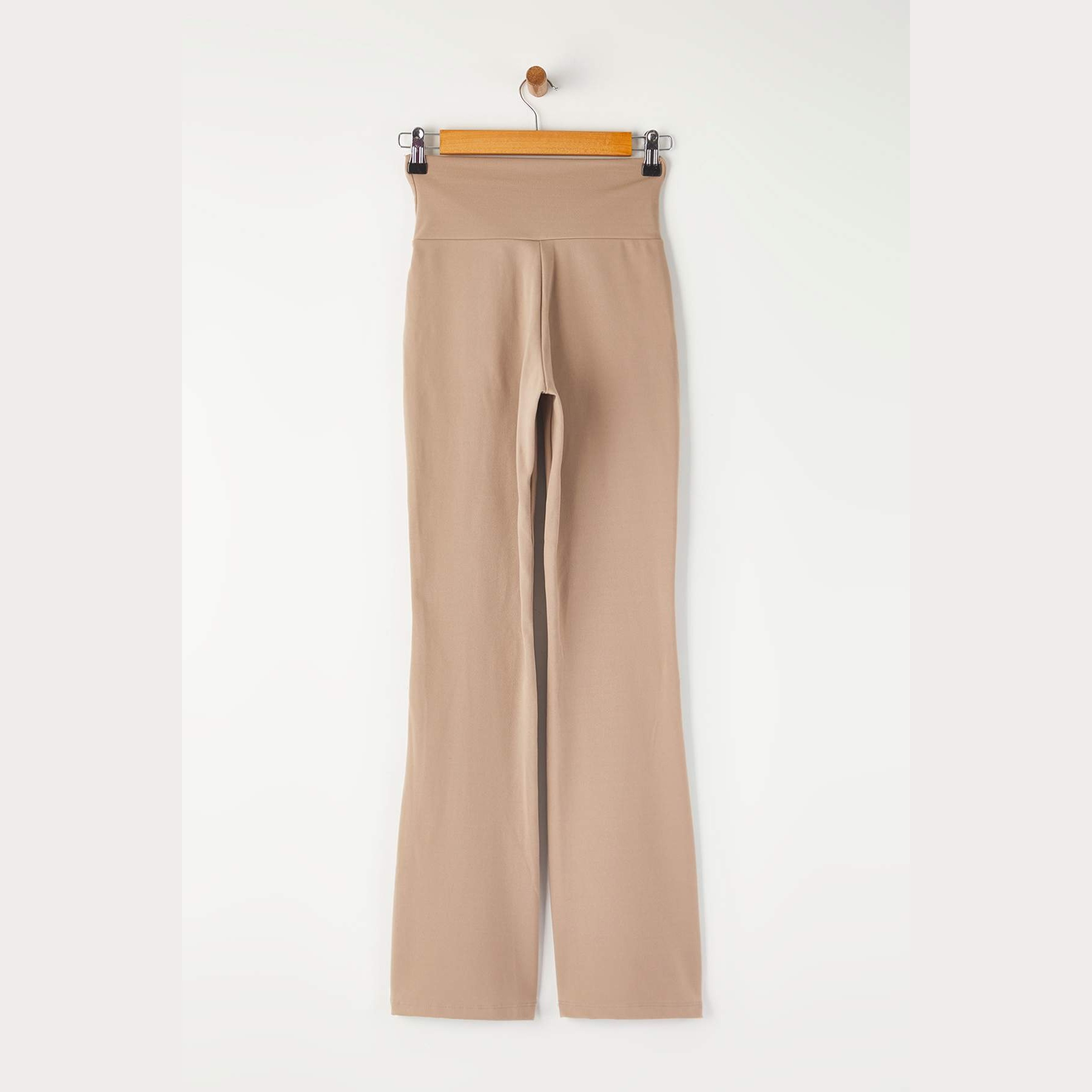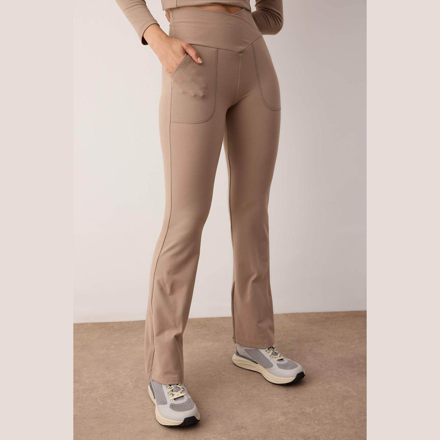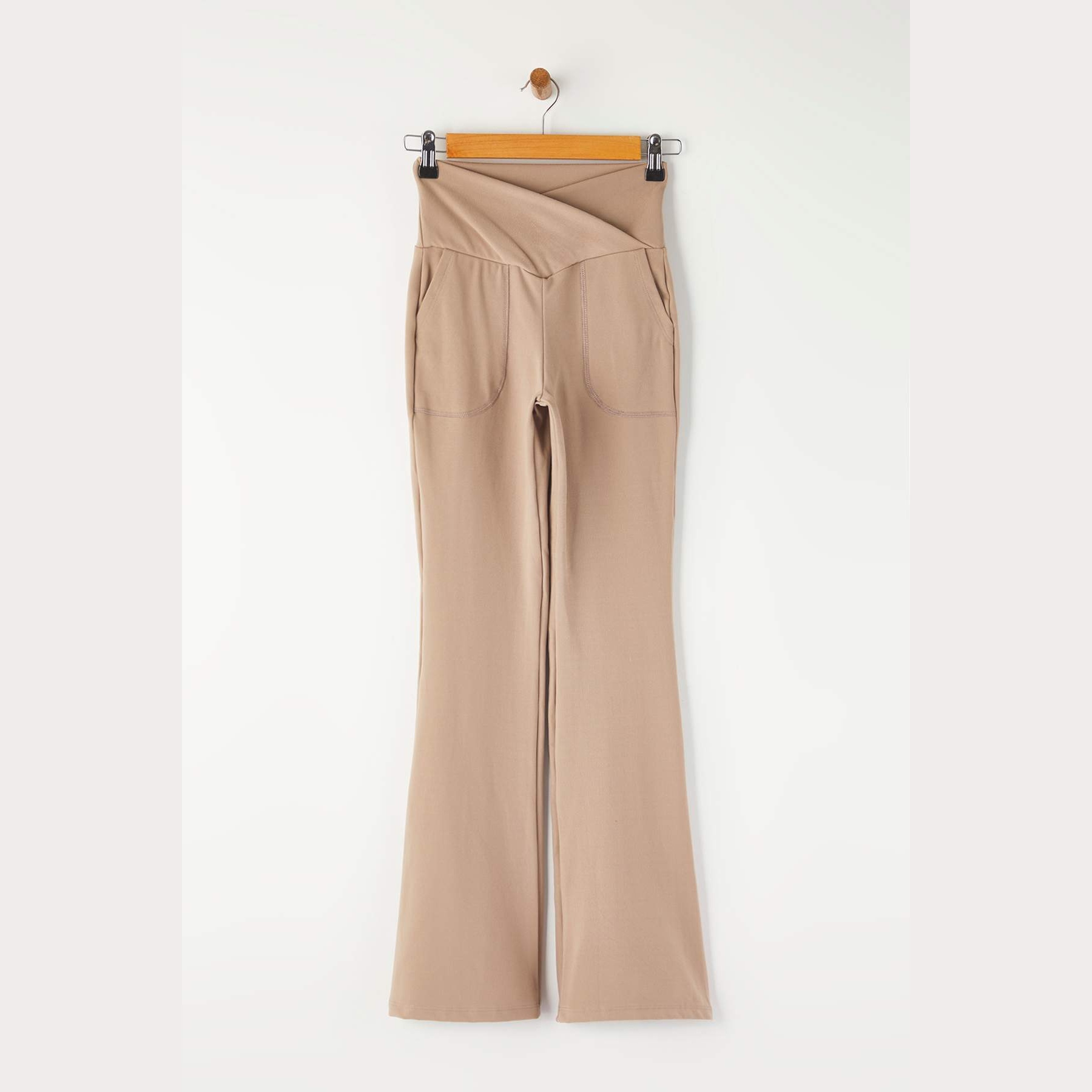 بنطال رياضي نسائي بلون بيج فاتح (فيزون)، مصنوع من خامة تريكو مطاطية بتشطيب فِرَاشي ناعم يمنح ملمسًا دافئًا ومريحًا، يتميز بقصة إسبانية واسعة من الأسفل، وخصر مرتفع بتصميم كروڤاز أنيق، مع جيوب جانبية عملية تضيف لمسة وظيفية. تصميم مثالي للتمارين أو الإطلالات اليومية المحتشمة.