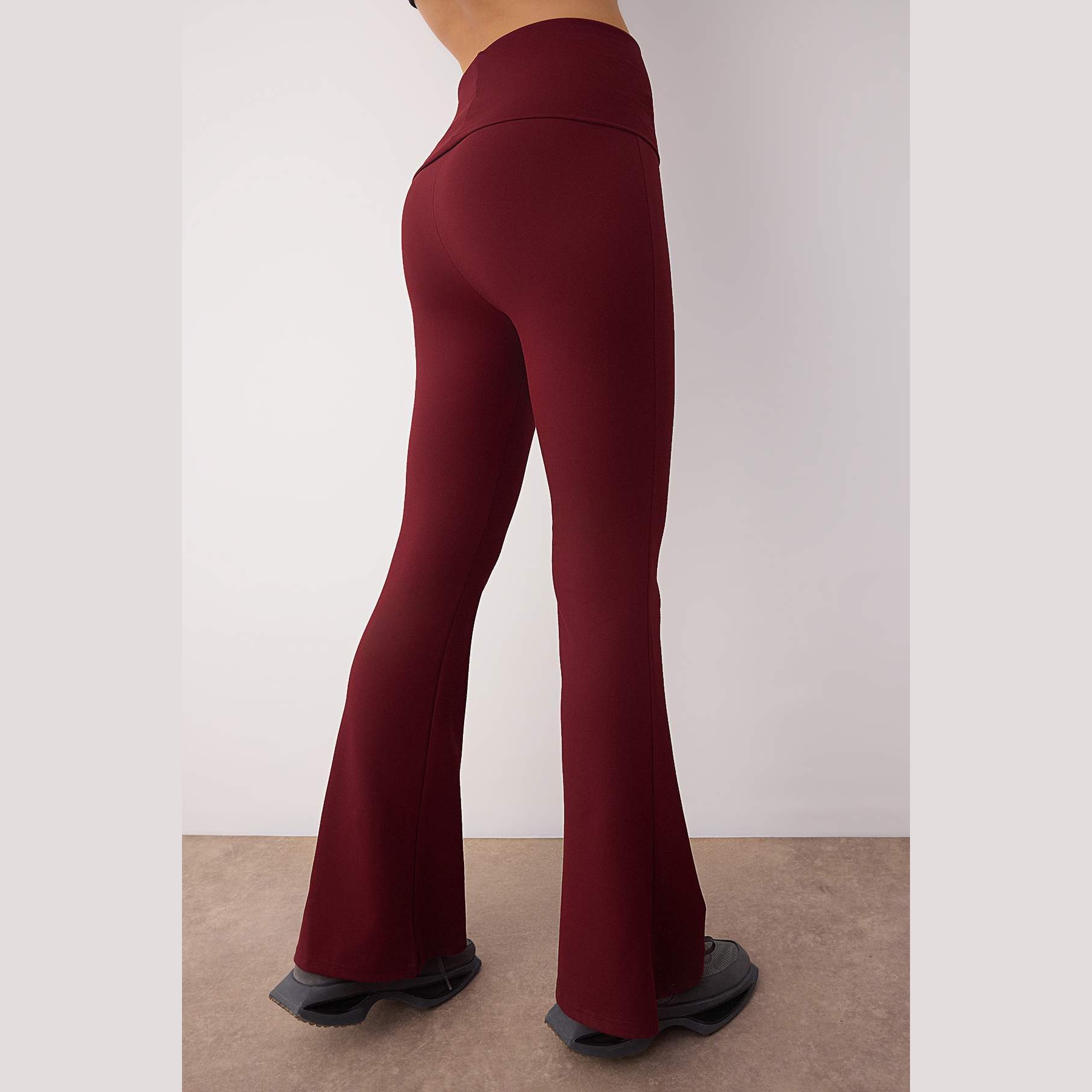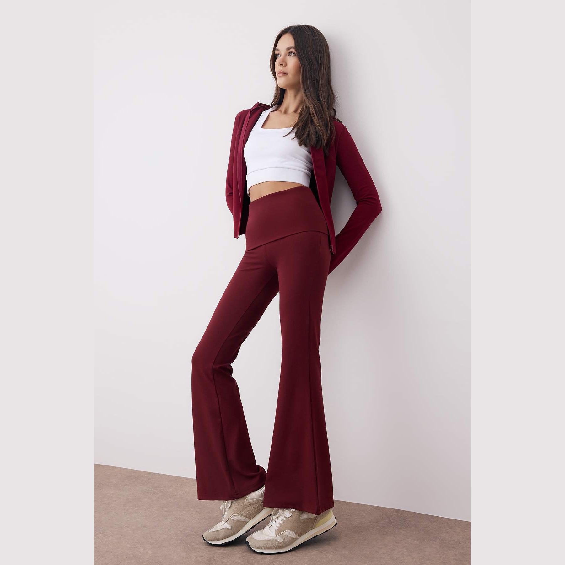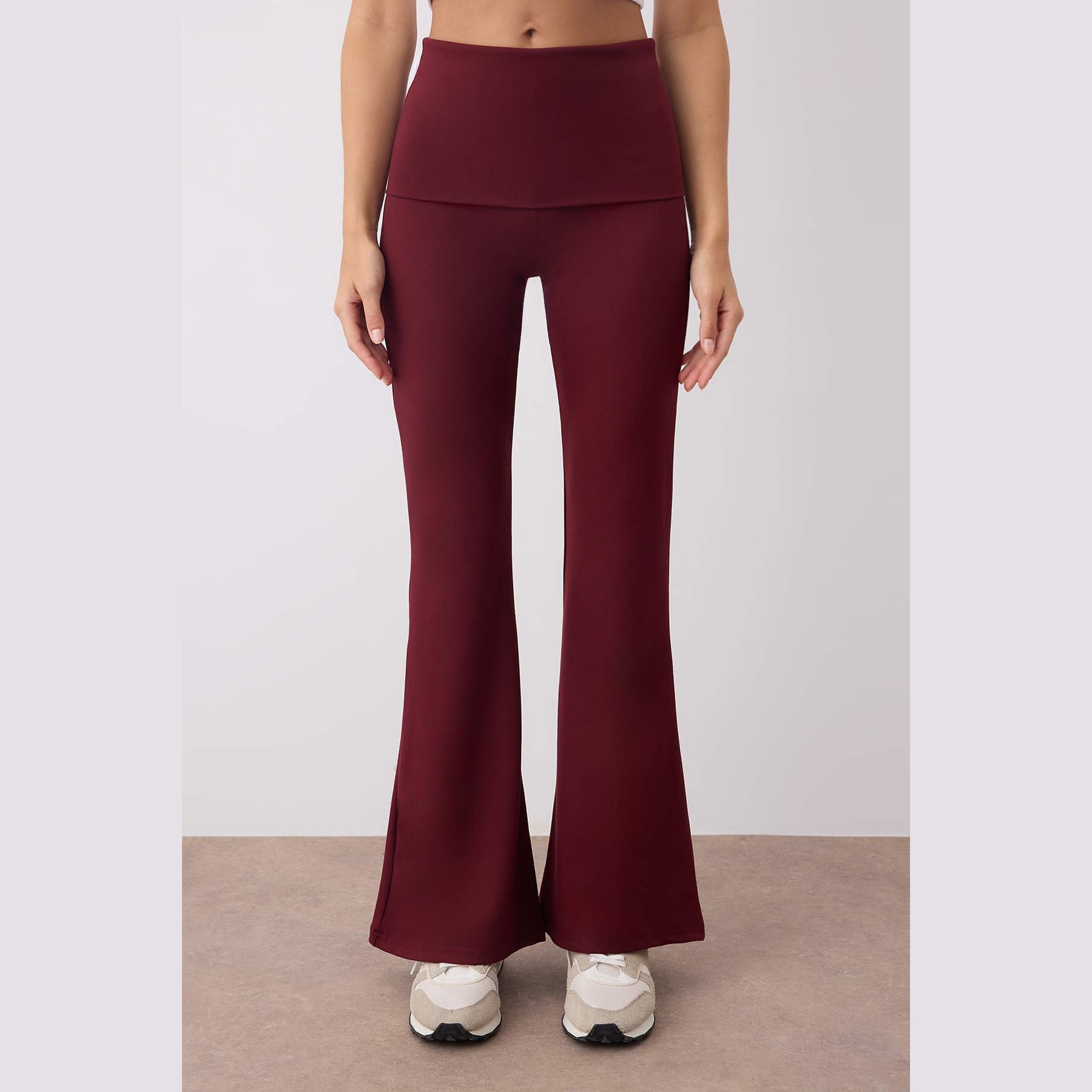 بنطال رياضي نسائي بلون بوردو، مصنوع من خامة تريكو مطاطية بتشطيب فِرَاشي ناعم يمنح ملمسًا دافئًا ومريحًا، يتميز بقصة Flare واسعة من الأسفل، وخصر مرتفع مع تفصيل قابل للطي يمنح مرونة في الارتداء ولمسة عصرية. تصميم مثالي للتمارين أو الإطلالات اليومية المحتشمة.