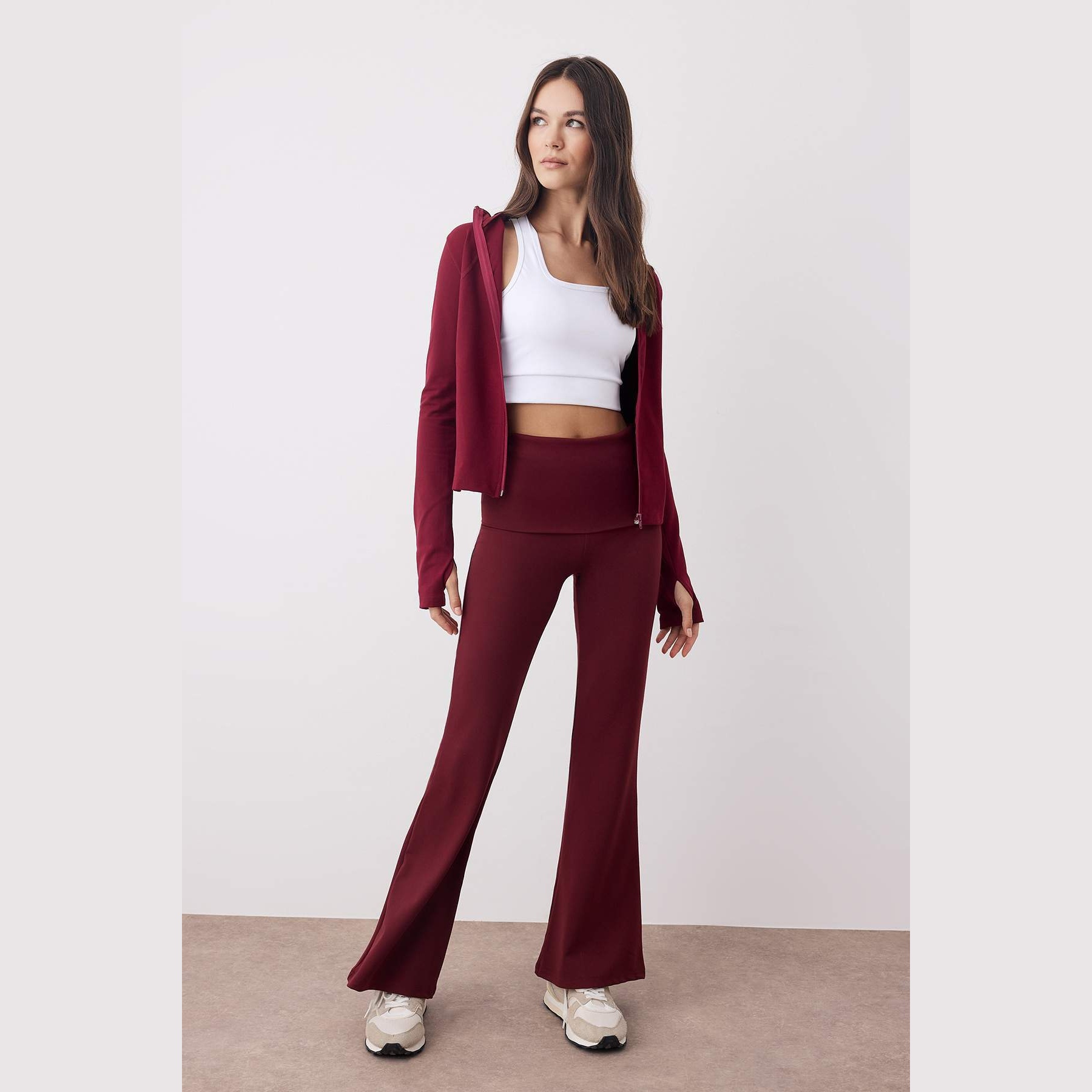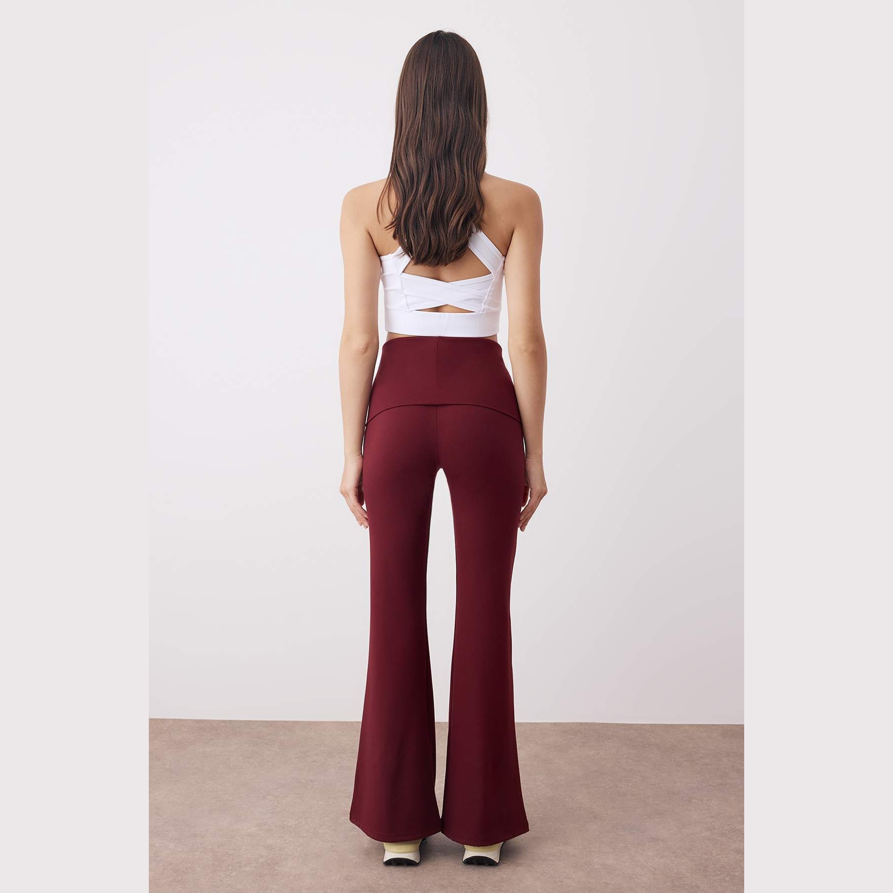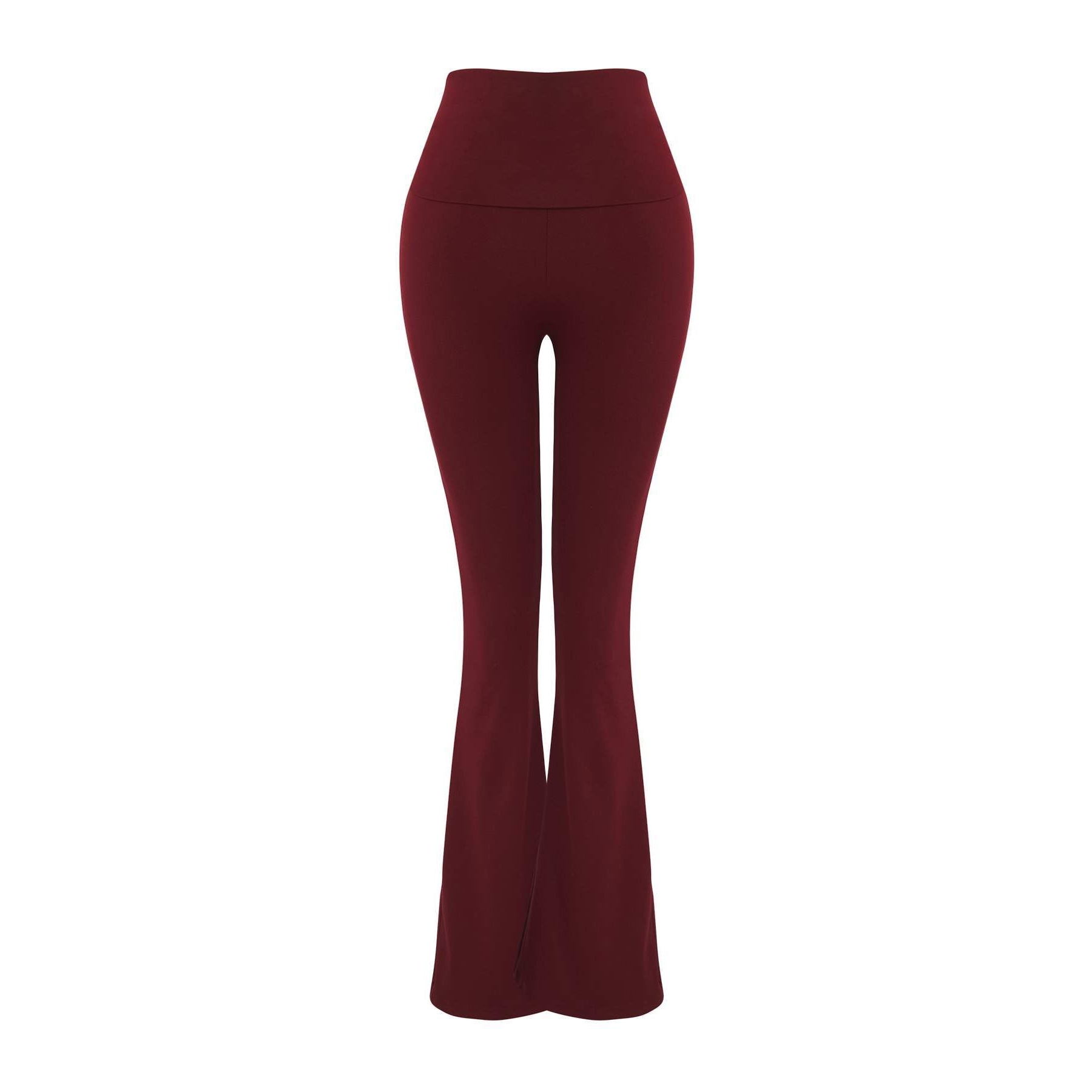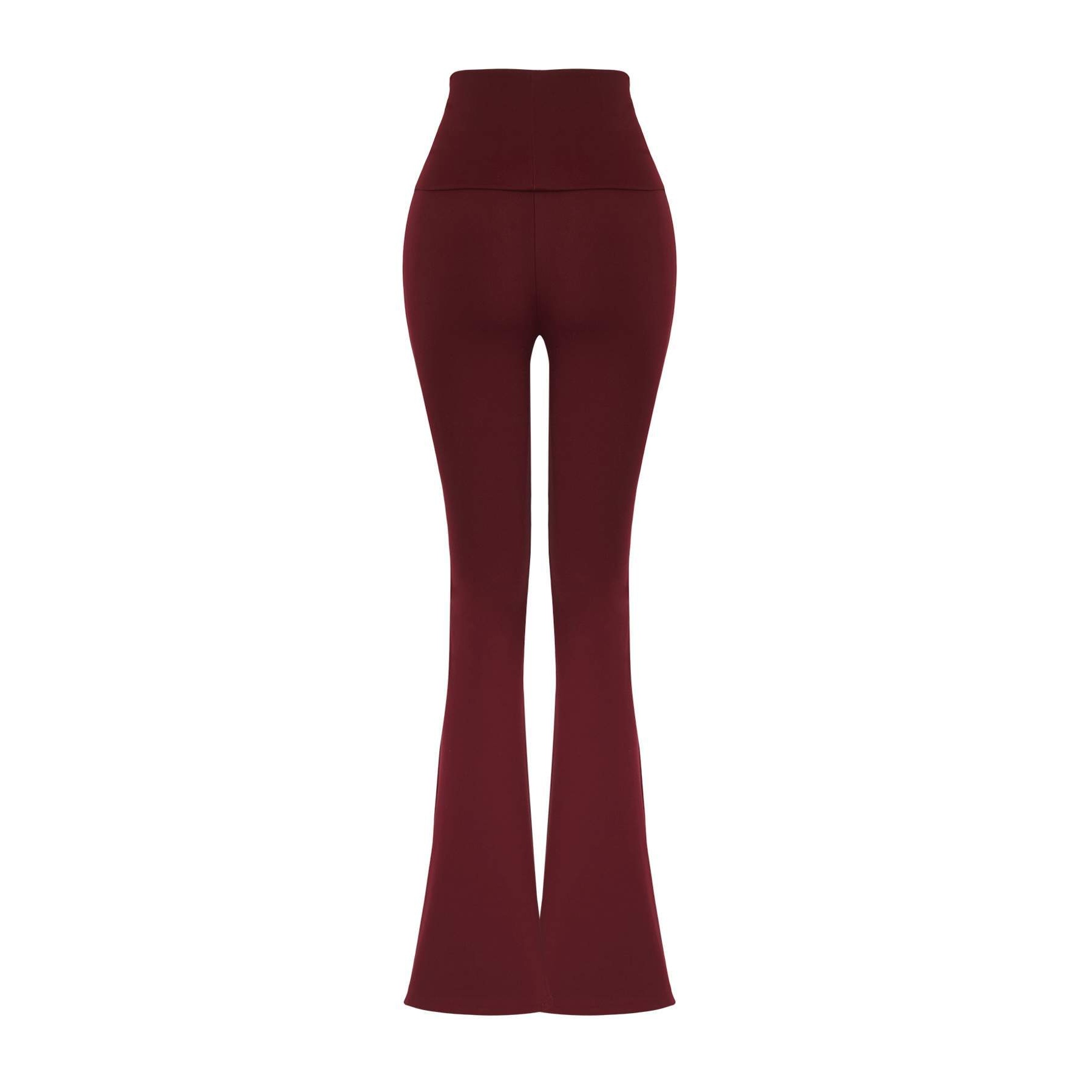 بنطال رياضي نسائي بلون بوردو، مصنوع من خامة تريكو مطاطية بتشطيب فِرَاشي ناعم يمنح ملمسًا دافئًا ومريحًا، يتميز بقصة Flare واسعة من الأسفل، وخصر مرتفع مع تفصيل قابل للطي يمنح مرونة في الارتداء ولمسة عصرية. تصميم مثالي للتمارين أو الإطلالات اليومية المحتشمة.