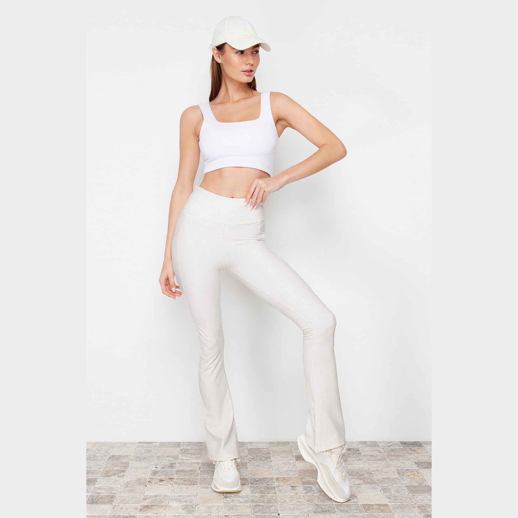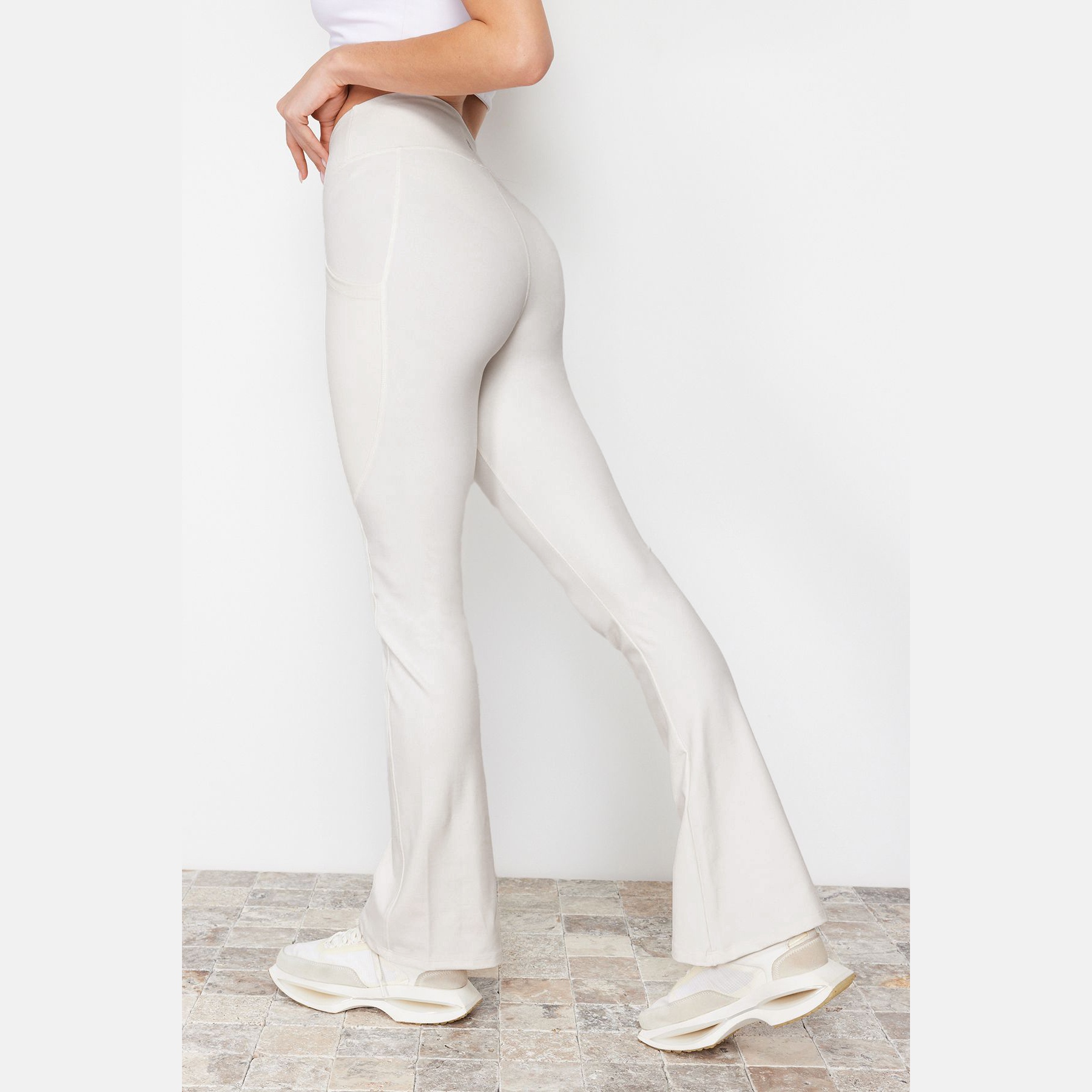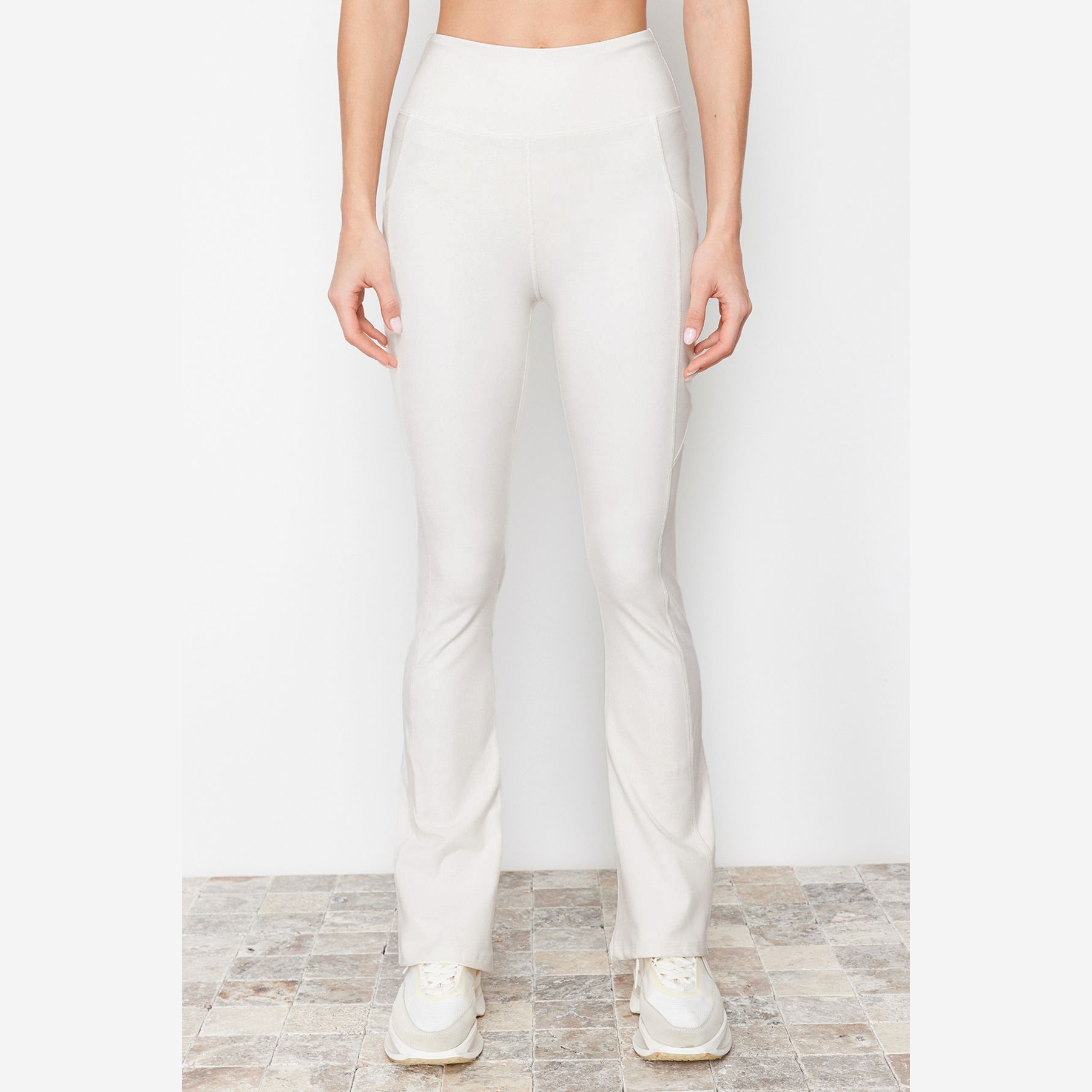 بنطال رياضي نسائي بلون إكرو (بيج فاتح)، مصنوع من خامة تريكو مطاطية بتشطيب فِرَاشي ناعم يمنح ملمسًا مريحًا ودافئًا، يتميز بقصة إسبانية واسعة من الأسفل، وخصر مرتفع يمنح دعمًا وأناقة أثناء الحركة، مع طبعة عاكسة تضيف لمسة رياضية عصرية. تصميم مثالي للتمارين أو الإطلالات اليومية المحتشمة.