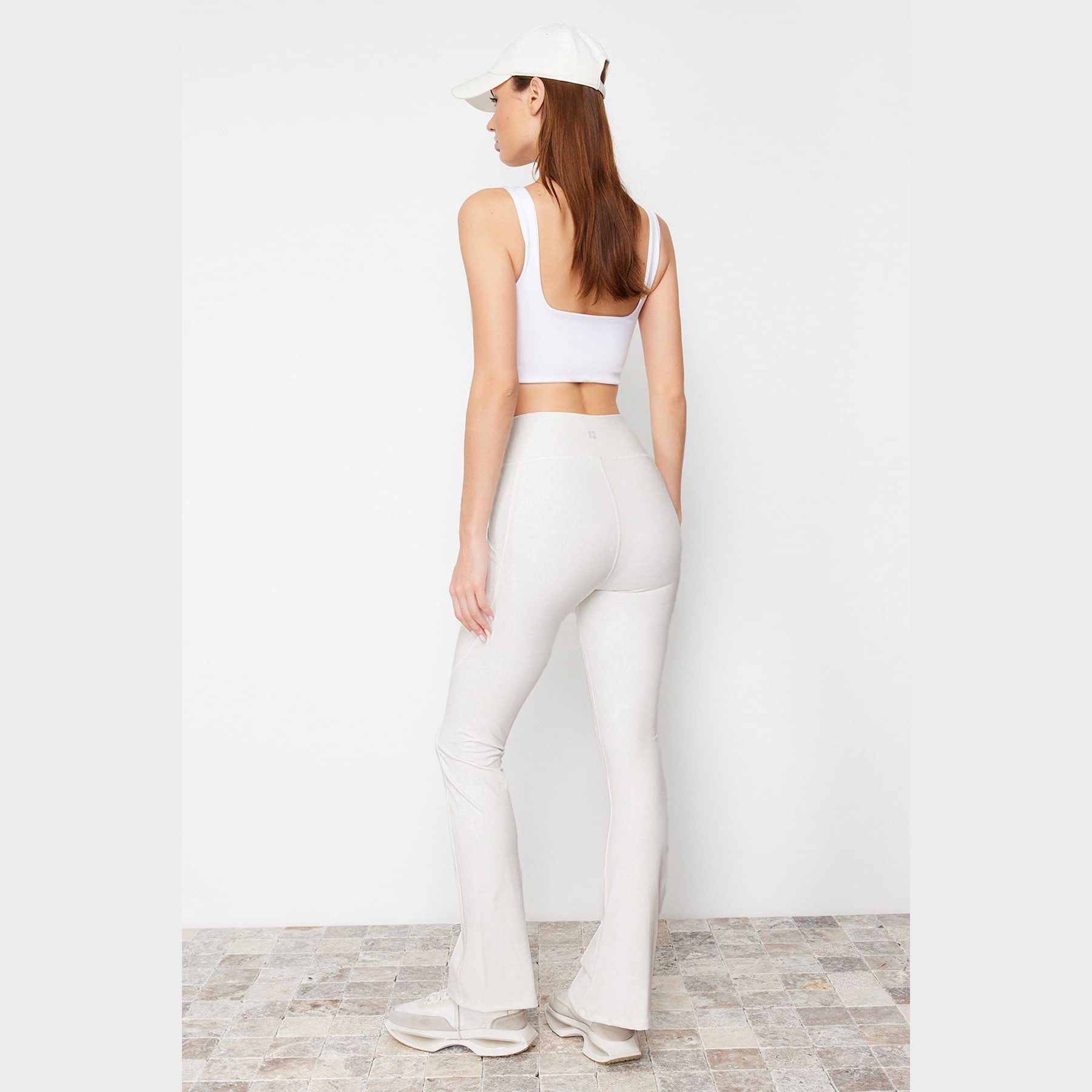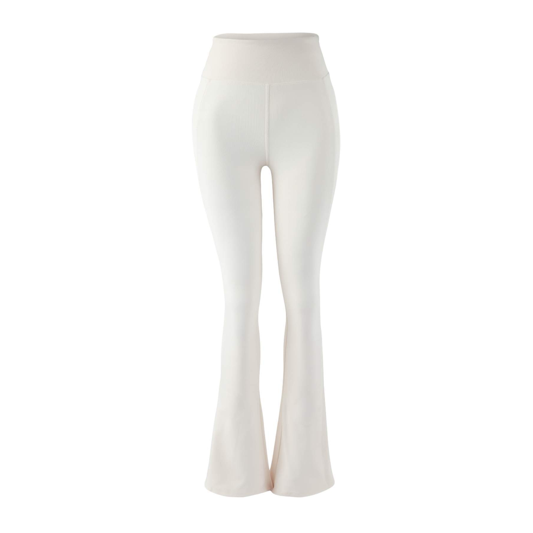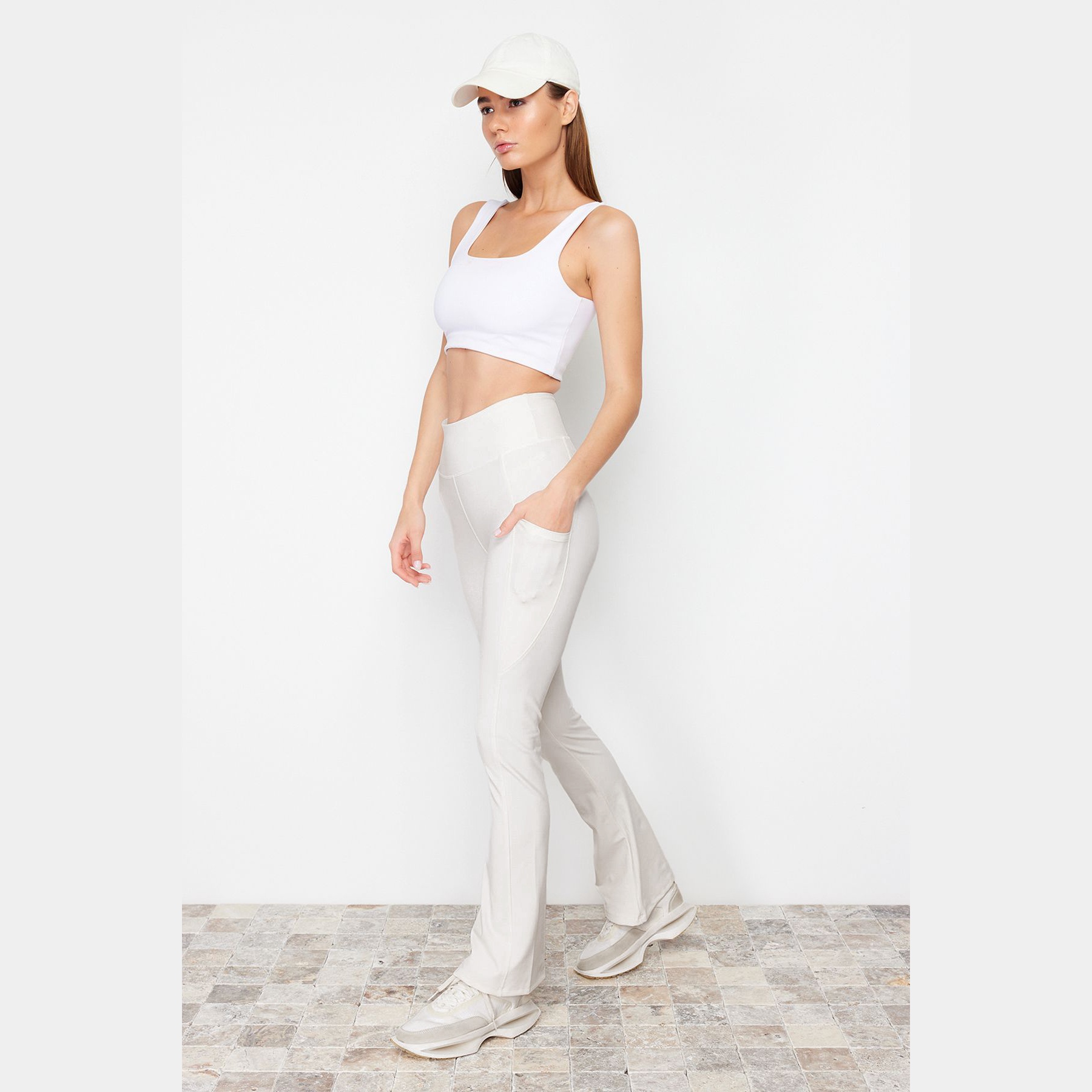 بنطال رياضي نسائي بلون إكرو (بيج فاتح)، مصنوع من خامة تريكو مطاطية بتشطيب فِرَاشي ناعم يمنح ملمسًا مريحًا ودافئًا، يتميز بقصة إسبانية واسعة من الأسفل، وخصر مرتفع يمنح دعمًا وأناقة أثناء الحركة، مع طبعة عاكسة تضيف لمسة رياضية عصرية. تصميم مثالي للتمارين أو الإطلالات اليومية المحتشمة.