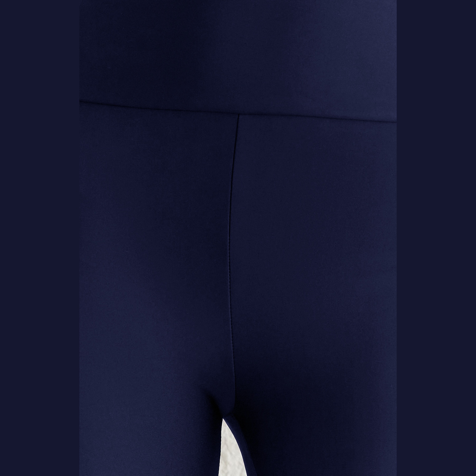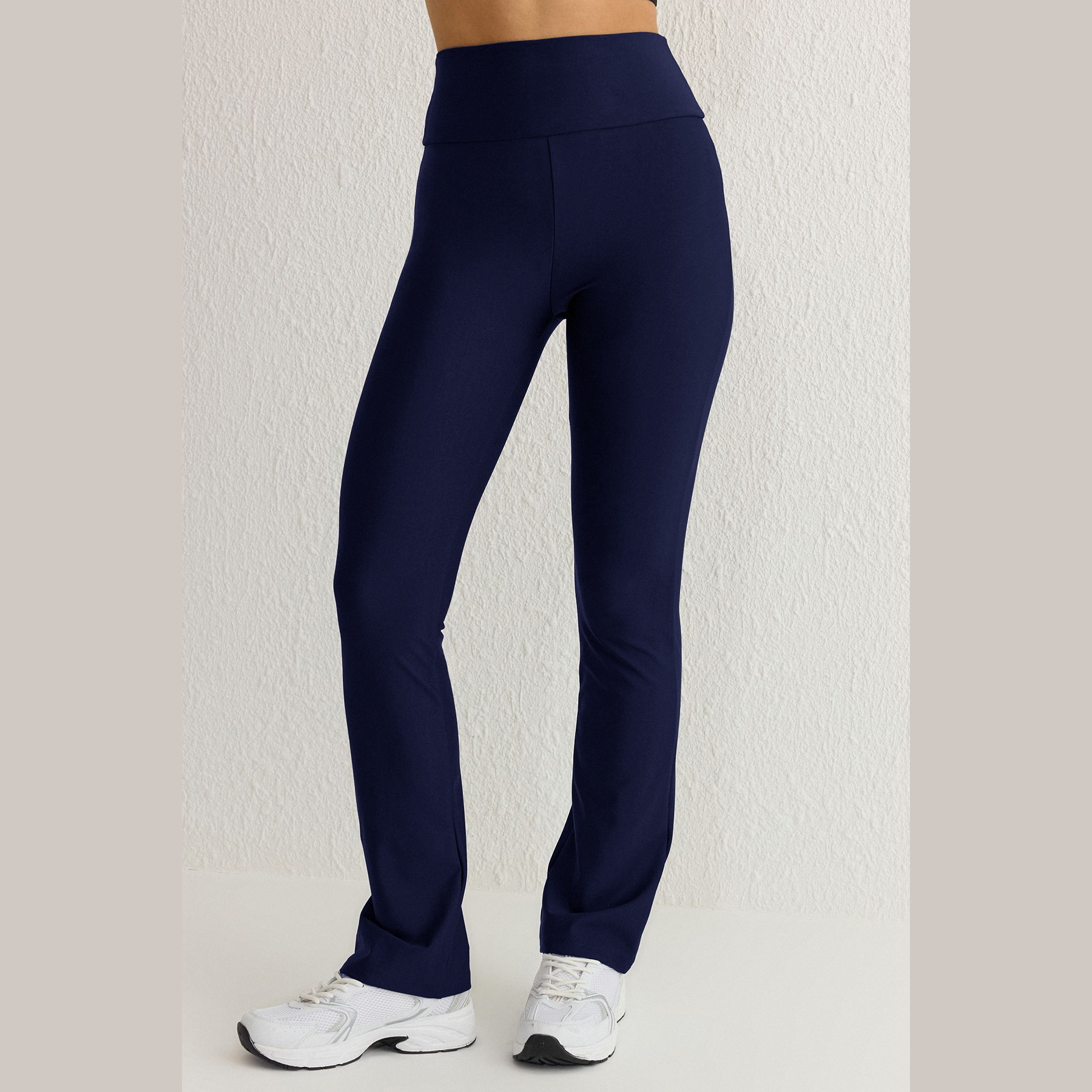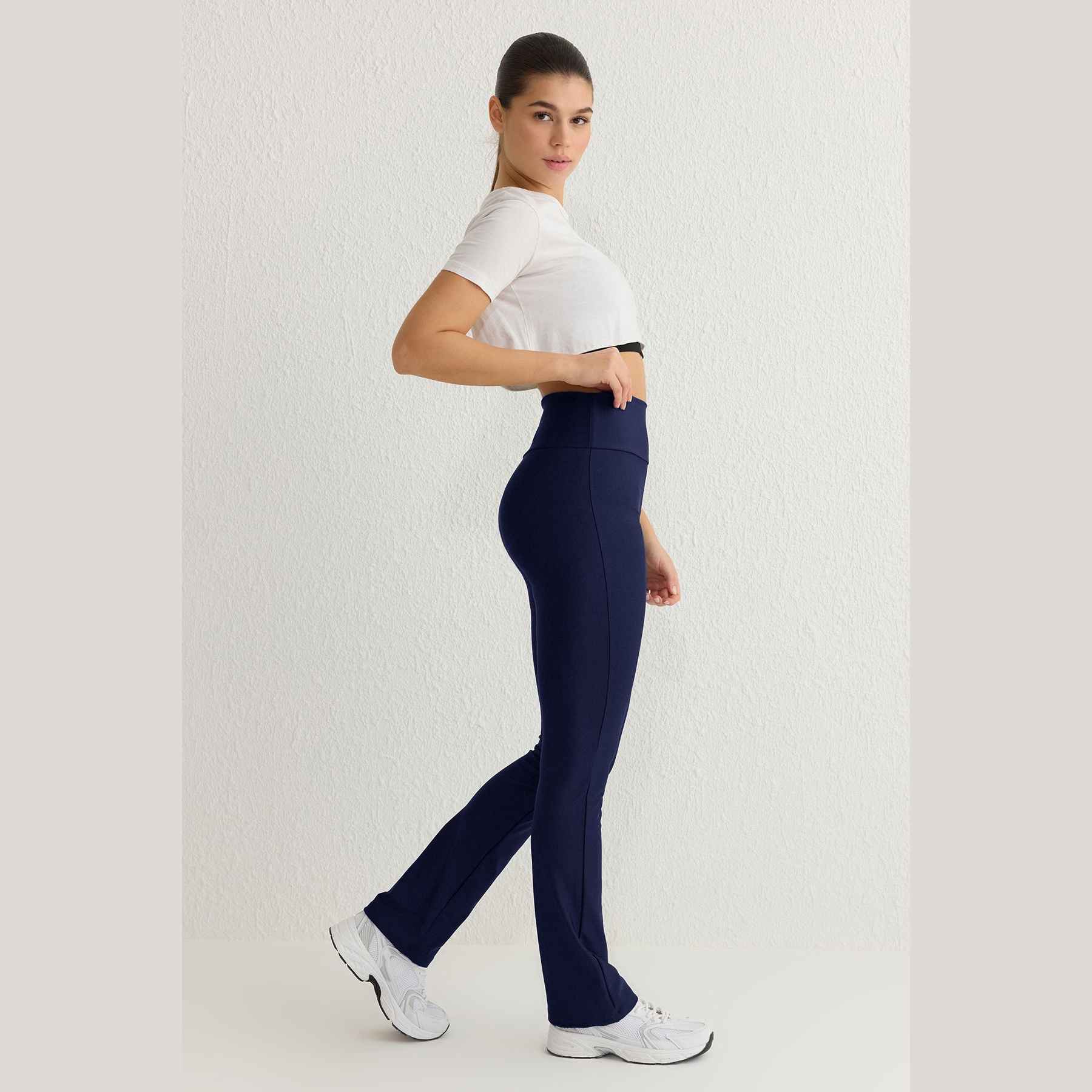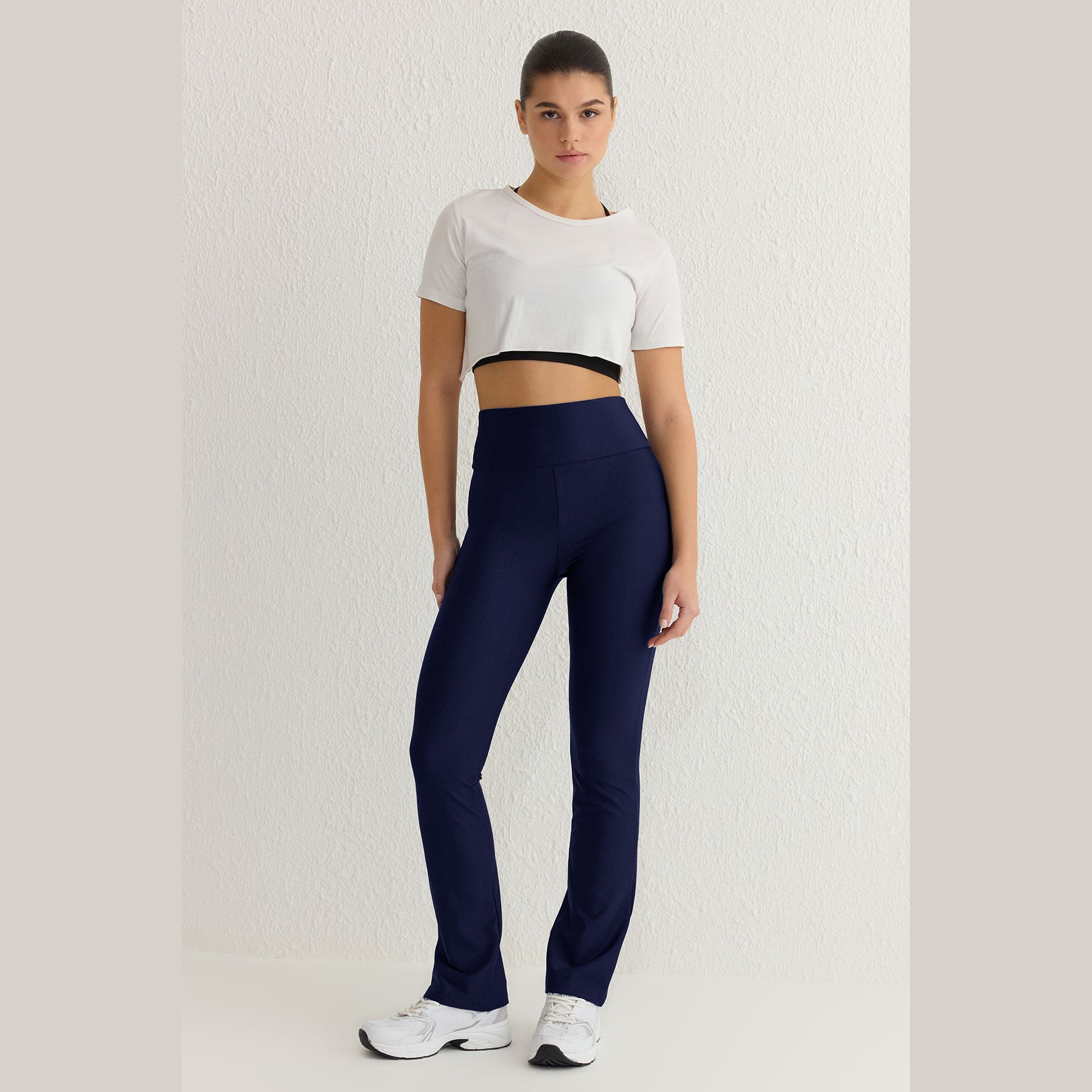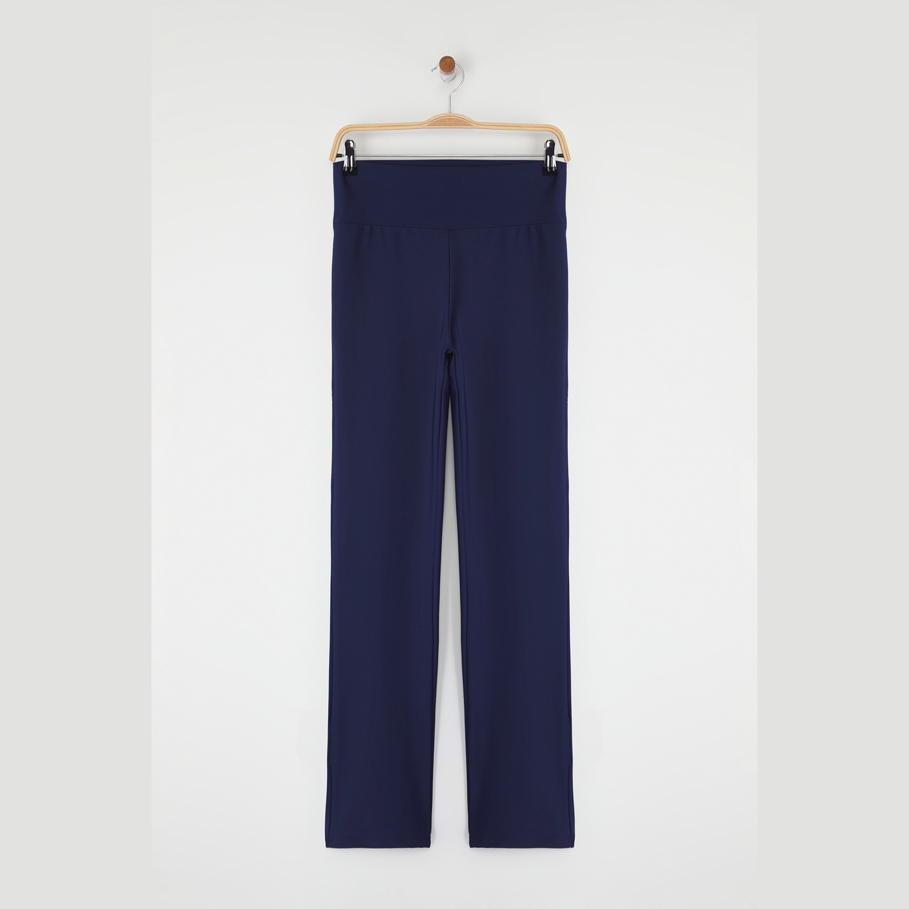 بنطال رياضي نسائي بلون كحلي (Lacivert)، مصنوع من خامة تريكو مطاطية بنسيج دالغيتش (Scuba) بتركيبة بوليستر وإيلاستان، يتميز بقصة مستقيمة بطول كامل، وخصر متوسط يمنح راحة أثناء الحركة، مع خاصية تشكيلية تبرز القوام. تصميم مثالي للتمارين أو الإطلالات اليومية المحتشمة.