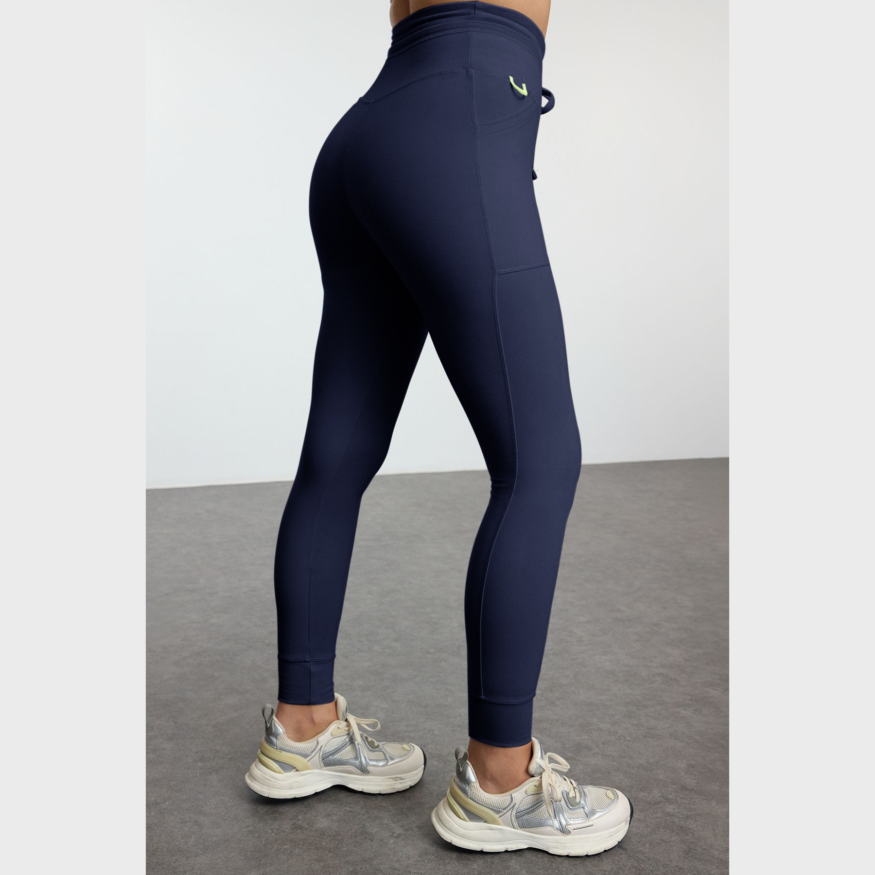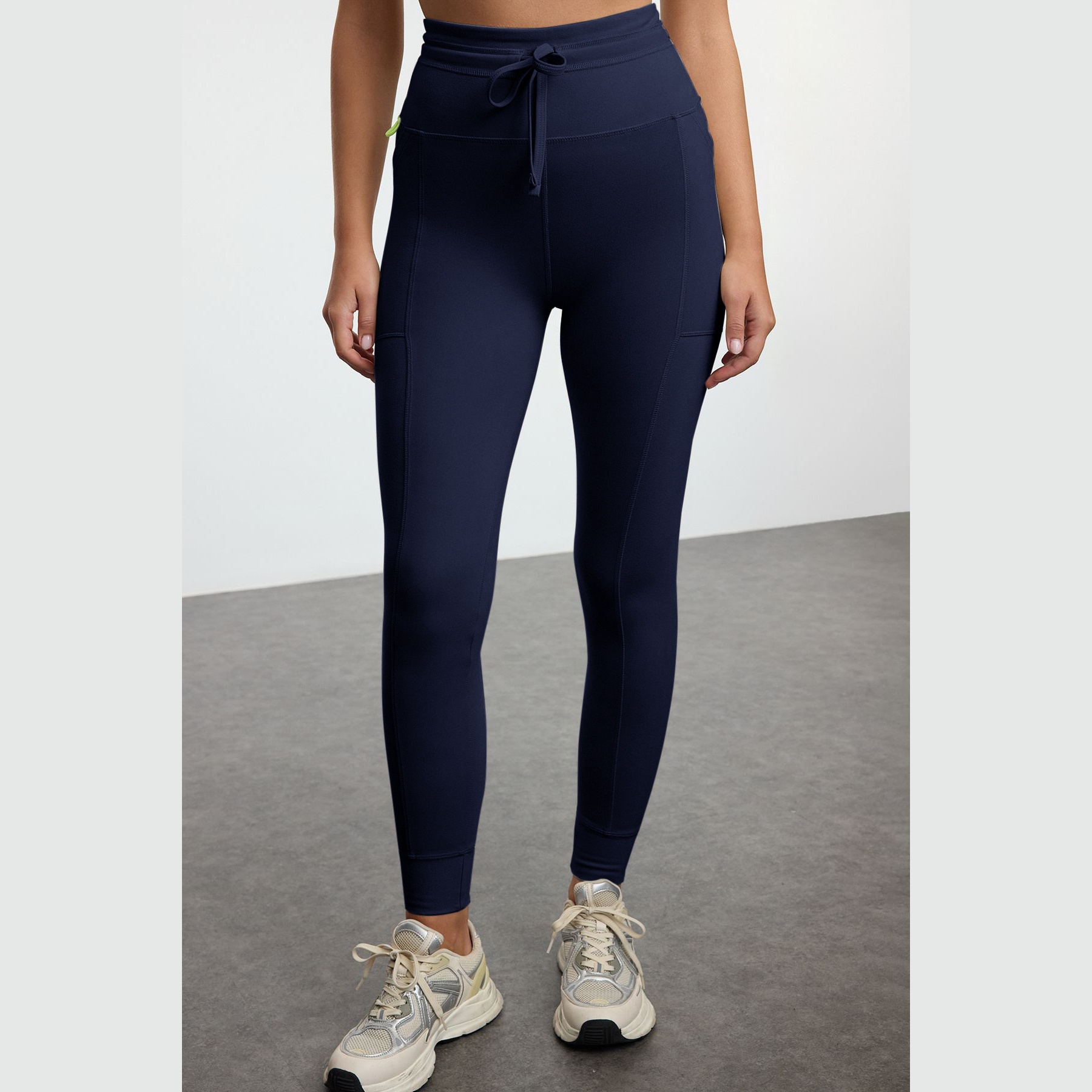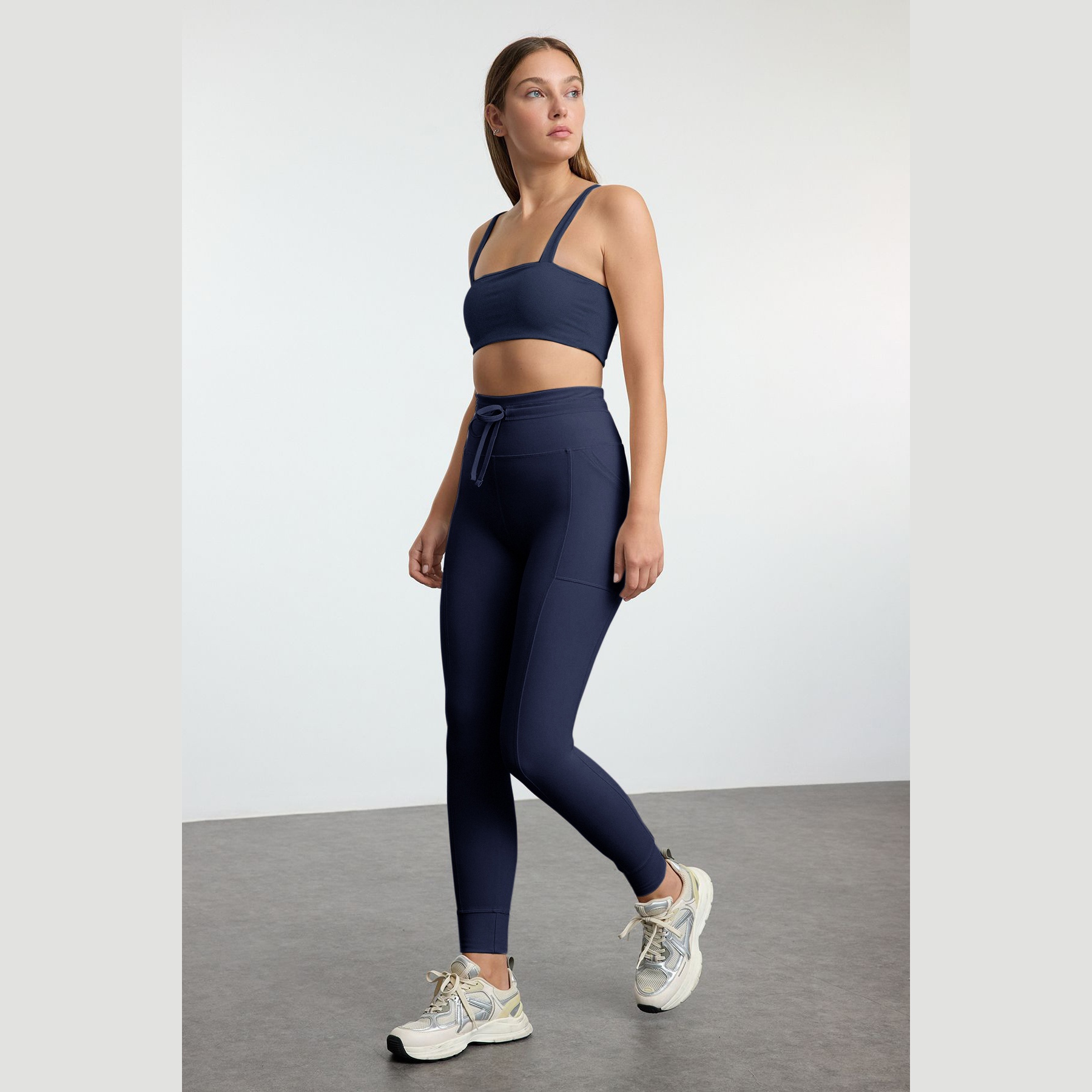 بنطال رياضي نسائي بلون كحلي (Lacivert)، مصنوع من خامة تريكو مطاطية بتشطيب فِرَاشي ناعم يمنح ملمسًا دافئًا ومريحًا، يتميز بقصة ضيقة بطول كامل، وخصر مرتفع، مع جيوب جانبية عملية وتفصيل ربط أمامي يضفي لمسة عصرية. تصميم مثالي للتمارين أو الإطلالات اليومية المحتشمة.