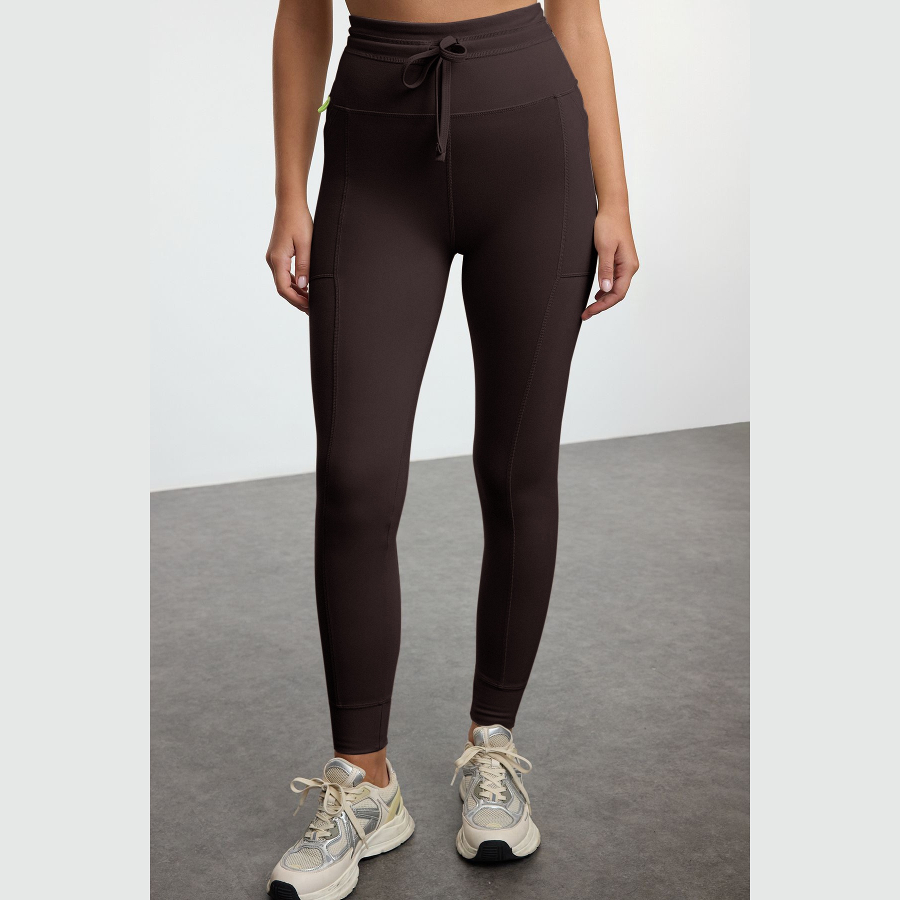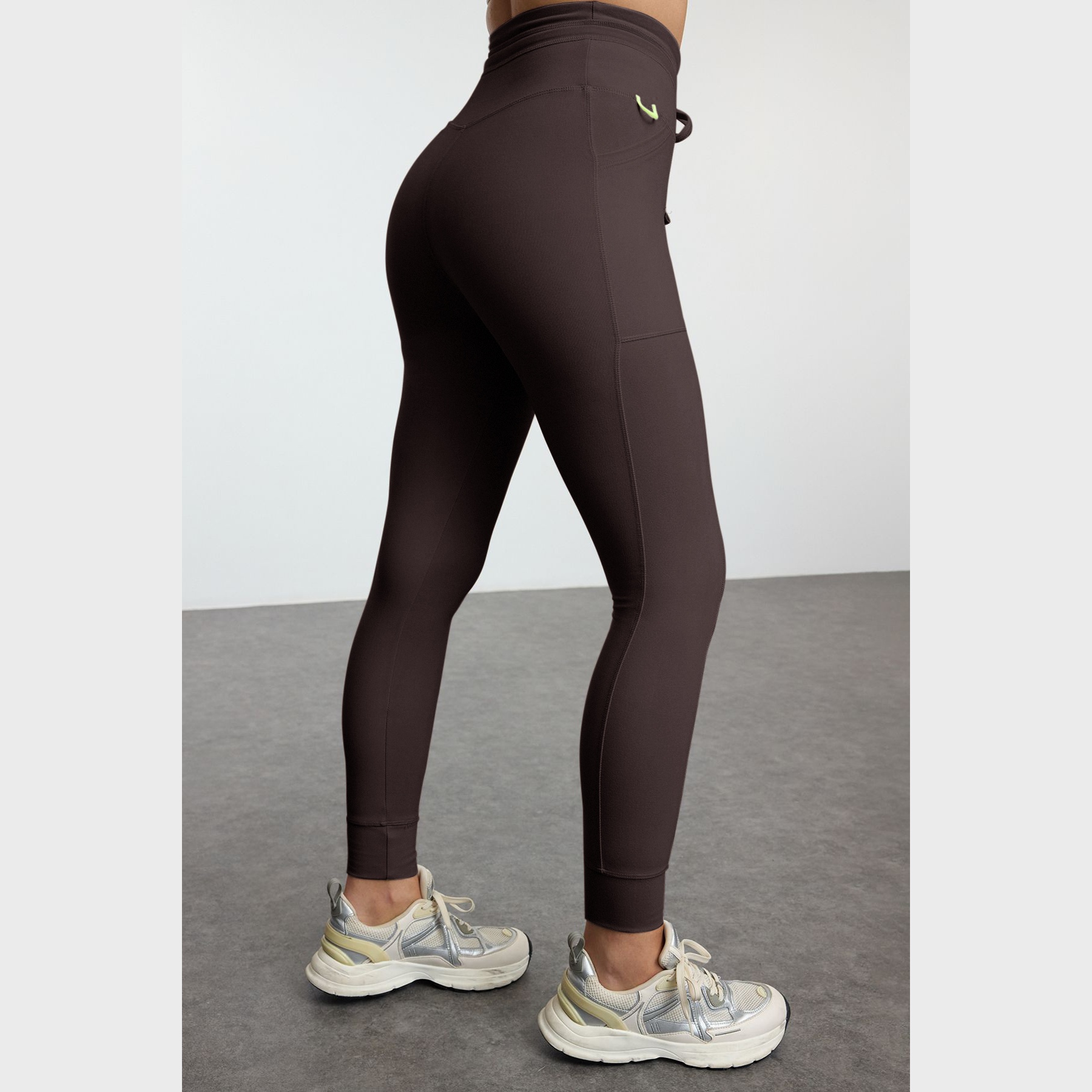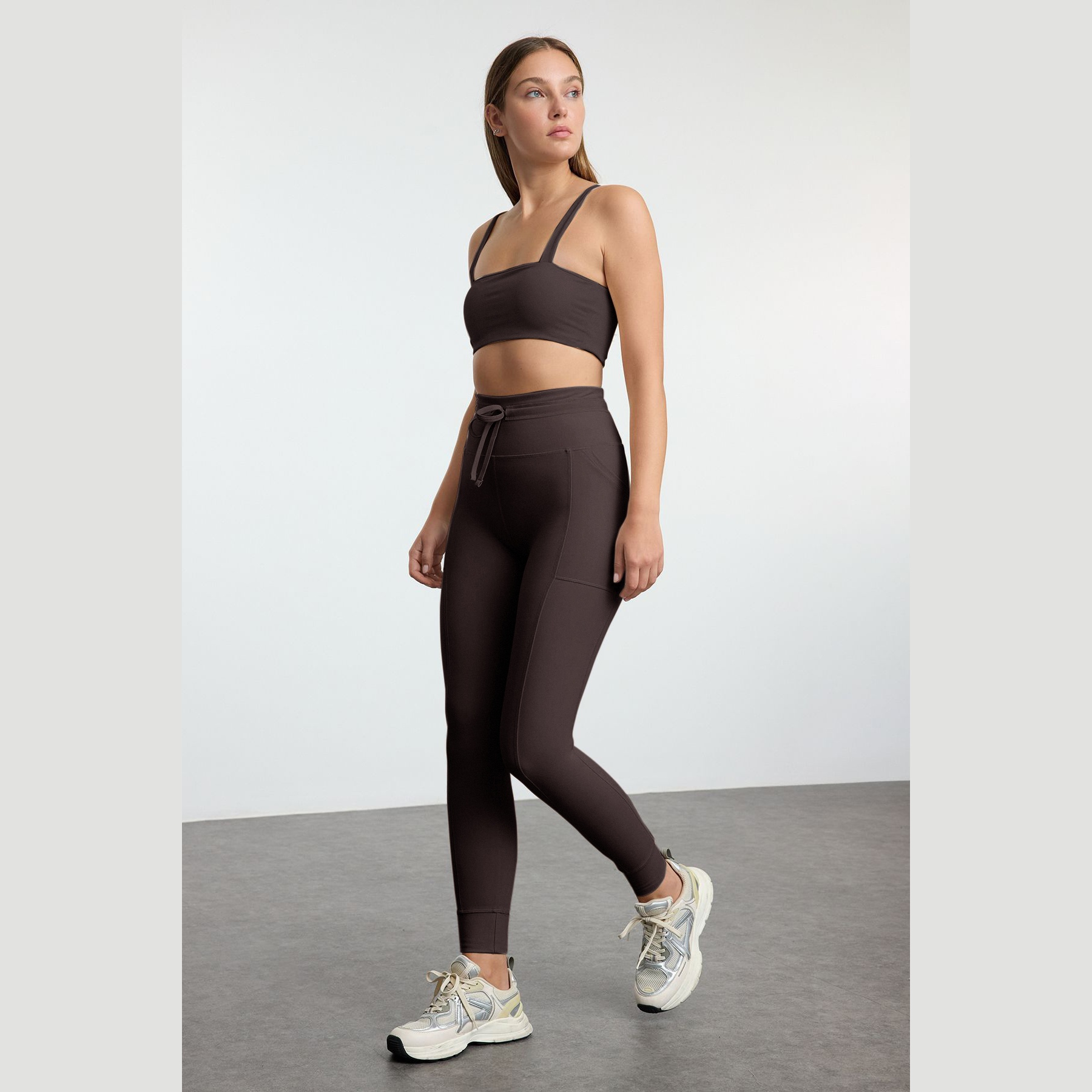 بنطال رياضي نسائي بلون بني (Kahverengi)، مصنوع من خامة تريكو مطاطية بتشطيب فِرَاشي ناعم يمنح ملمسًا دافئًا ومريحًا، يتميز بقصة ضيقة بطول كامل، وخصر مرتفع، مع جيوب جانبية عملية وتفصيل ربط أمامي يضفي لمسة عصرية. تصميم مثالي للتمارين أو الإطلالات اليومية المحتشمة.