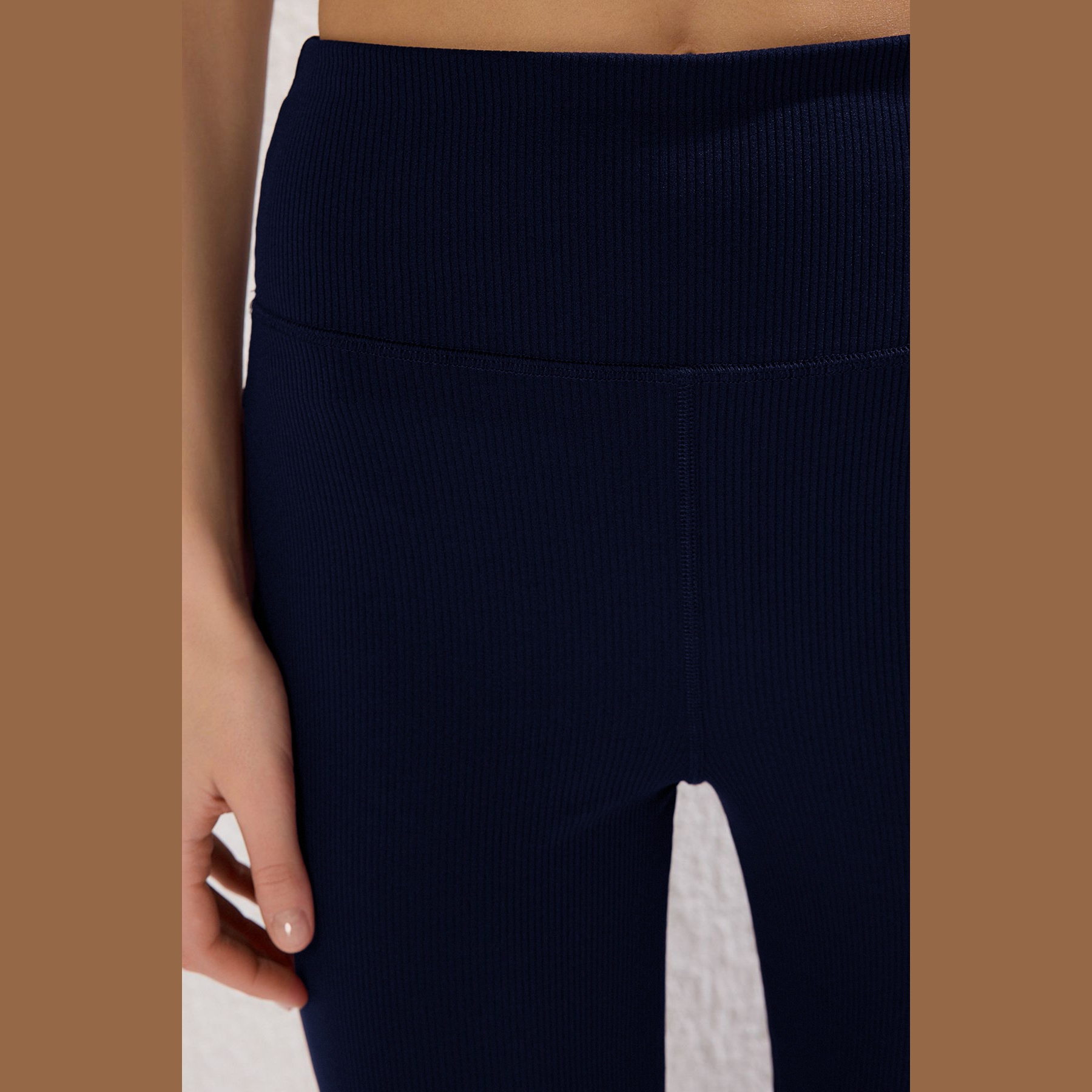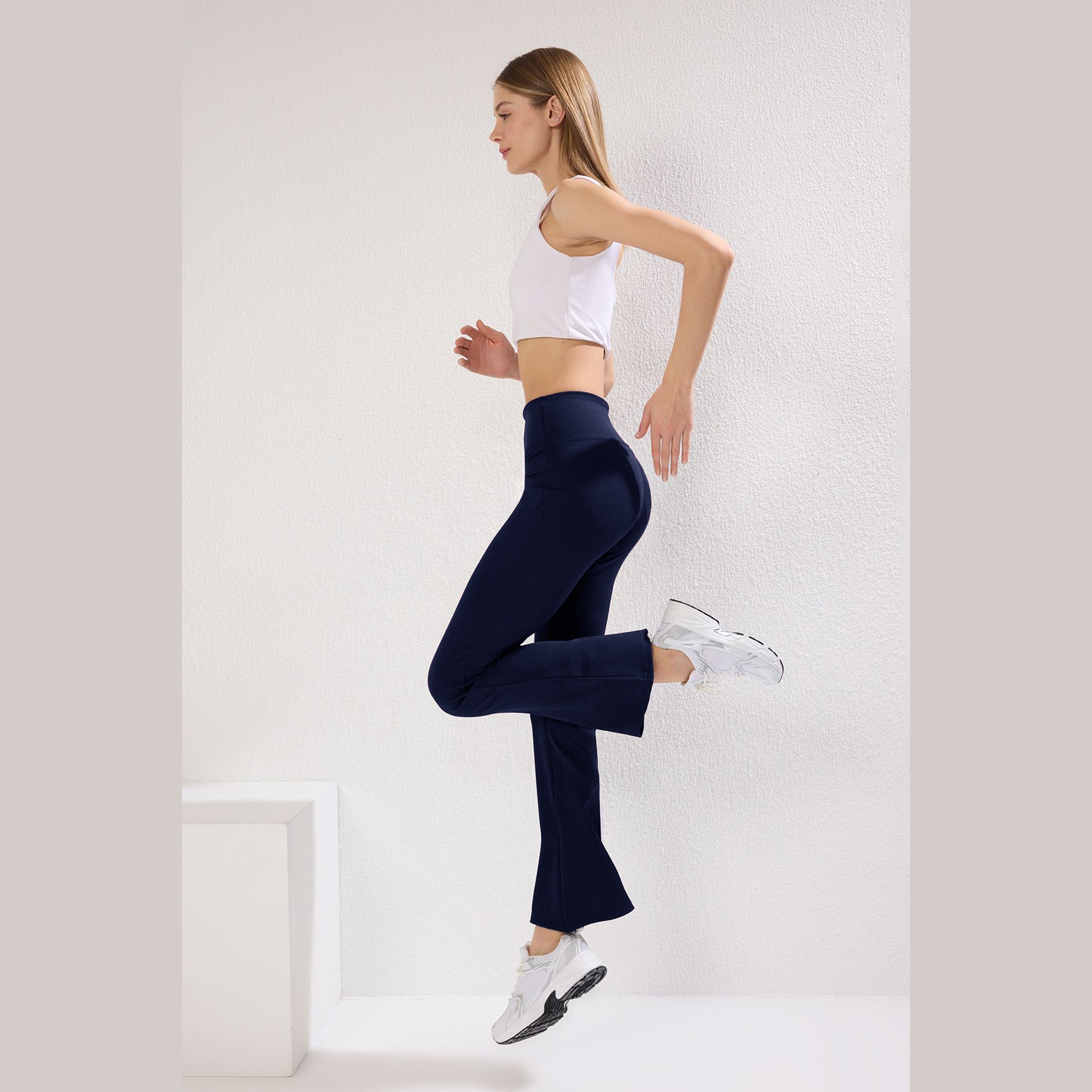 بنطال رياضي نسائي بلون كحلي داكن (Koyu Lacivert)، مصنوع من خامة تريكو مطاطية بنسيج سكوبا مضلّع يمنح ملمسًا مميزًا، يتميز بقصة إسبانية واسعة من الأسفل، وخصر مرتفع يمنح دعمًا وأناقة أثناء الحركة. تصميم مثالي لليوغا أو الإطلالات اليومية المحتشمة.