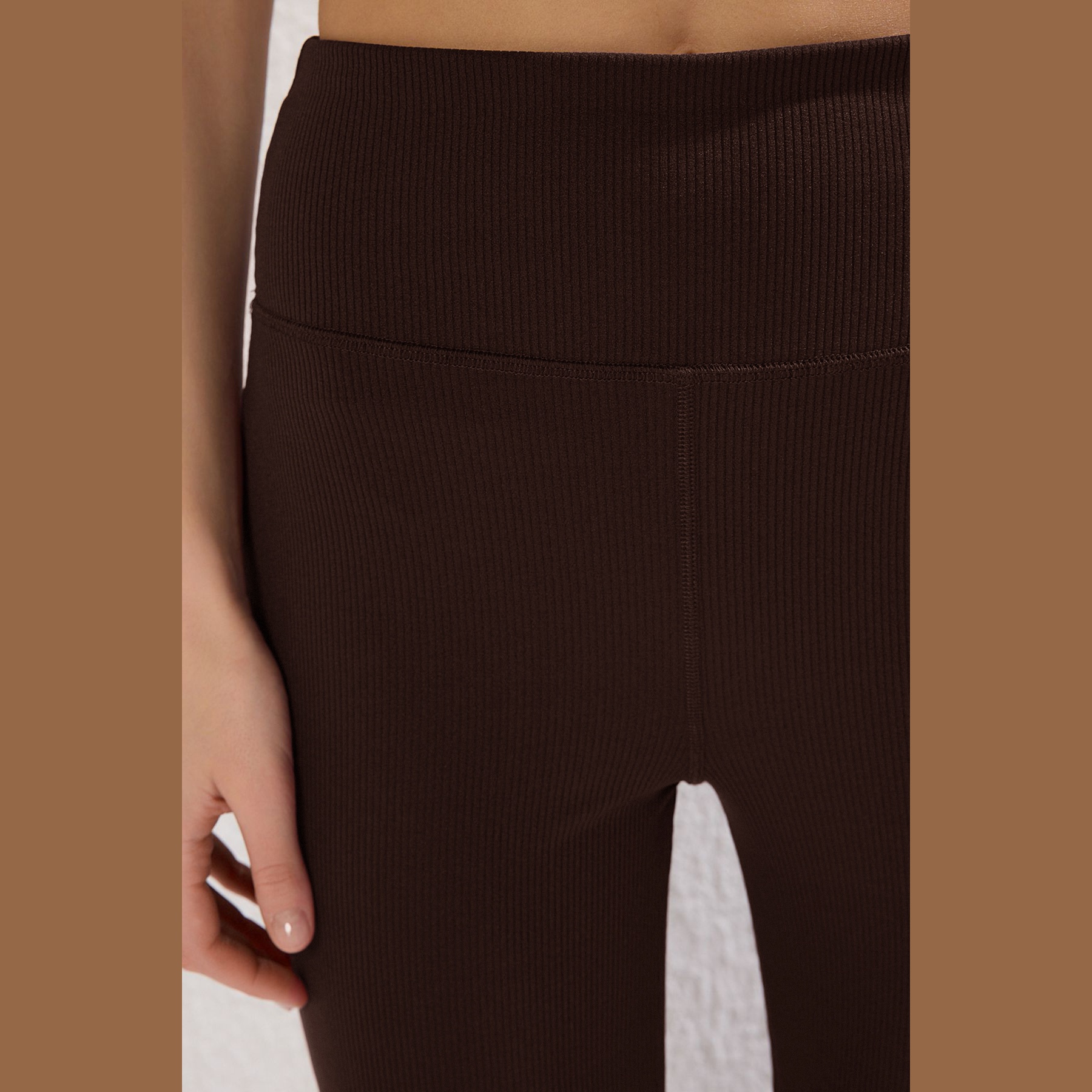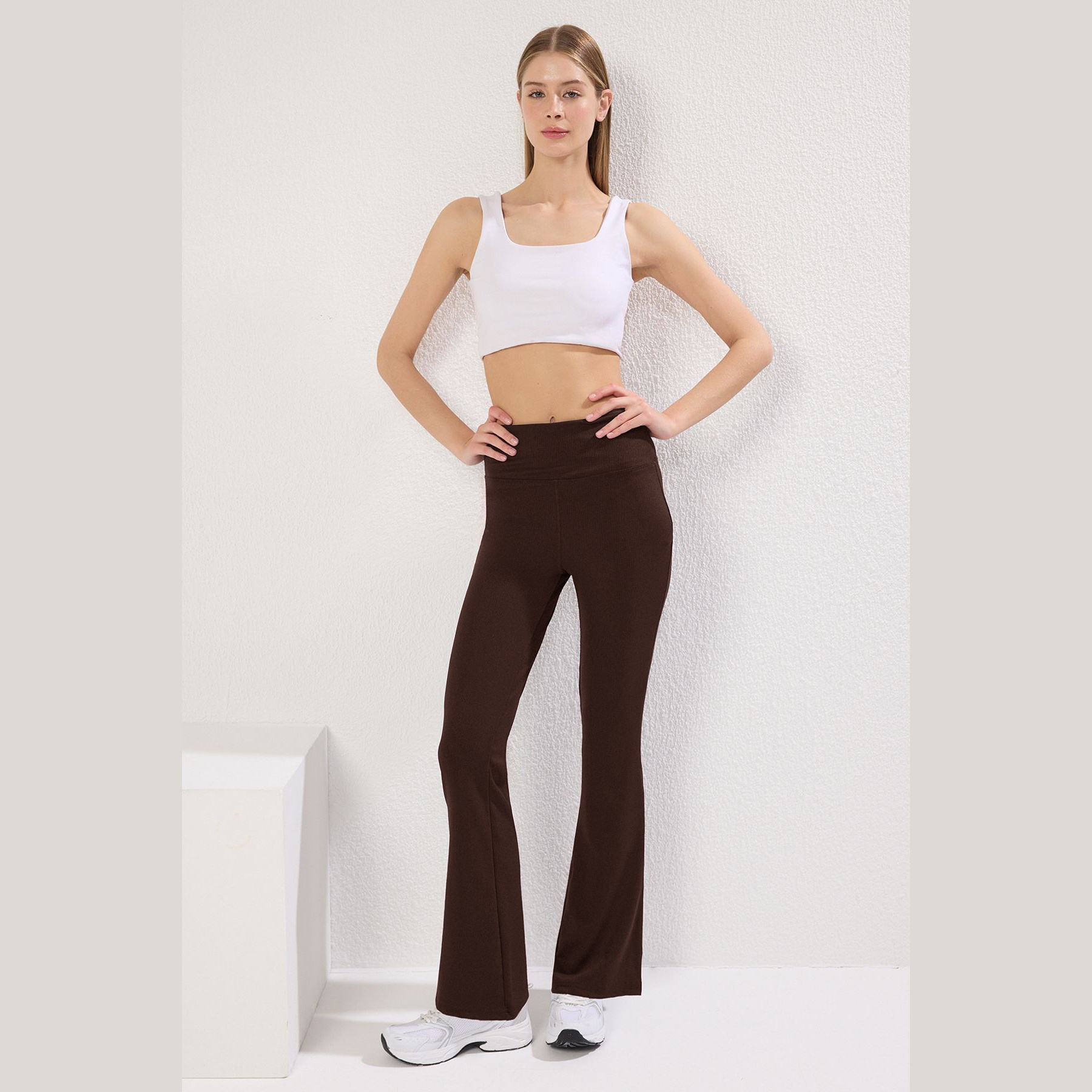 بنطال رياضي نسائي بلون بني داكن (Koyu Kahverengi)، مصنوع من خامة تريكو مطاطية بنسيج سكوبا مضلّع يمنح ملمسًا مميزًا، يتميز بقصة إسبانية واسعة من الأسفل، وخصر مرتفع يمنح دعمًا وأناقة أثناء الحركة. تصميم مثالي لليوغا أو الإطلالات اليومية المحتشمة.