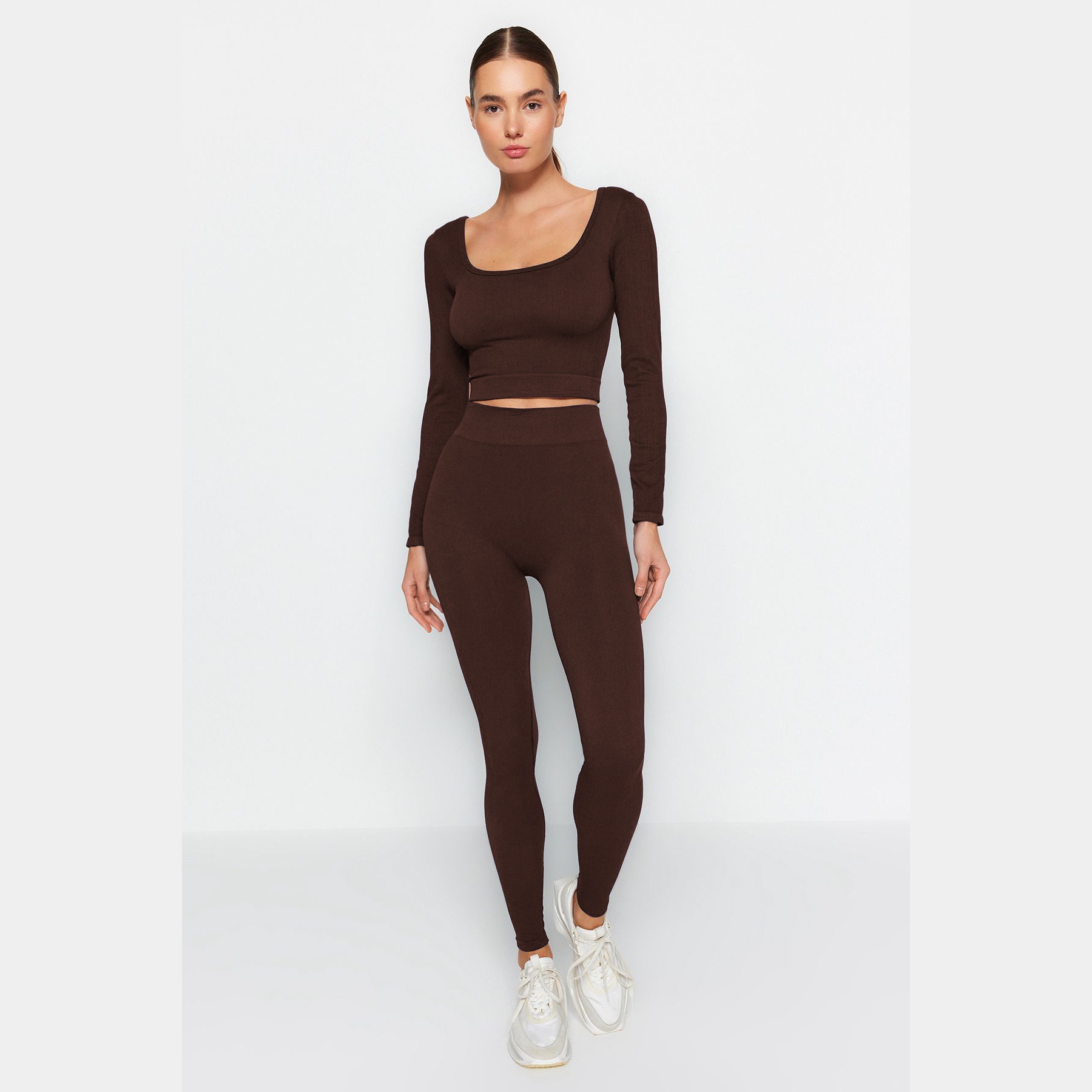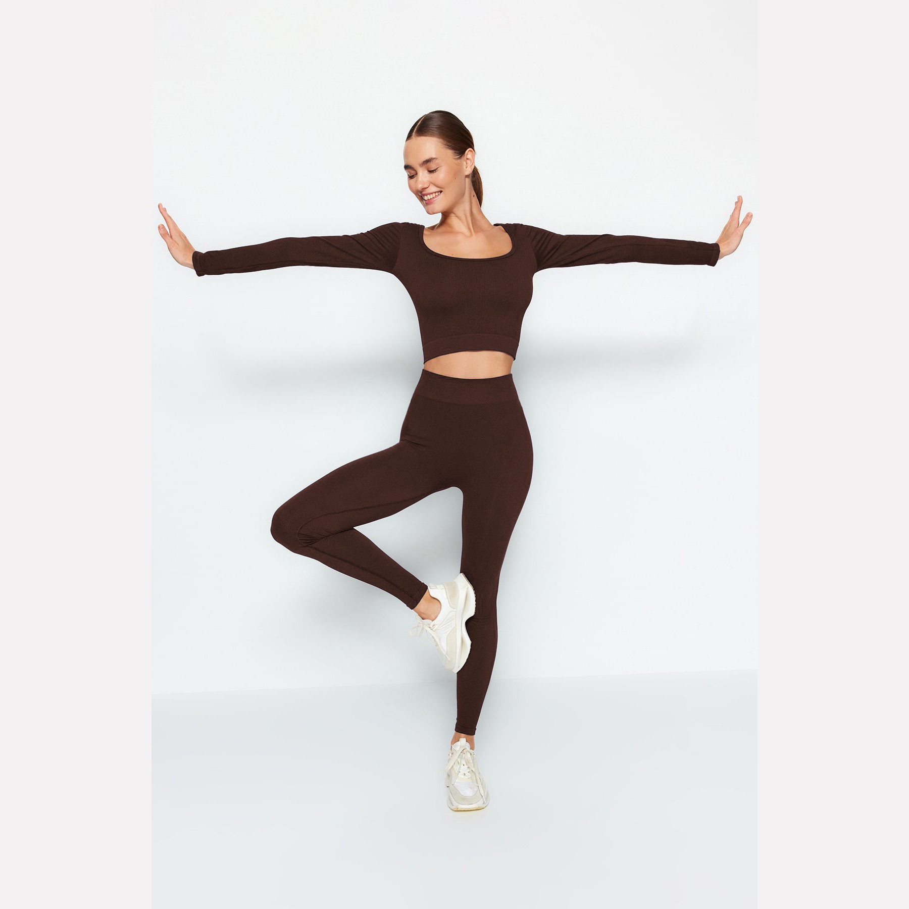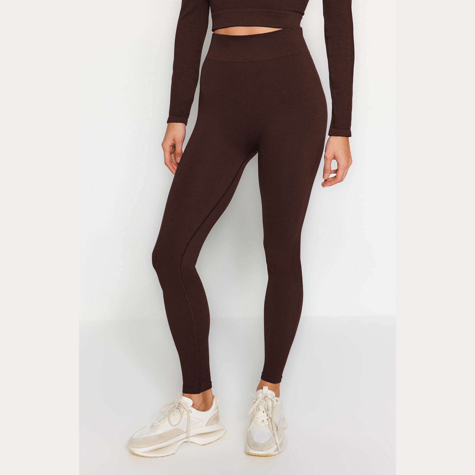 بنطال رياضي نسائي – بني داكن بدون خياطة وقصة ضيقة (تصميم مريح بطول كامل)