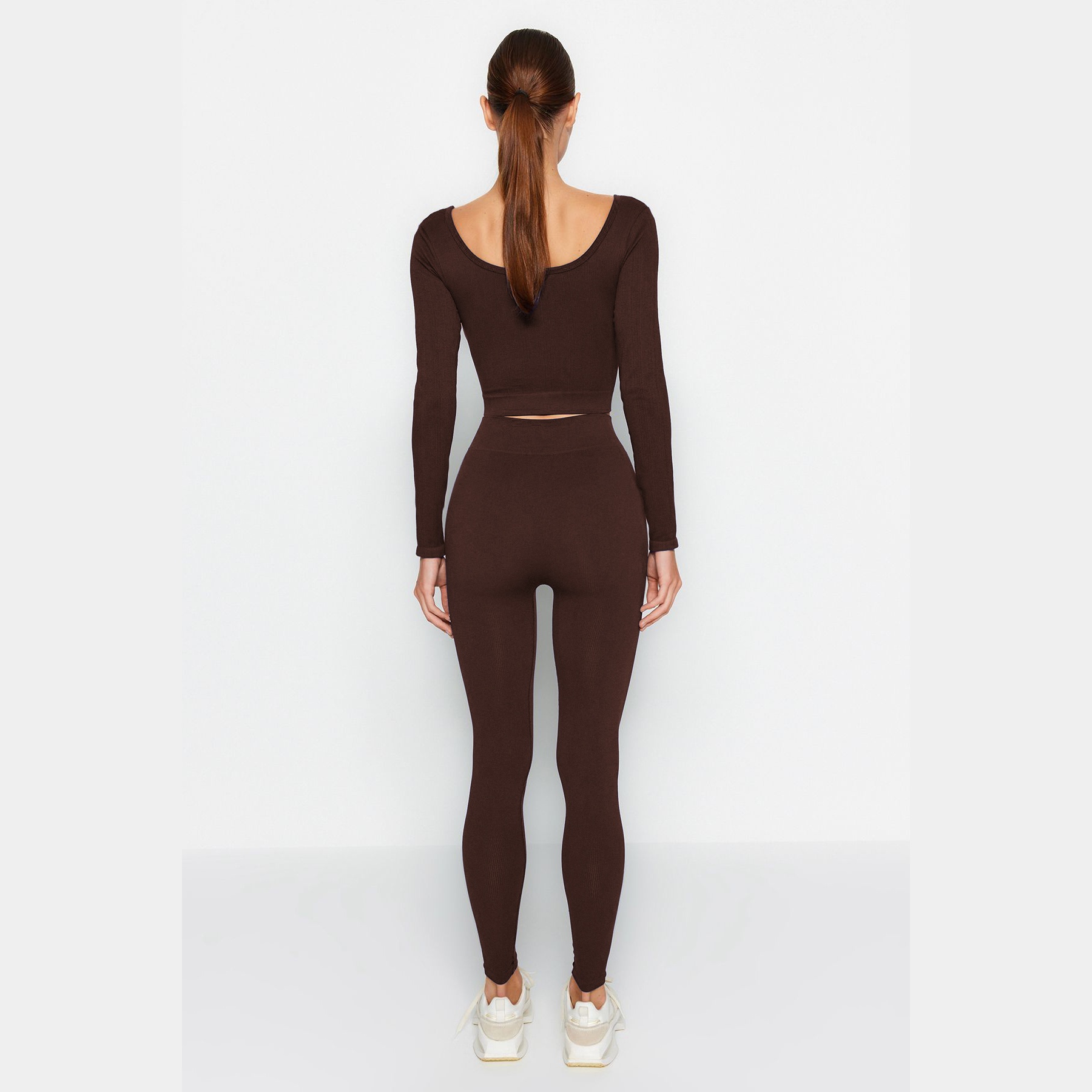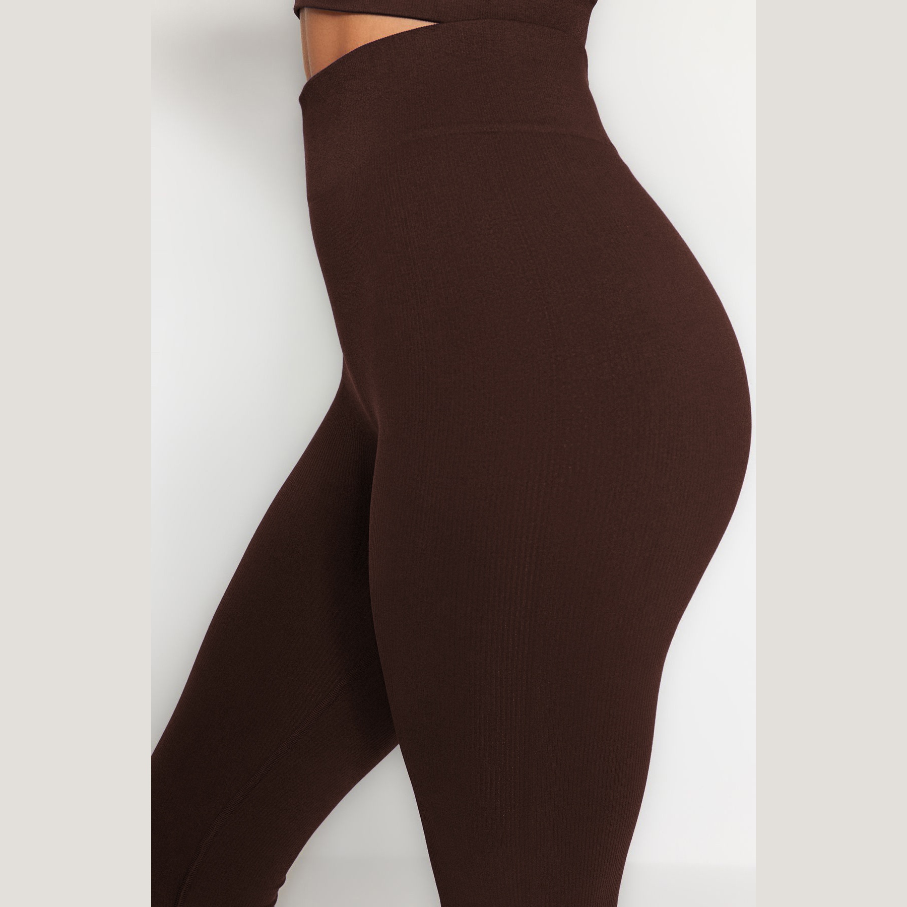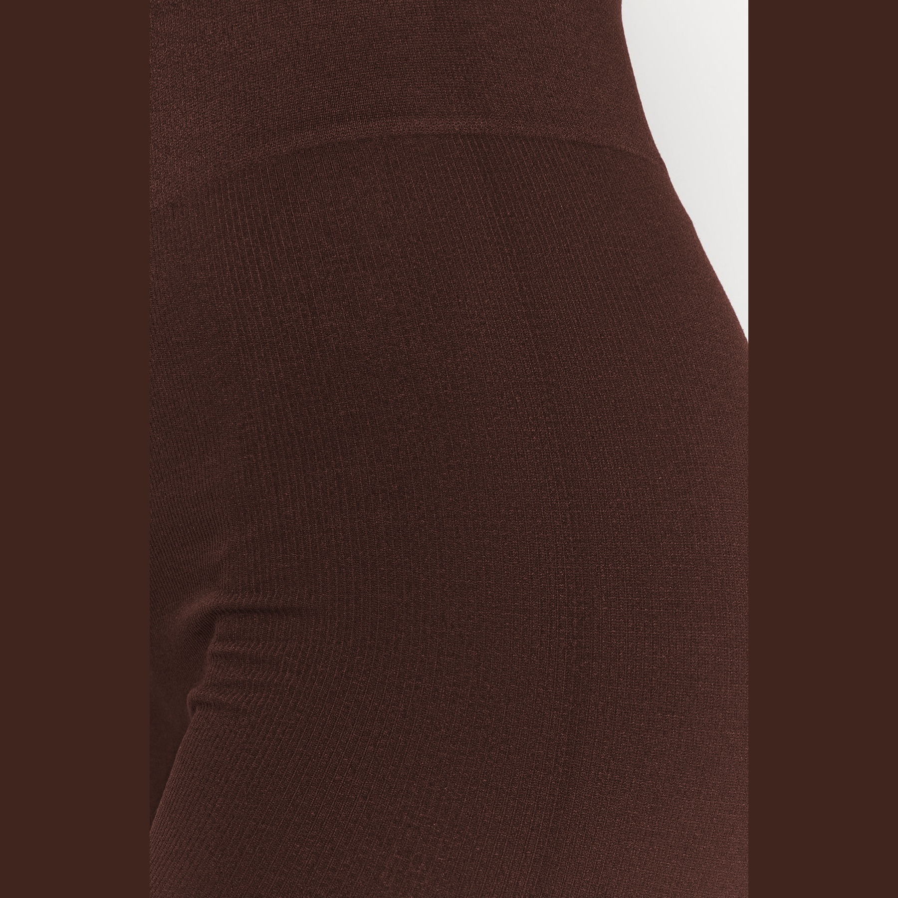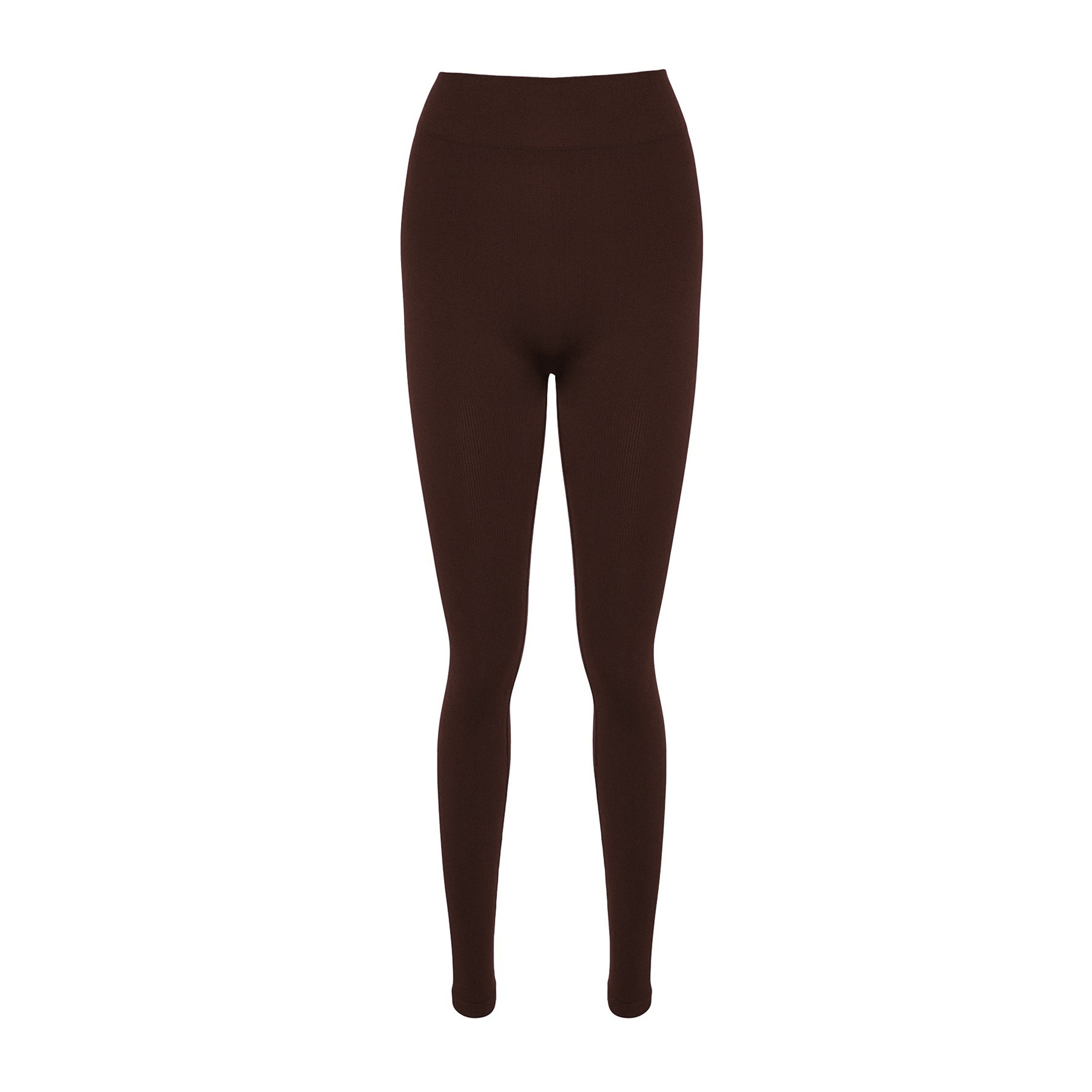 بنطال رياضي نسائي بلون بني داكن ، مصنوع من خامة تريكو مطاطية بنسيج Seamless بدون خياطة، يمنح راحة فائقة ومرونة أثناء الحركة، يتميز بطول كامل، خصر مرتفع، وقصة ضيقة. تصميم مثالي للتمارين أو الإطلالات اليومية المحتشمة.