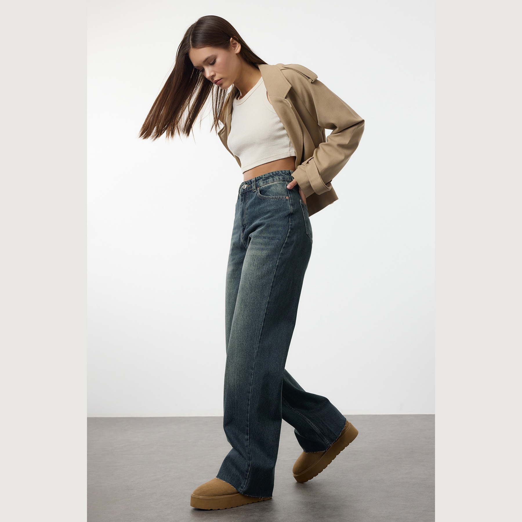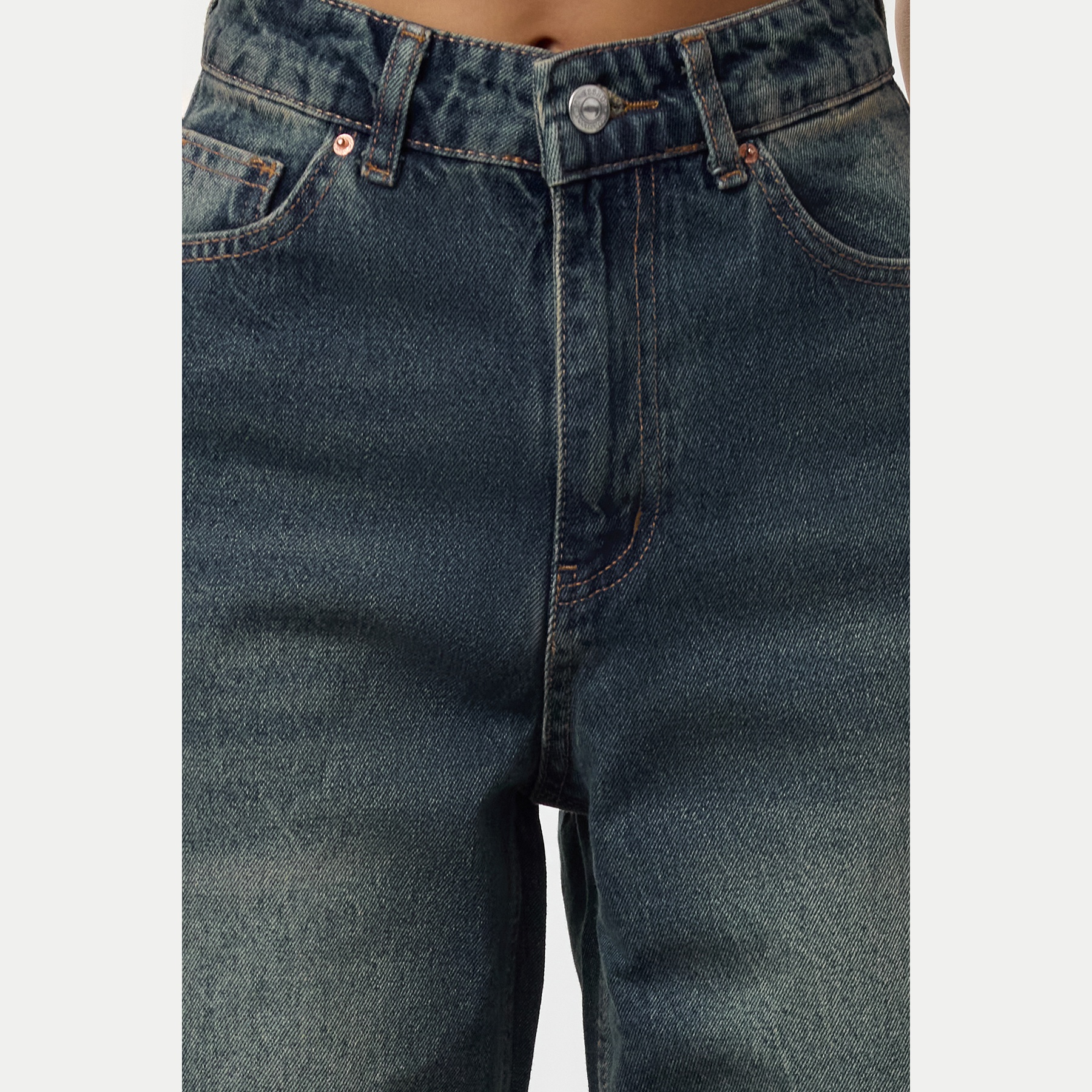 - الخصائص الإضافية: تأثير باهت "Vintage" – حافة مقصوصة – قصة مستقيمة – خصر مرتفع – إغلاق بزر وسحاب
