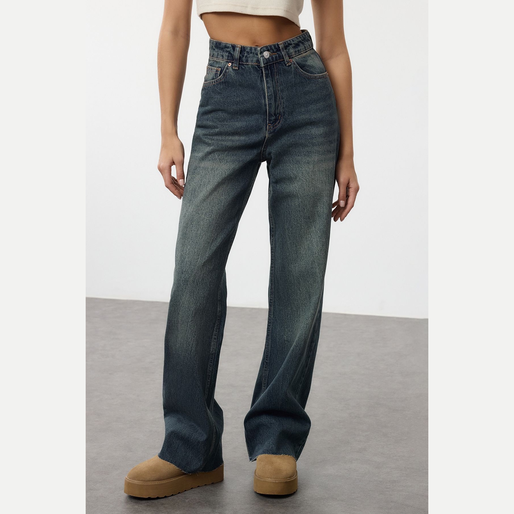 جينز نسائي – أزرق بتأثير باهت وحافة مقصوصة (قصة مستقيمة بخصر مرتفع)