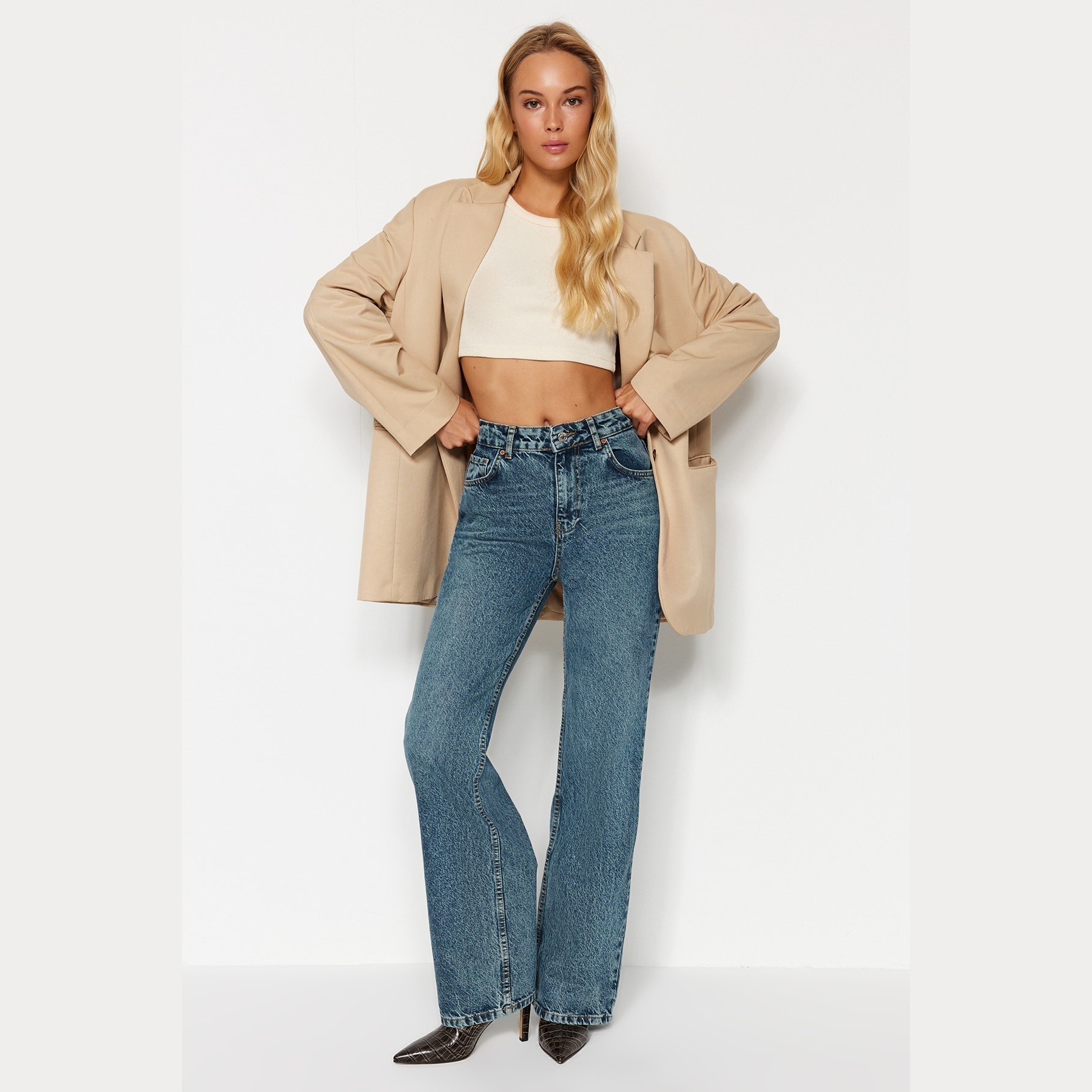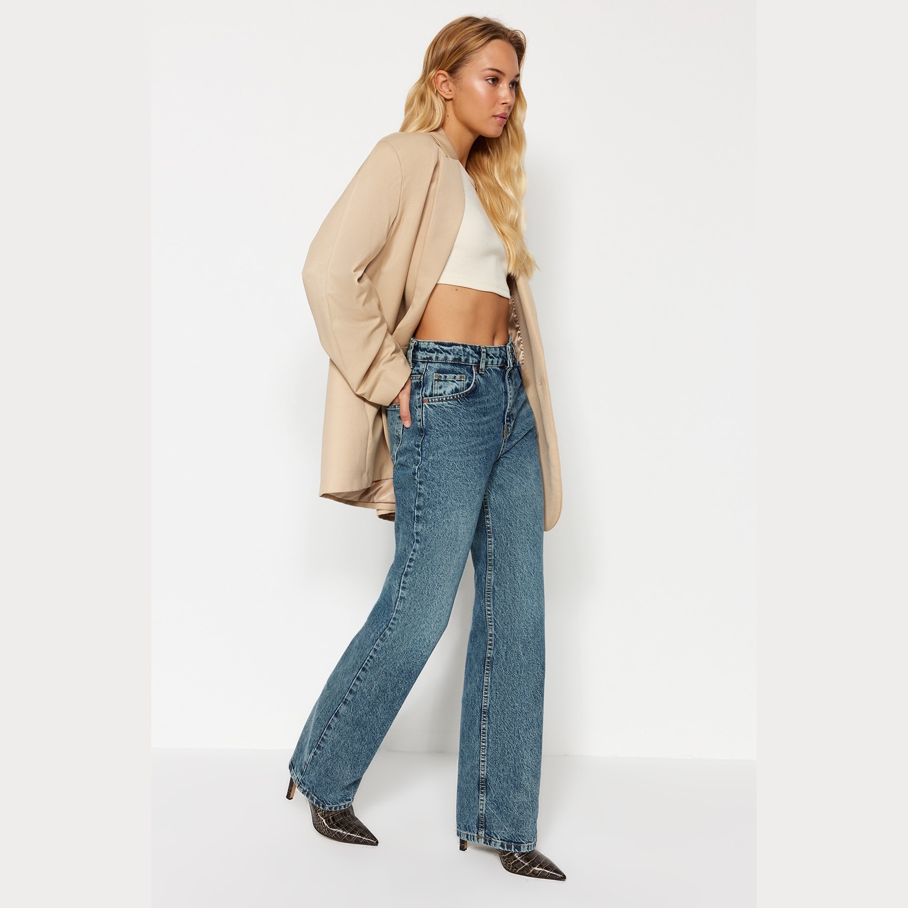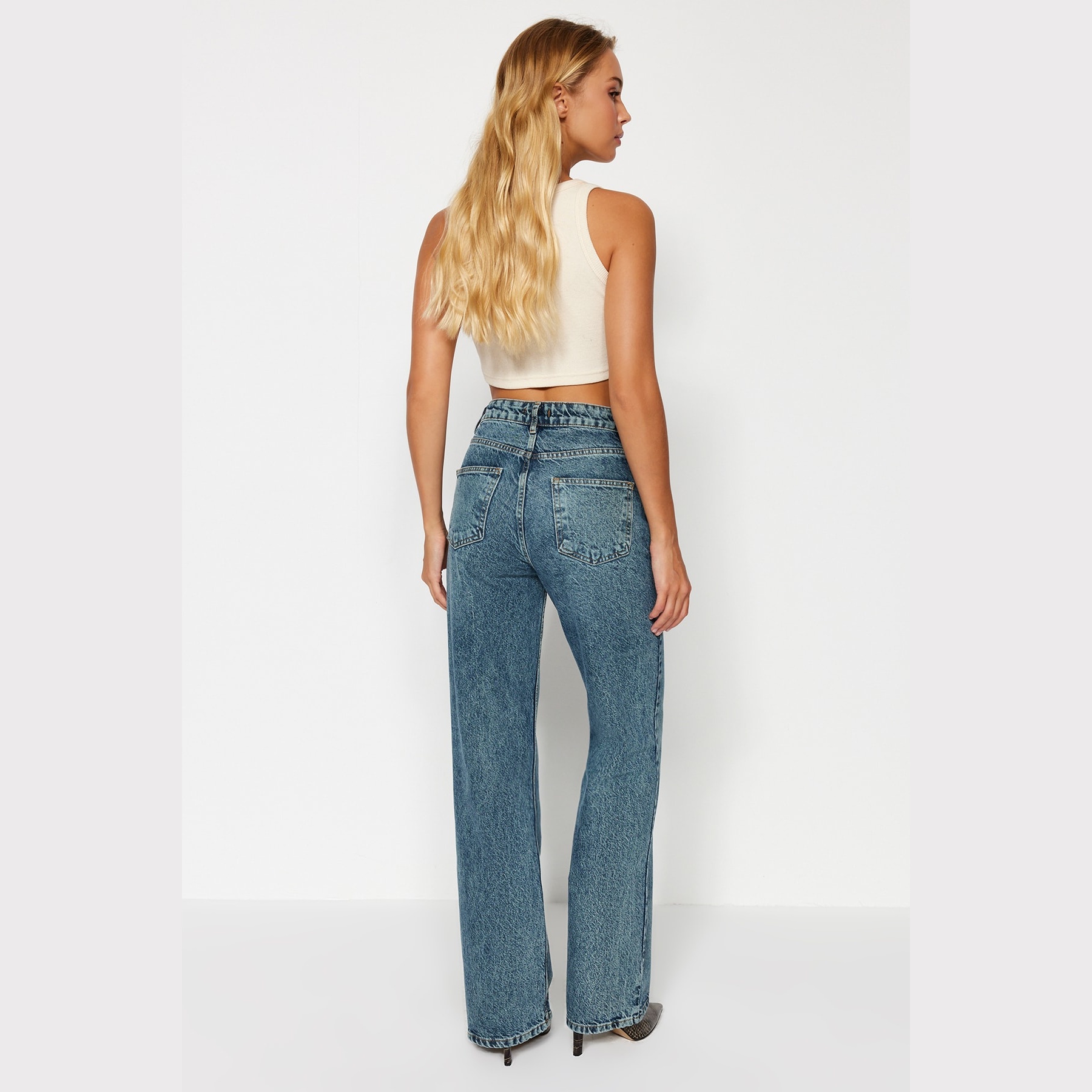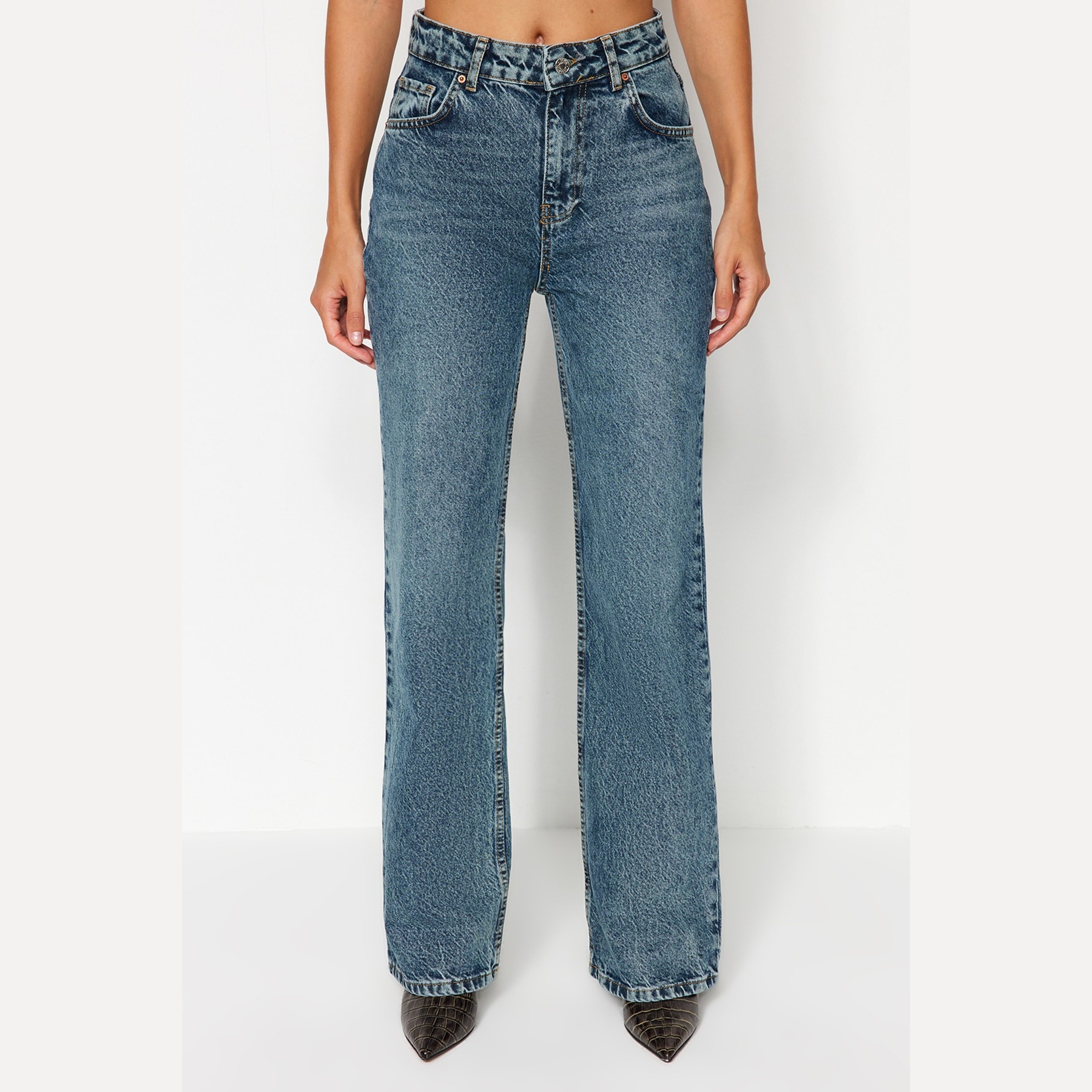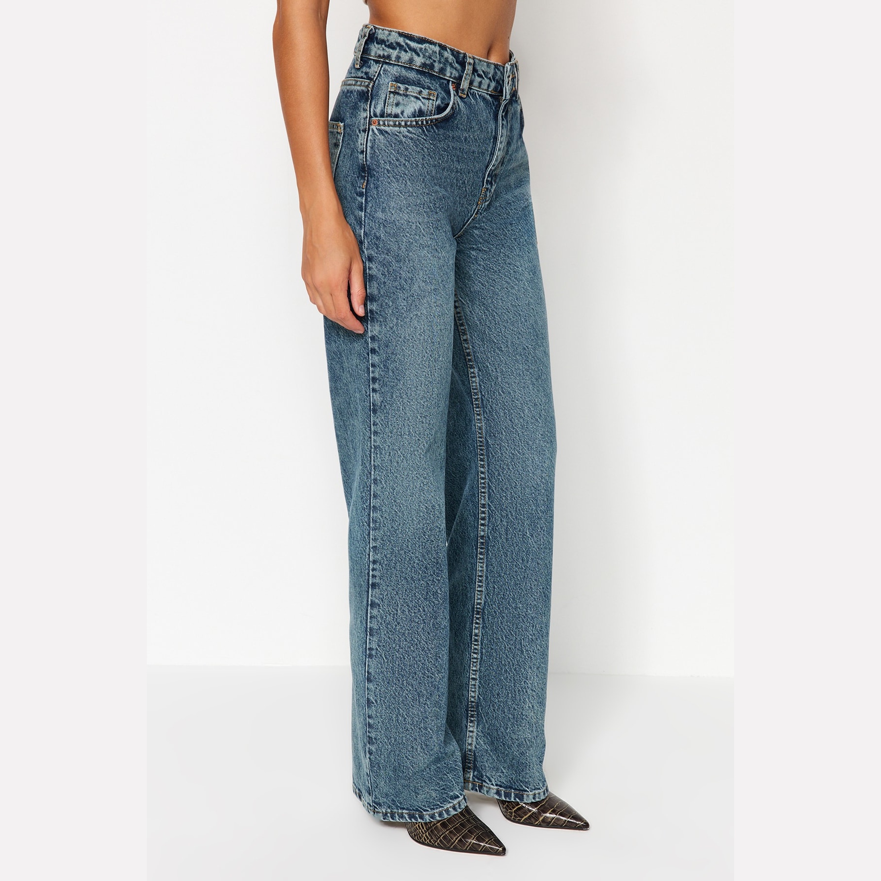 جينز نسائي بلون أزرق باهت بتأثير Vintage (Mavi Soluk Efekt Vintage)، مصنوع من خامة دنيم 100% قطن، يتميز بخصر مرتفع، قصة واسعة (Wide Leg)، وإغلاق بزر وسحاب. تصميم عملي وأنيق يناسب الإطلالات اليومية الكاجوال مع لمسة كلاسيكية.