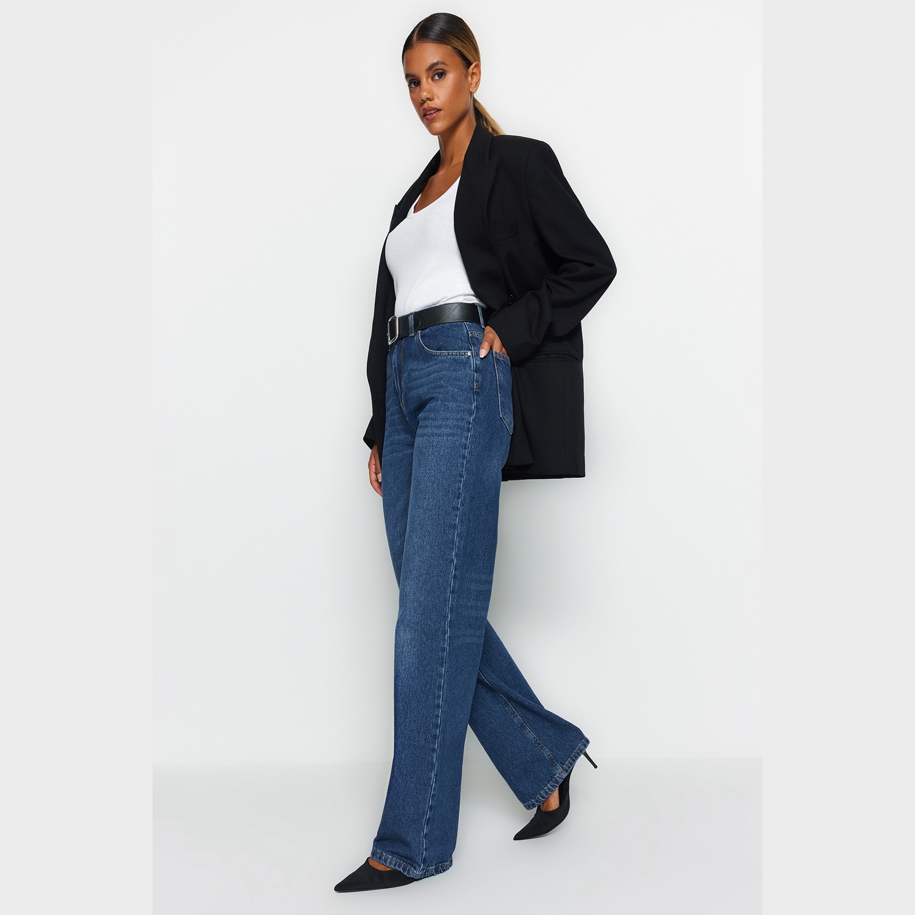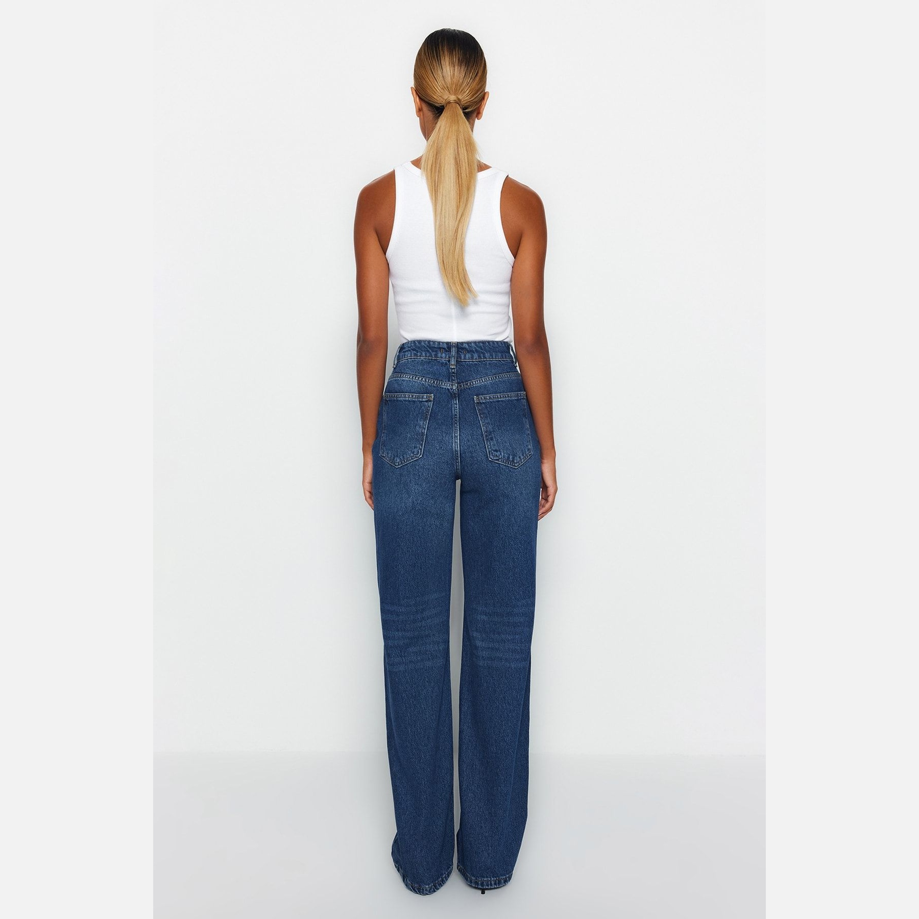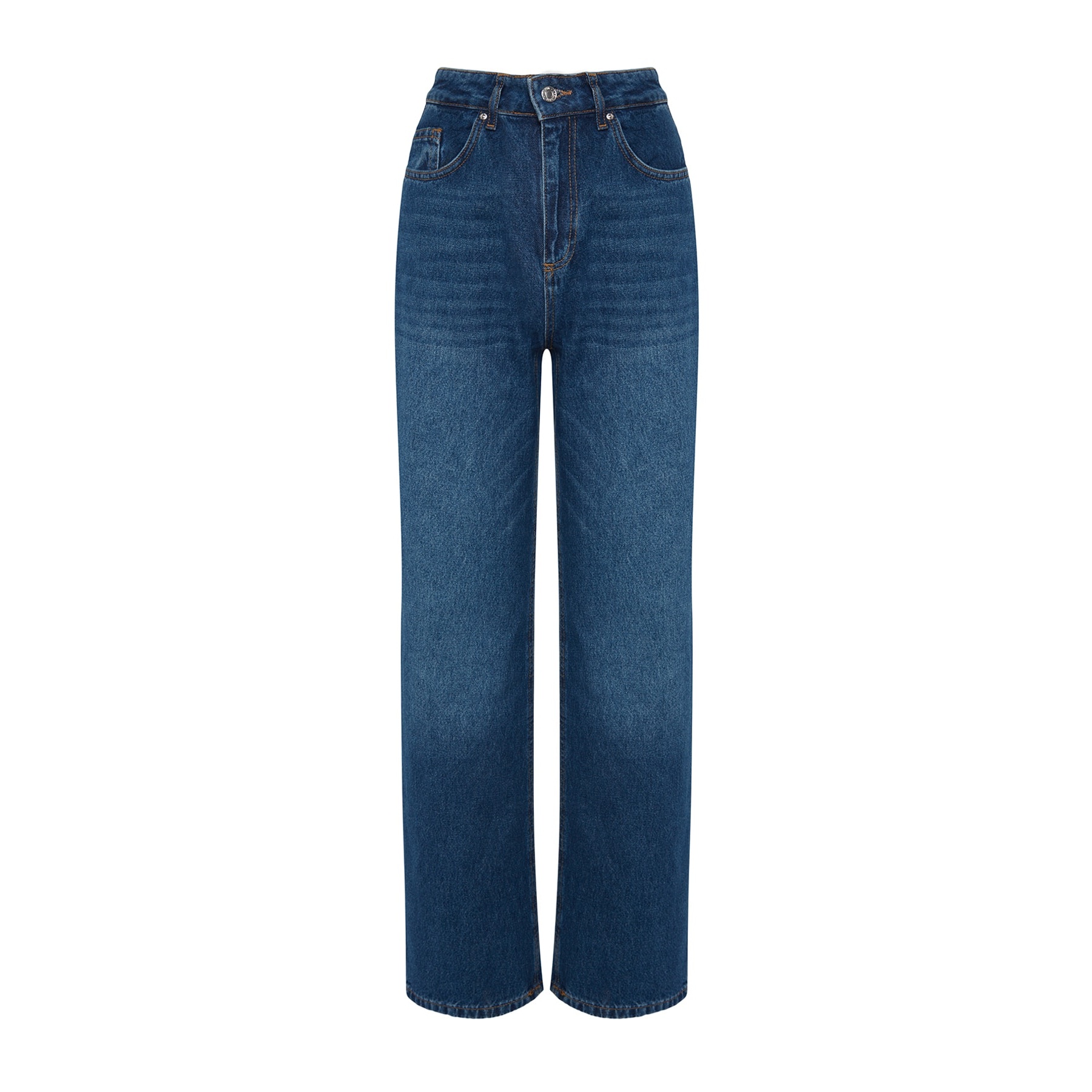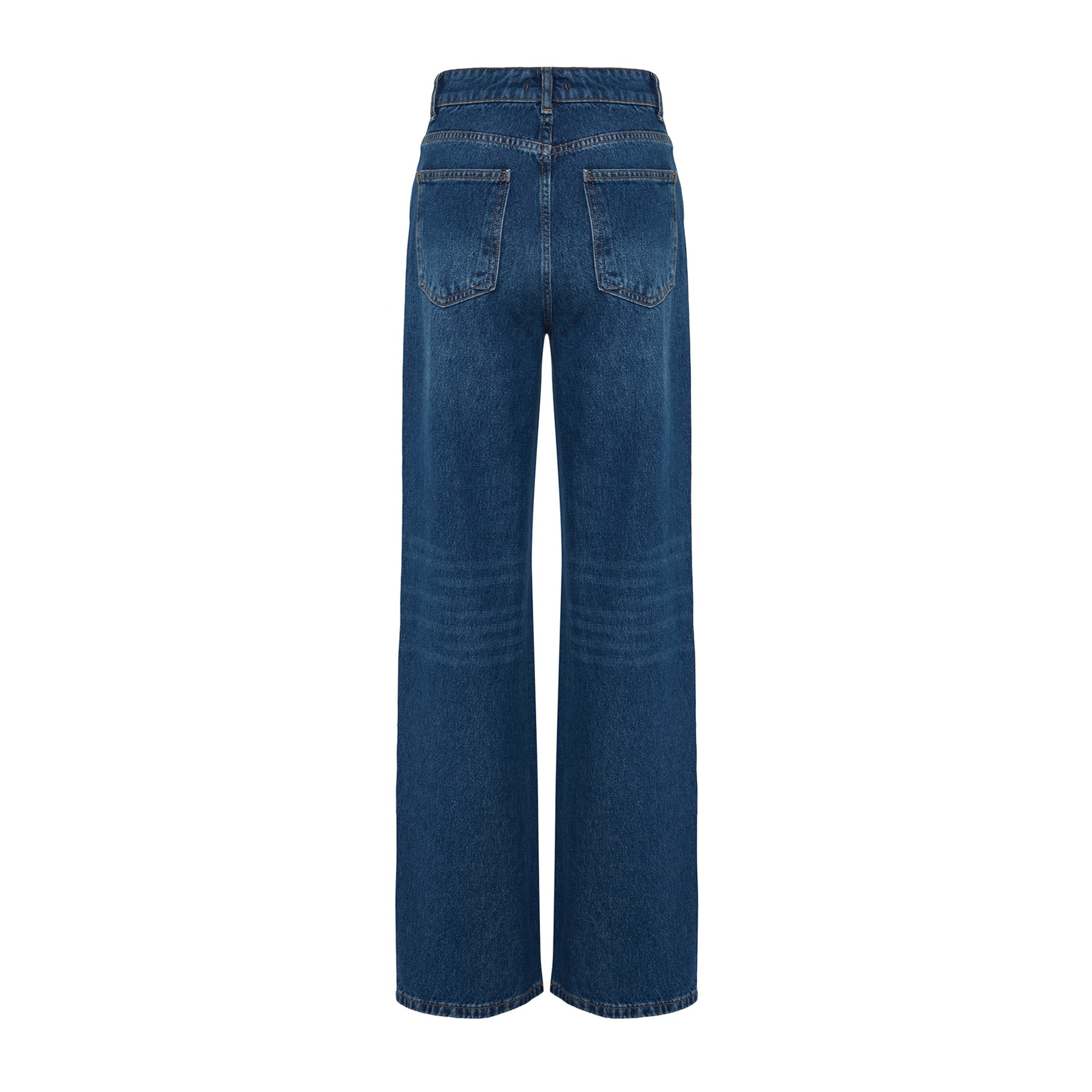 جينز نسائي بلون كُحلي داكن (Koyu Mavi)، مصنوع من خامة دنيم 100% قطن، يتميز بخصر مرتفع، قصة واسعة (Wide Leg)، وإغلاق بزر وسحاب. تصميم عملي وأنيق يناسب الإطلالات اليومية الكاجوال مع لمسة كلاسيكية.