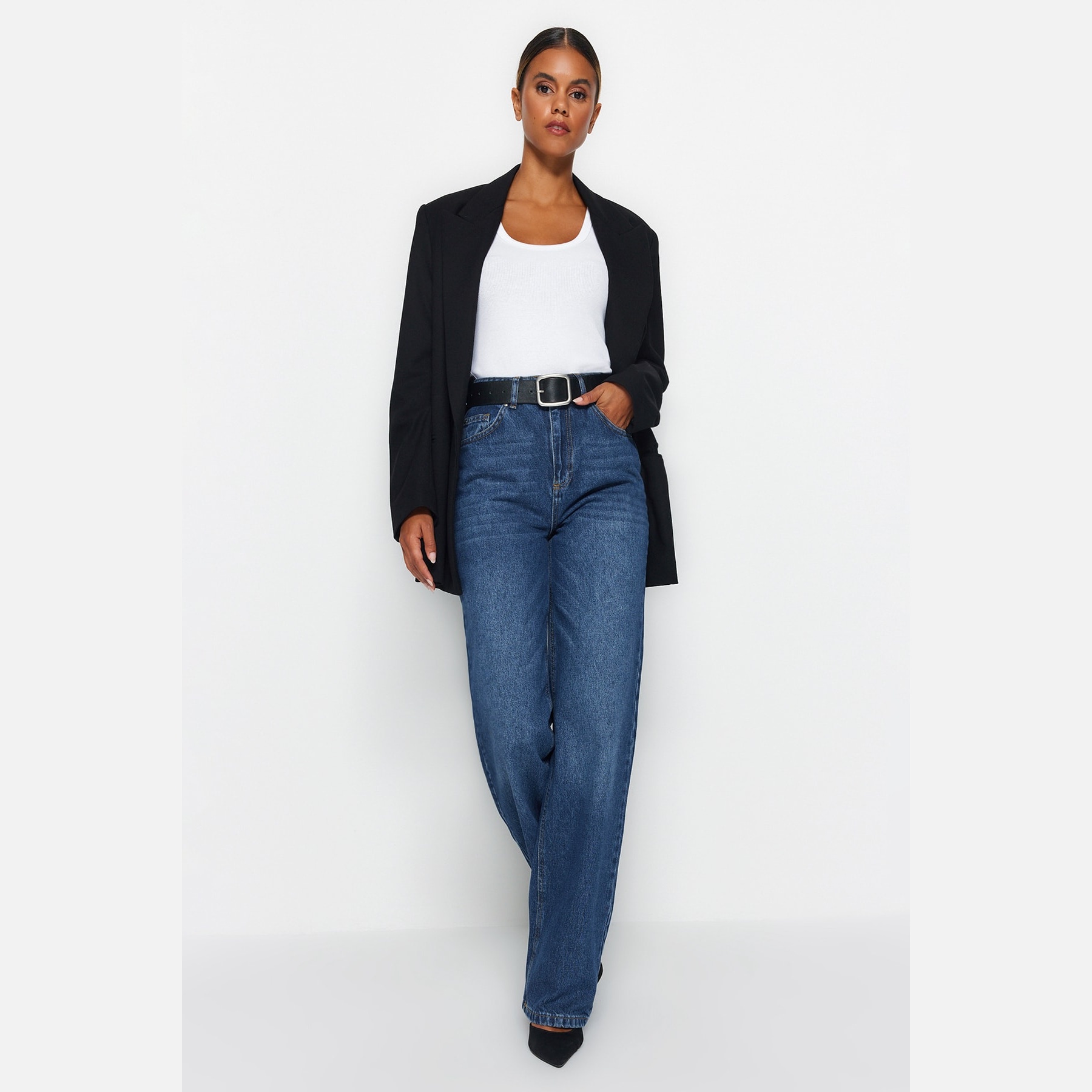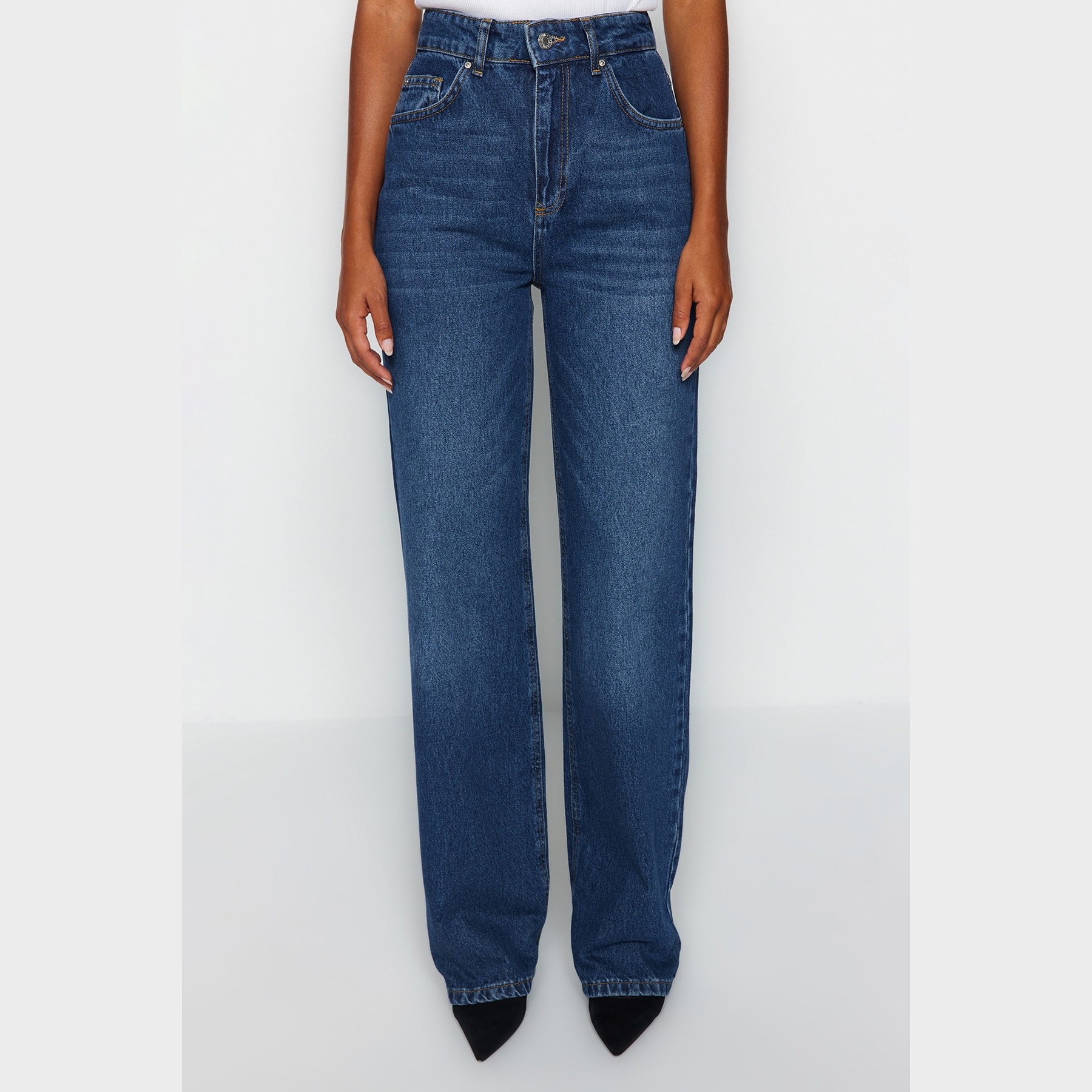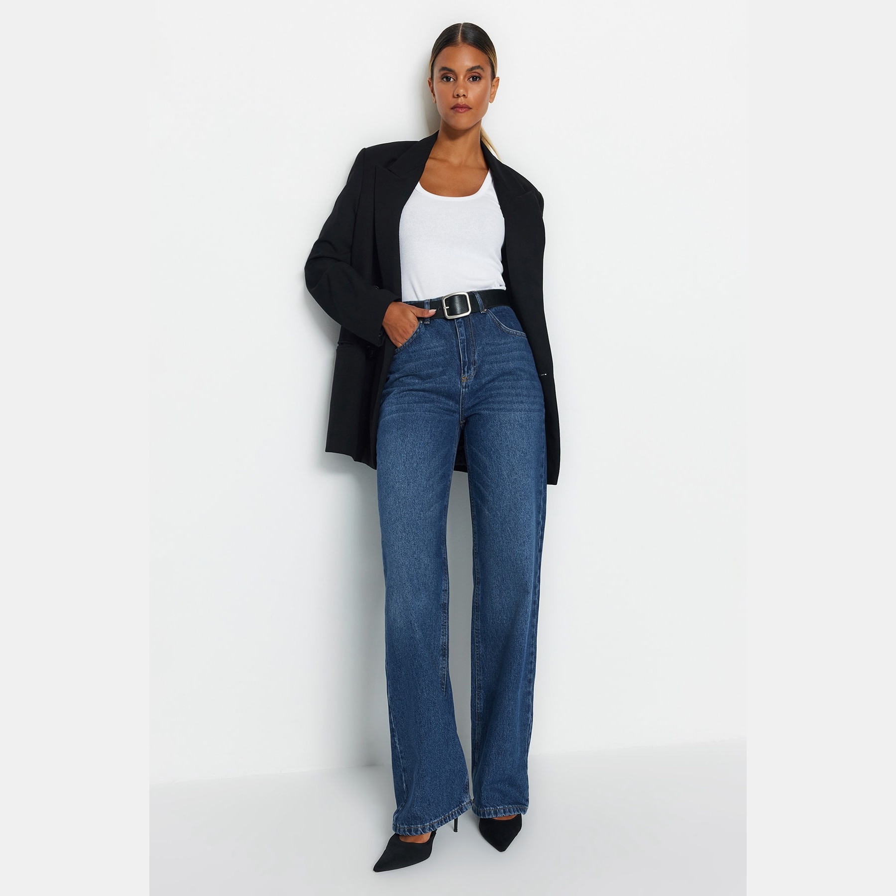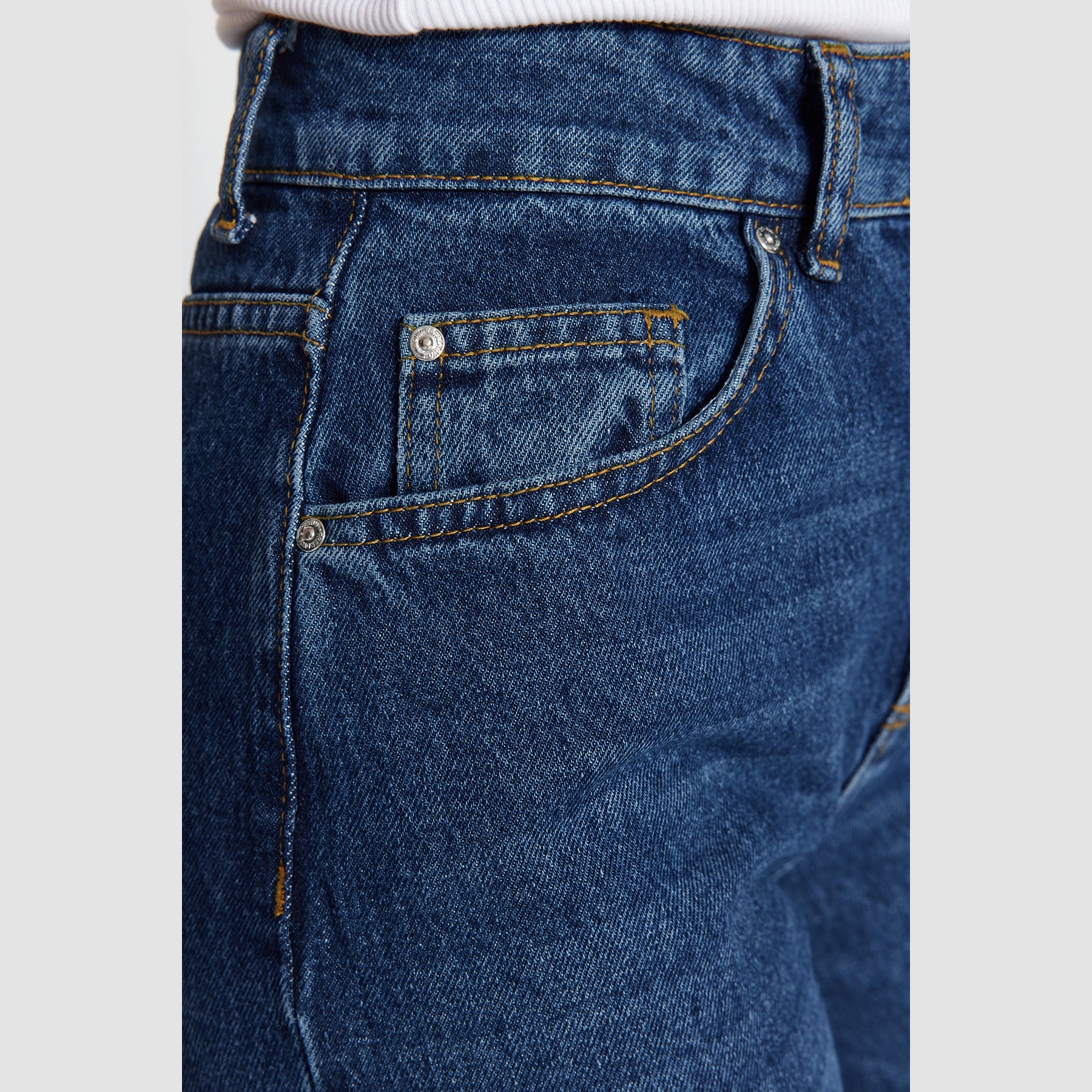 جينز نسائي بلون كُحلي داكن (Koyu Mavi)، مصنوع من خامة دنيم 100% قطن، يتميز بخصر مرتفع، قصة واسعة (Wide Leg)، وإغلاق بزر وسحاب. تصميم عملي وأنيق يناسب الإطلالات اليومية الكاجوال مع لمسة كلاسيكية.