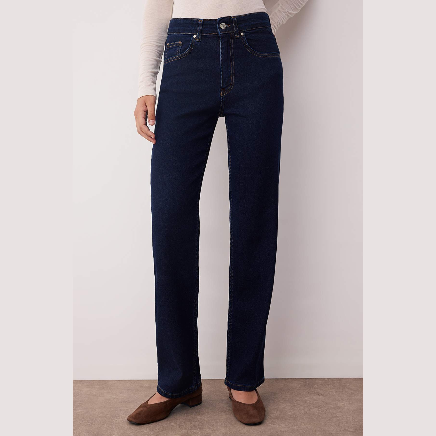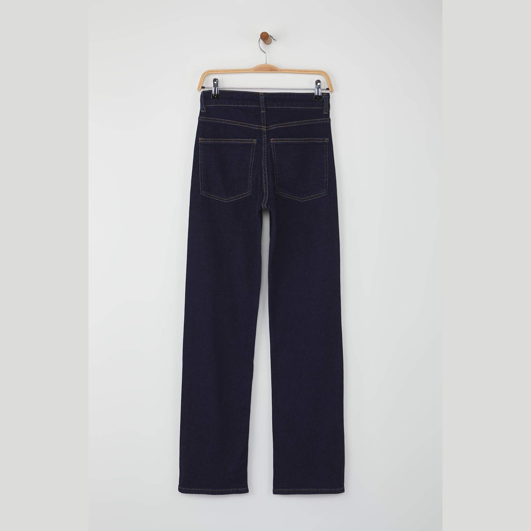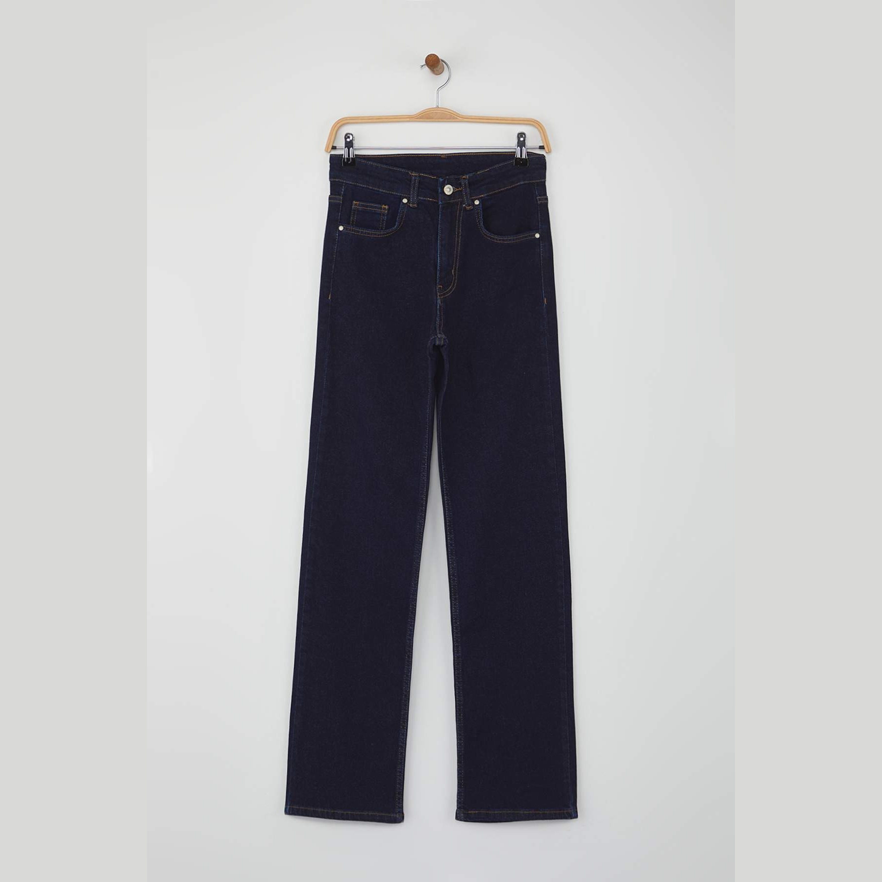 جينز نسائي بلون كُحلي داكن (Koyu Mavi)، مصنوع من خامة دنيم مرنة بنسبة 99% قطن و1% إيلاستان، يتميز بخصر عادي، قصة مستقيمة ومريحة (Comfort Straight)، وإغلاق بزر وسحاب. تصميم عملي يناسب الاستخدام اليومي ويوفر راحة في الحركة.