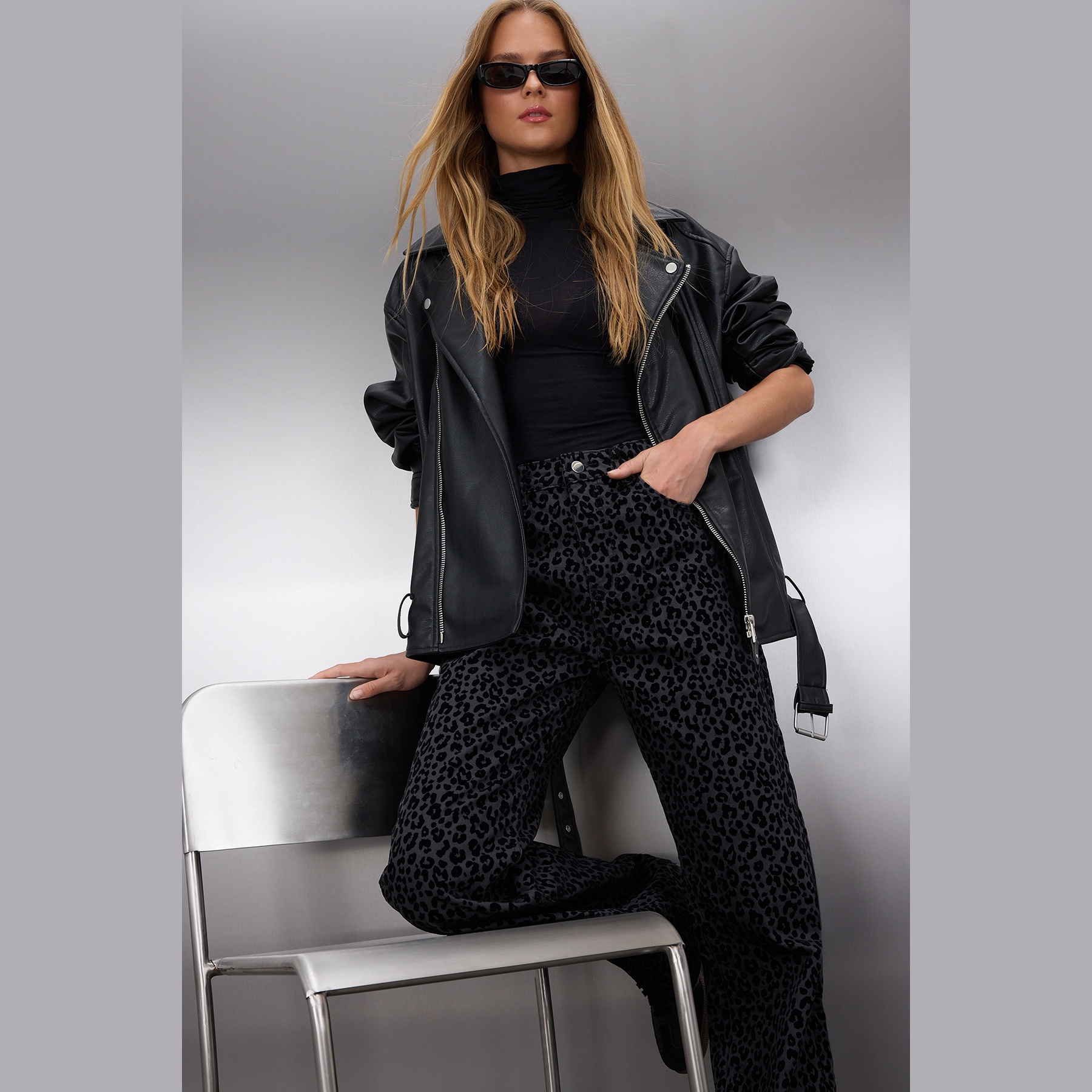 جينز نسائي بلون أسود بلمسة شامواه (Siyah Süet Görünümlü)، مزين بنقشة ليوبارد، مصنوع من خامة دنيم 100% قطن، يتميز بخصر مرتفع، قصة واسعة (Wide Leg)، وإغلاق بزر وسحاب. تصميم جريء وأنيق يمنحك إطلالة عصرية مميزة.