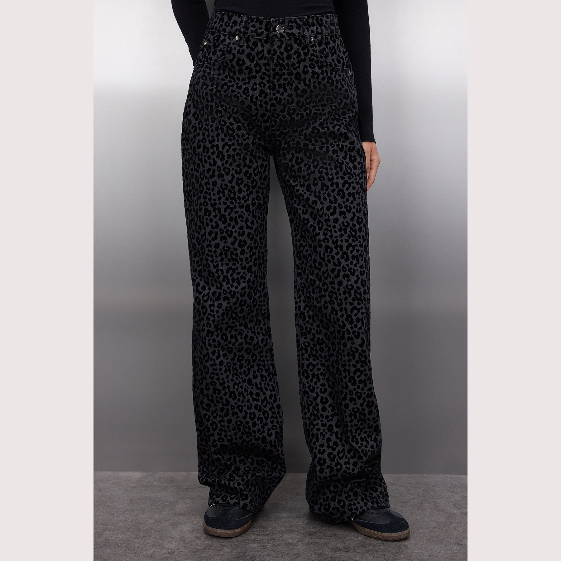 جينز نسائي – أسود بلمسة شامواه ونقشة ليوبارد (Wide Leg بخصر مرتفع)